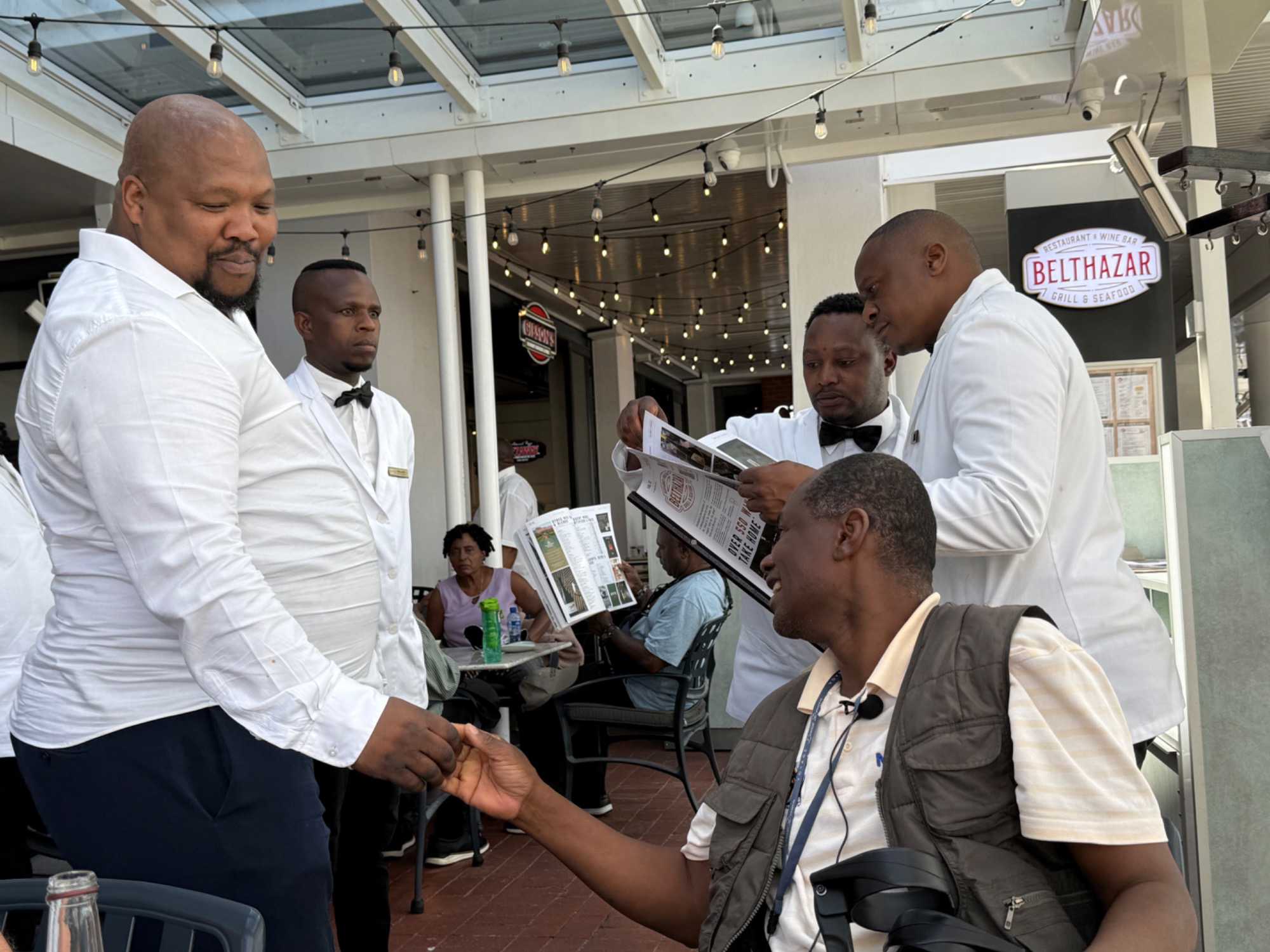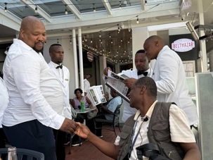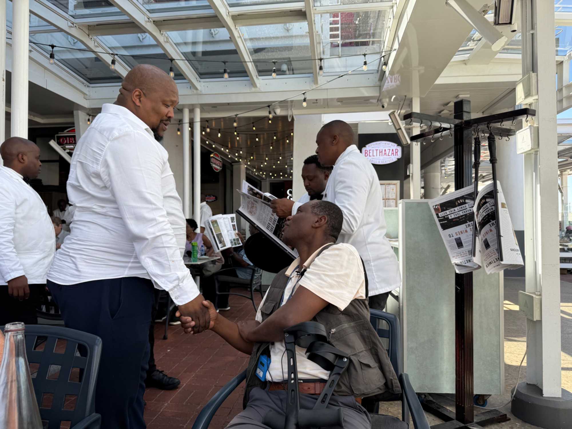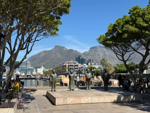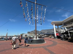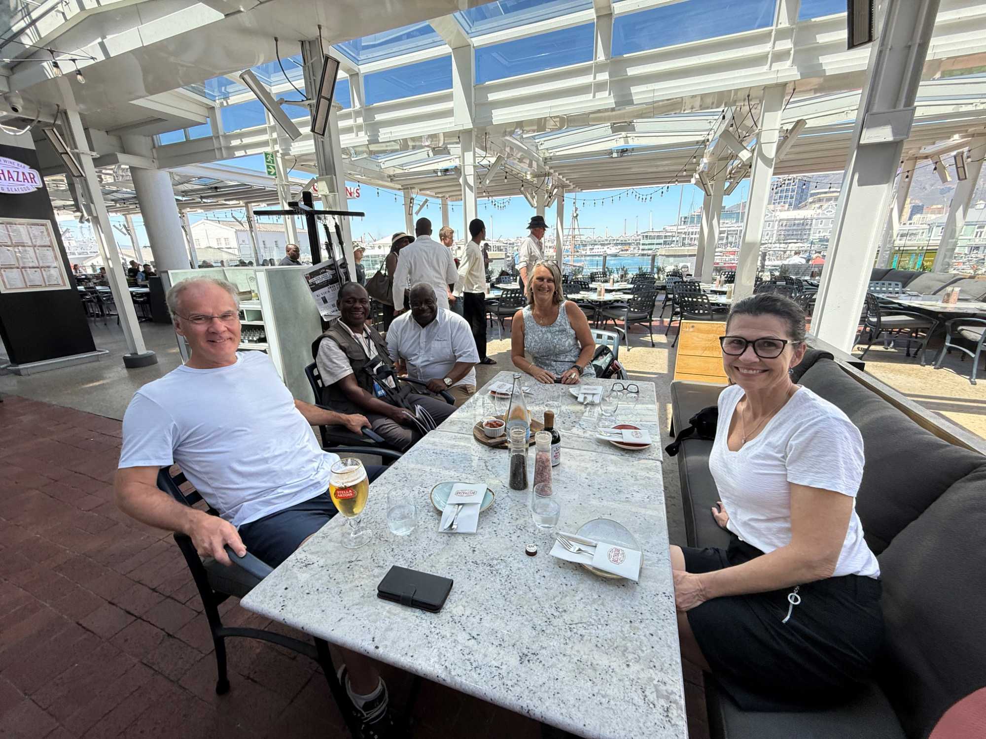 En fin de matinée, nous avons quitté le jardin pour nous diriger vers le V&A Waterfront, un lieu que je connais bien et où j’ai déjà séjourné à plusieurs reprises. J’y ai vécu de très beaux moments lors de précédents voyages, mais cette fois, j’ai pu constater à quel point l’endroit a changé.Les constructions nouvelles et le nombre croissant de visiteurs ont transformé l’atmosphère. L’endroit demeure superbe et vibrant, mais il a perdu un peu du calme et du charme tranquille que j’y appréciais tant. C’est d’ailleurs pour cette raison que j’ai préféré revenir à mon ancien hôtel, un lieu magnifique où règnent encore la quiétude et l’élégance que j’aime tant retrouver. Nous étions attendus pour un dîner privé au restaurant Belthazar, situé directement sur le port. C’est un établissement renommé pour sa cuisine raffinée, son service attentionné et sa vue spectaculaire sur la baie, les yachts et la montagne de la Table. Le repas fut un véritable festin : viandes tendres, fruits de mer savoureux, vins d’exception, le tout servi dans une ambiance conviviale et joyeuse. Nous avons savouré chaque bouchée dans la bonne humeur et les rires partagés. Après ce excellent repas, nous avons eu un peu de temps libre pour profiter du Waterfront. Certains en ont profité pour magasiner, d’autres pour flâner le long des quais et admirer les voiliers. Le temps a semblé trop court pour les amateurs de boutiques, mais la promenade fut très agréable. Nous avons ensuite repris la route vers notre hôtel, heureux de cette belle journée et prêts à nous détendre.