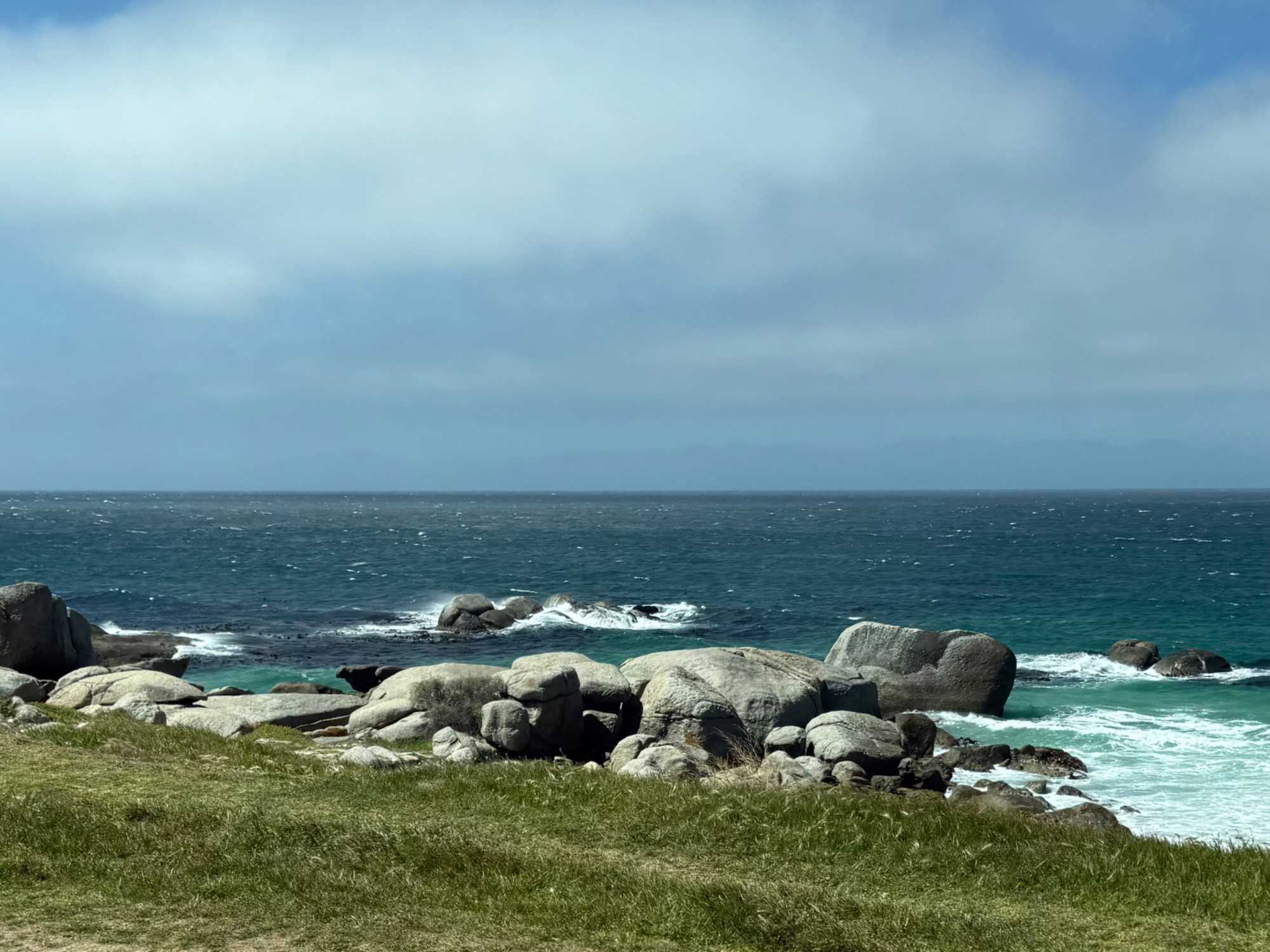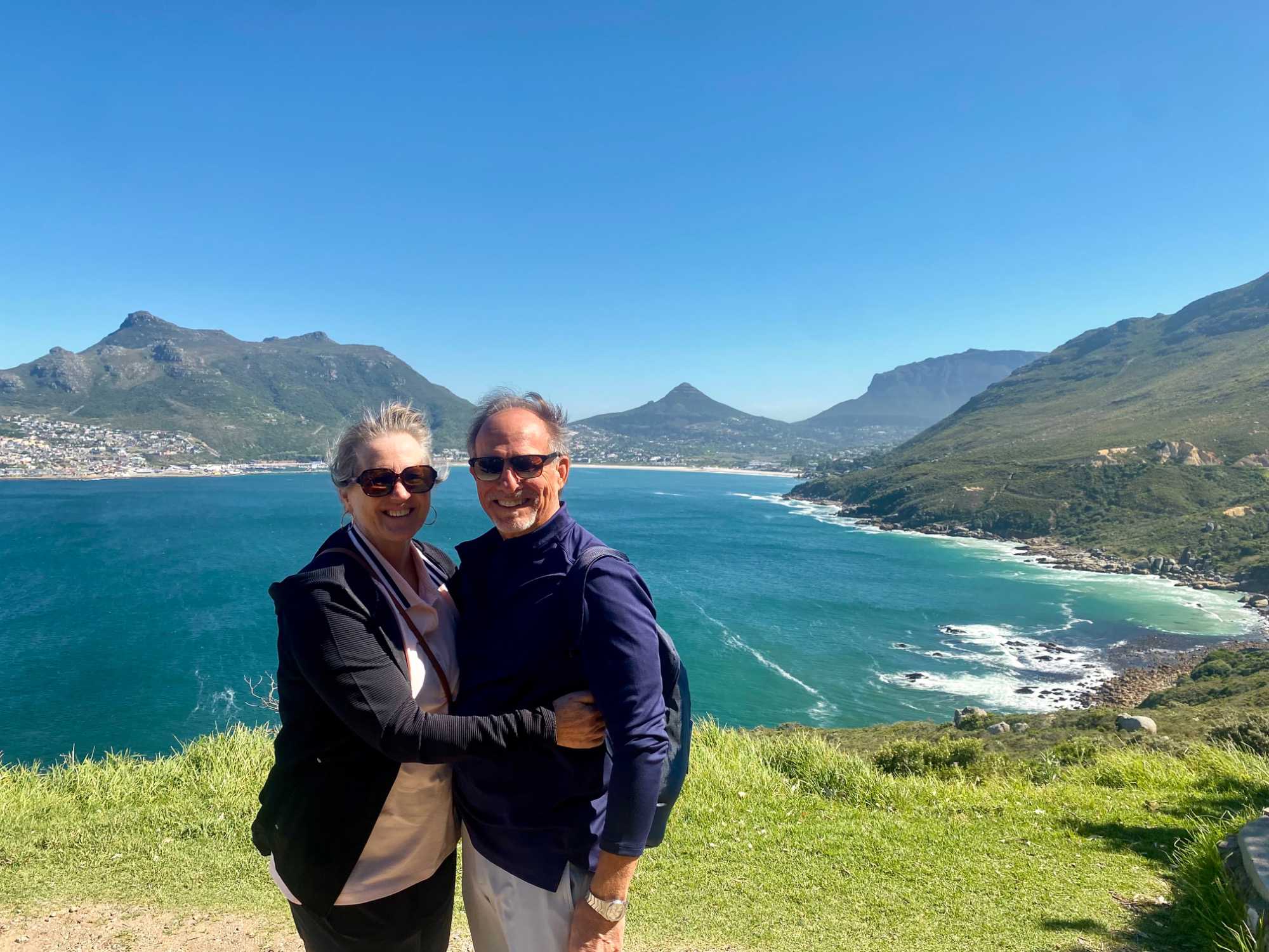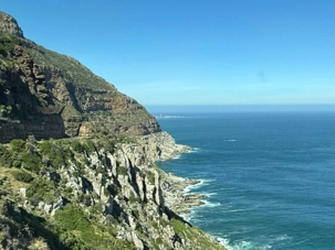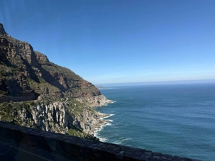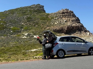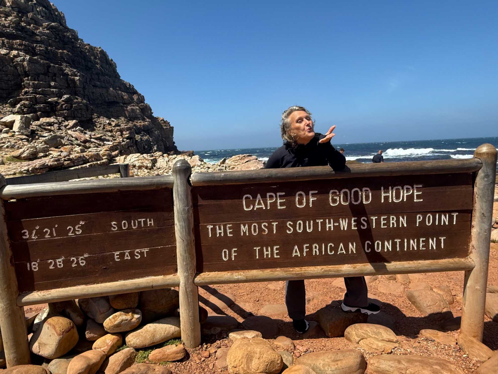 Ce matin encore, nous nous sommes levés sous un magnifique ciel bleu, baignés par un soleil éclatant qui semblait nous promettre une autre journée de rêve au bout du continent africain. Les nuits de pleine lune, claires comme des tableaux d’argent, rendent l’atmosphère presque féérique. Après un excellent petit-déjeuner, nous avons retrouvé nos amis voyageurs, tous de bonne humeur, prêts pour une journée d’expédition le long de la spectaculaire route panoramique de Chapman’s Peak, en direction du mythique Cap de Bonne-Espérance. L’ambiance du groupe était, comme toujours, joyeuse et enthousiaste. Après une superbe soirée la veille, marquée par un excellent repas et des échanges chaleureux, nous avons pris la route un peu plus tard que d’habitude, à 9 h. Deux de nos charmants voyageurs, nos « amoureux », Carolina et Raymondo, avaient simplement oublié de se lever, mais ils ont été très rapides et nous sommes partis dans la bonne humeur générale.