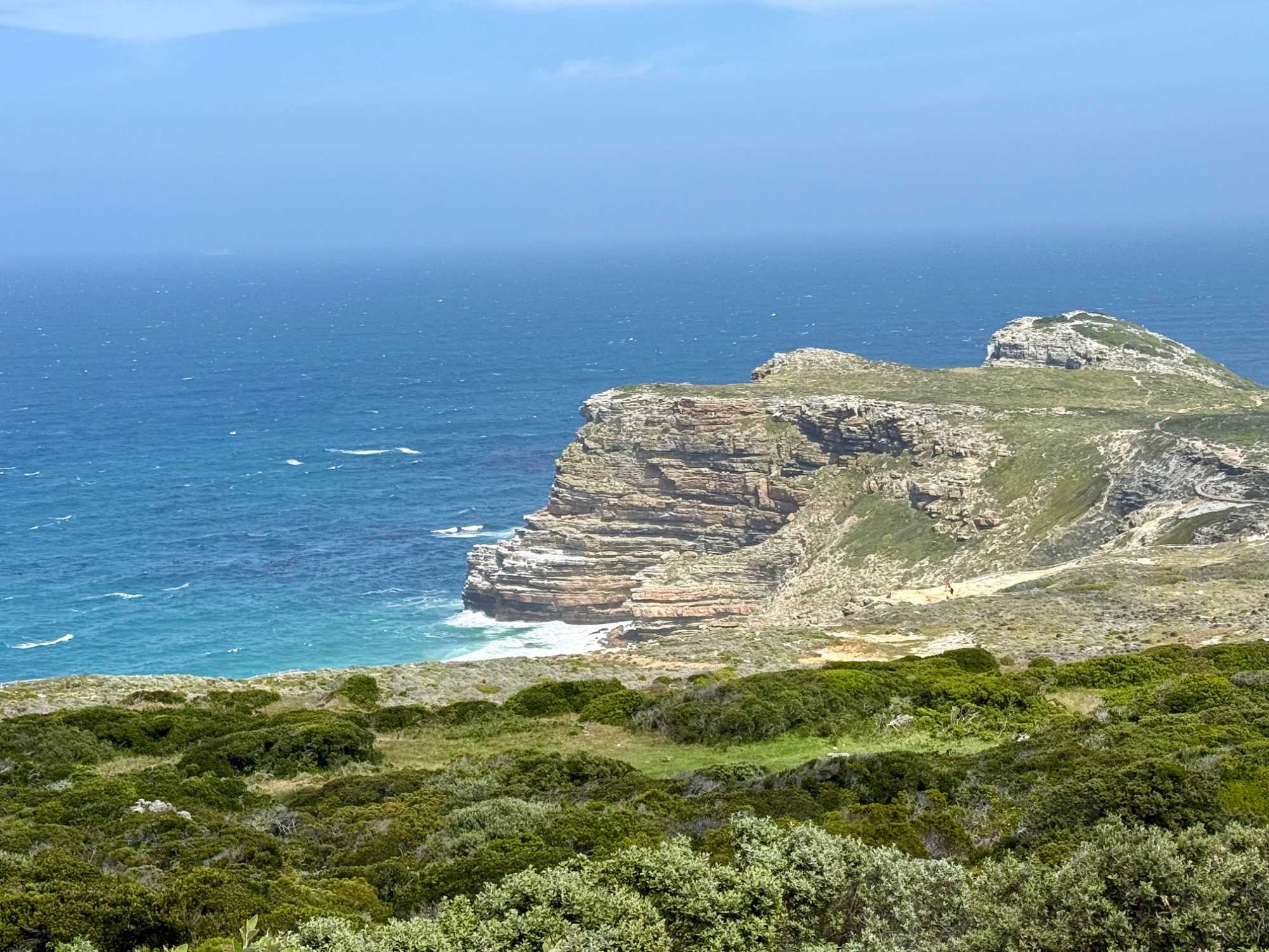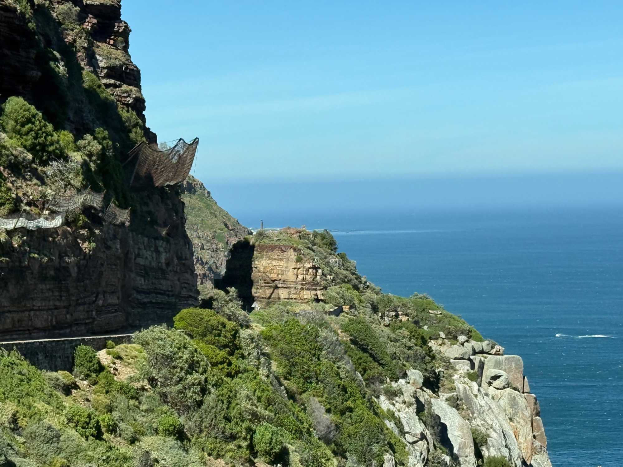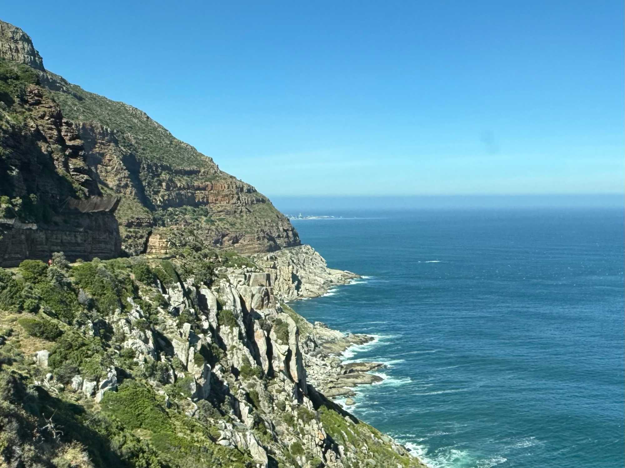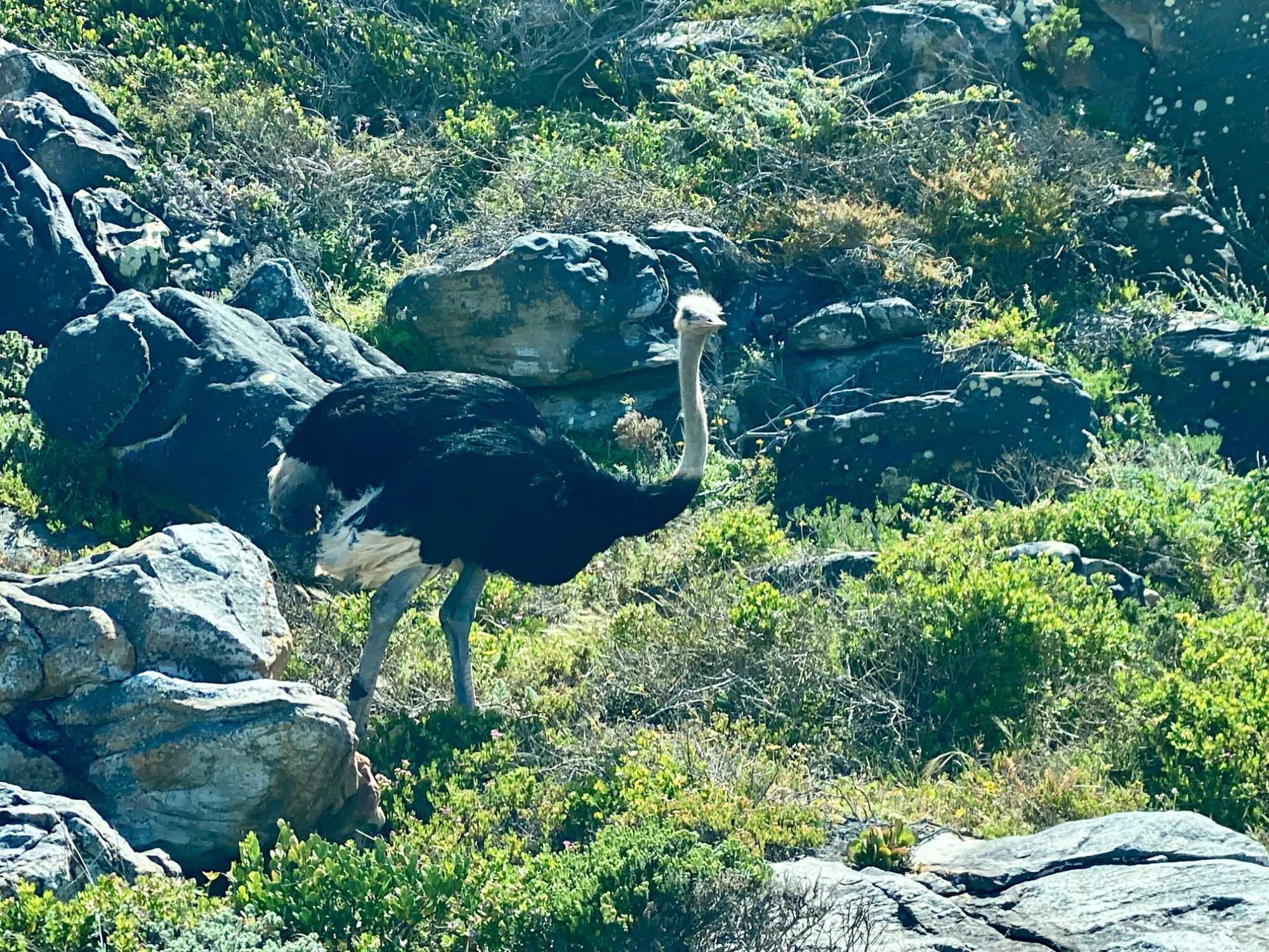 Nous avons ensuite rejoint la réserve naturelle du Cap de Bonne-Espérance, un site emblématique couvrant près de 7 700 km² et abritant une faune et une flore d’une richesse exceptionnelle. On y trouve plus de 250 espèces d’oiseaux, ainsi que des antilopes, zèbres, autruches, babouins, et plus de 1 100 variétés de plantes indigènes, formant la végétation unique du fynbos, typique du Cap. Comme le funiculaire “Flying Dutchman”, qui mène au phare de Cape Point, ne fonctionnait pas aujourd’hui, certains de nos voyageurs les plus en forme ont décidé de gravir le sentier à pied pour atteindre les points de vue spectaculaires sur la péninsule. Les autres, plus tranquilles, ont profité de la vue depuis la base, admirant les deux océans — l’Indien et l’Atlantique — qui se rencontrent ici dans une danse majestueuse.