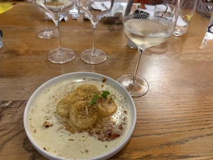 - un entrée délicate de gnocchis au trois fromages subtilement relevée,