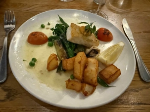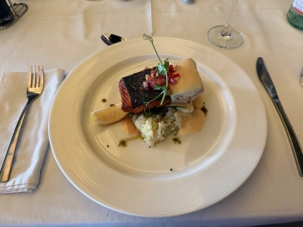 - Saumon norvégien (cuisson mi-saignante) – Servi sur un lit de pak-choï et de petites pommes de terre, nappé d’un beurre citronné et d’une salsa de saison.