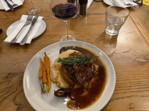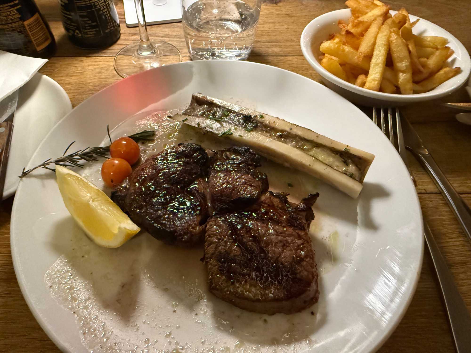 - Filet de bœuf (cuisson moyenne) – Filet de 300 g accompagné de pommes de terre au beurre et d’un jus corsé.