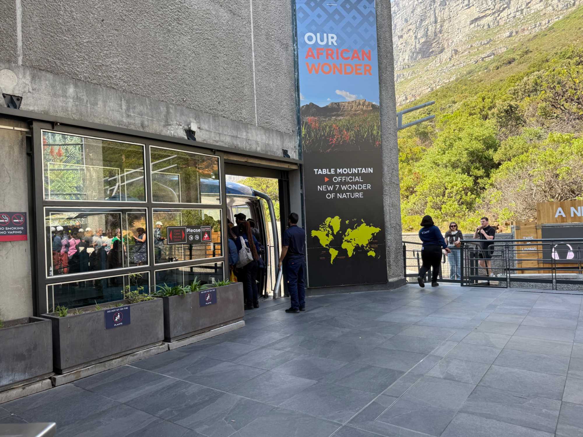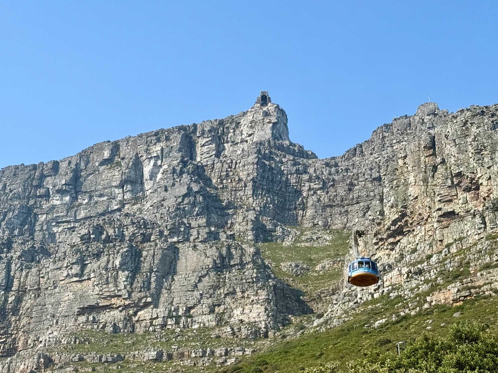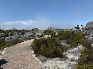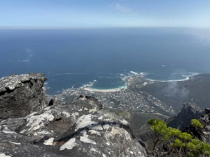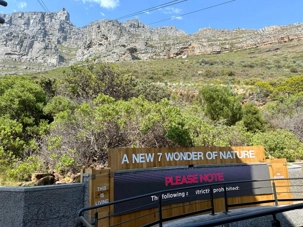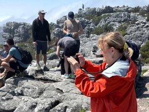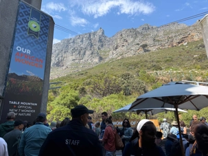 En arrivant au pied de la montagne, nous avons rejoint la file d’attente du téléphérique, d’environ 30 minutes, dans une atmosphère bon enfant. Le Table Mountain Aerial Cableway, inauguré en 1929, est un chef-d’œuvre d’ingénierie. Il effectue la montée en seulement 5 minutes, tandis que la cabine rotative à 360° permet à chacun de profiter d’une vue panoramique imprenable sur Le Cap, l’océan et la péninsule.