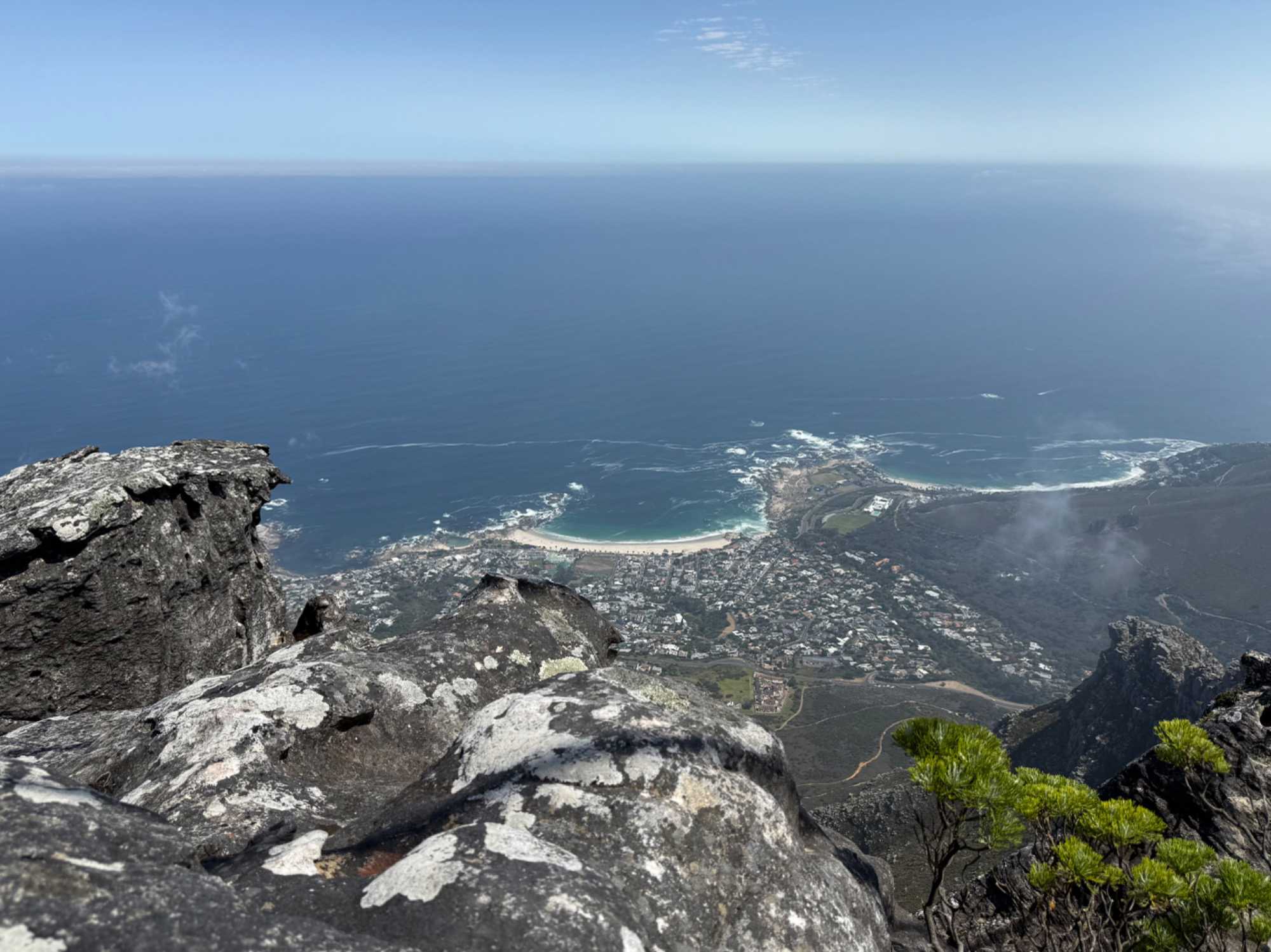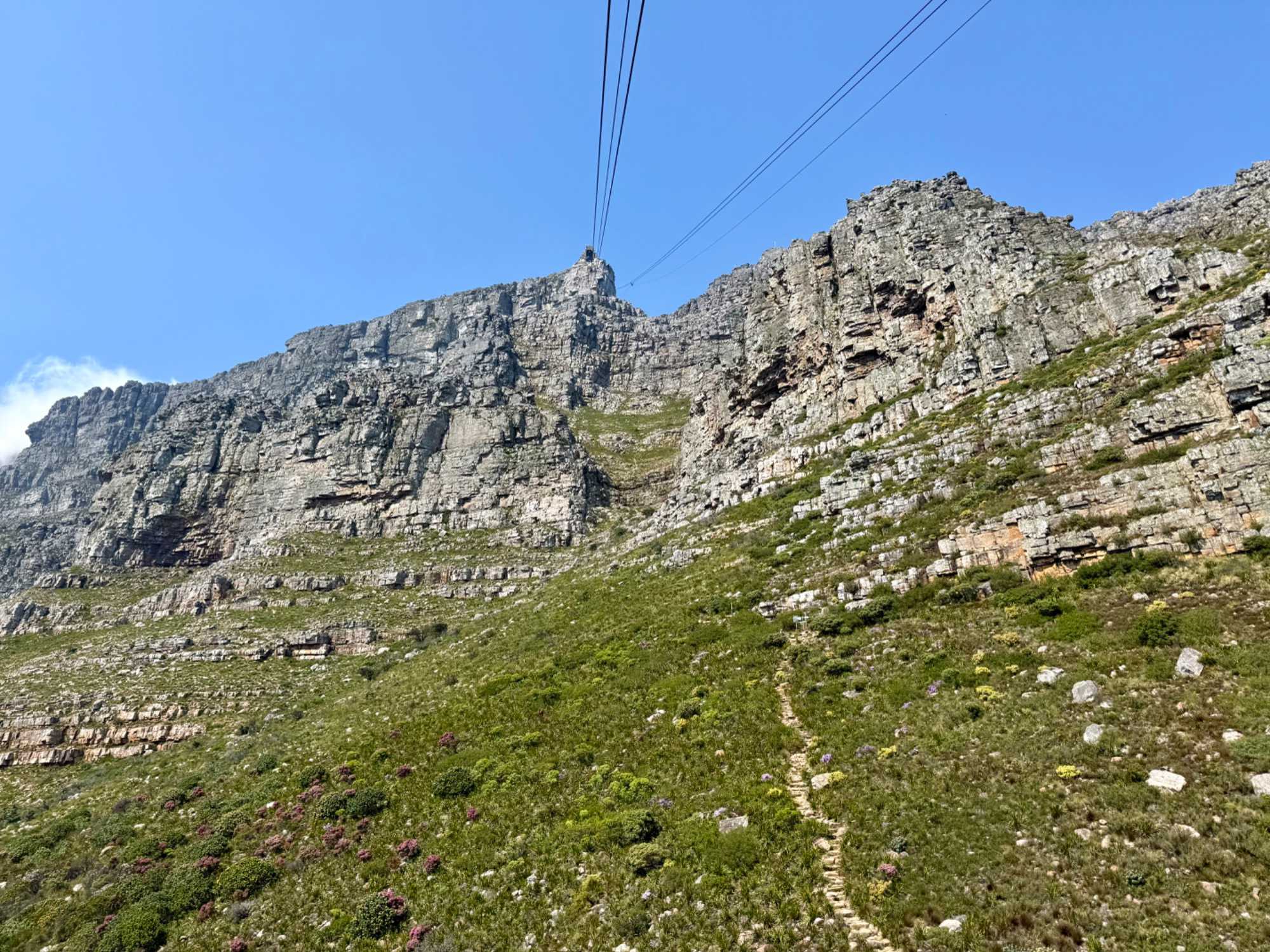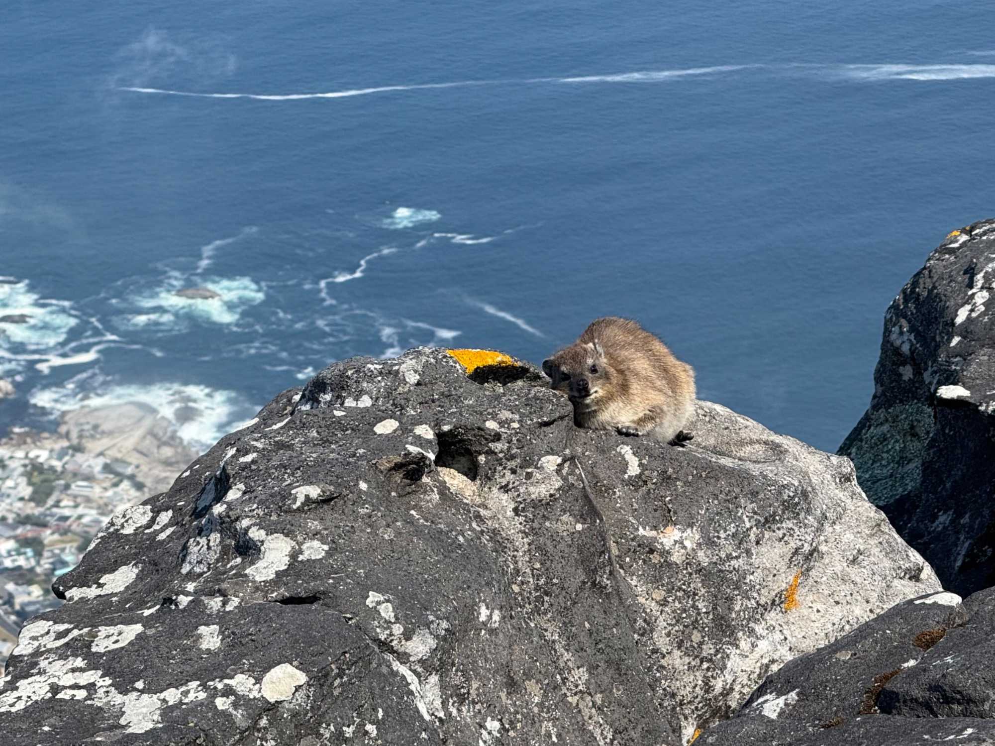 En arrivant au pied de la montagne, nous avons rejoint la file d’attente du téléphérique, d’environ 30 minutes, dans une atmosphère bon enfant. Le Table Mountain Aerial Cableway, inauguré en 1929, est un chef-d’œuvre d’ingénierie. Il effectue la montée en seulement 5 minutes, tandis que la cabine rotative à 360° permet à chacun de profiter d’une vue panoramique imprenable sur Le Cap, l’océan et la péninsule.