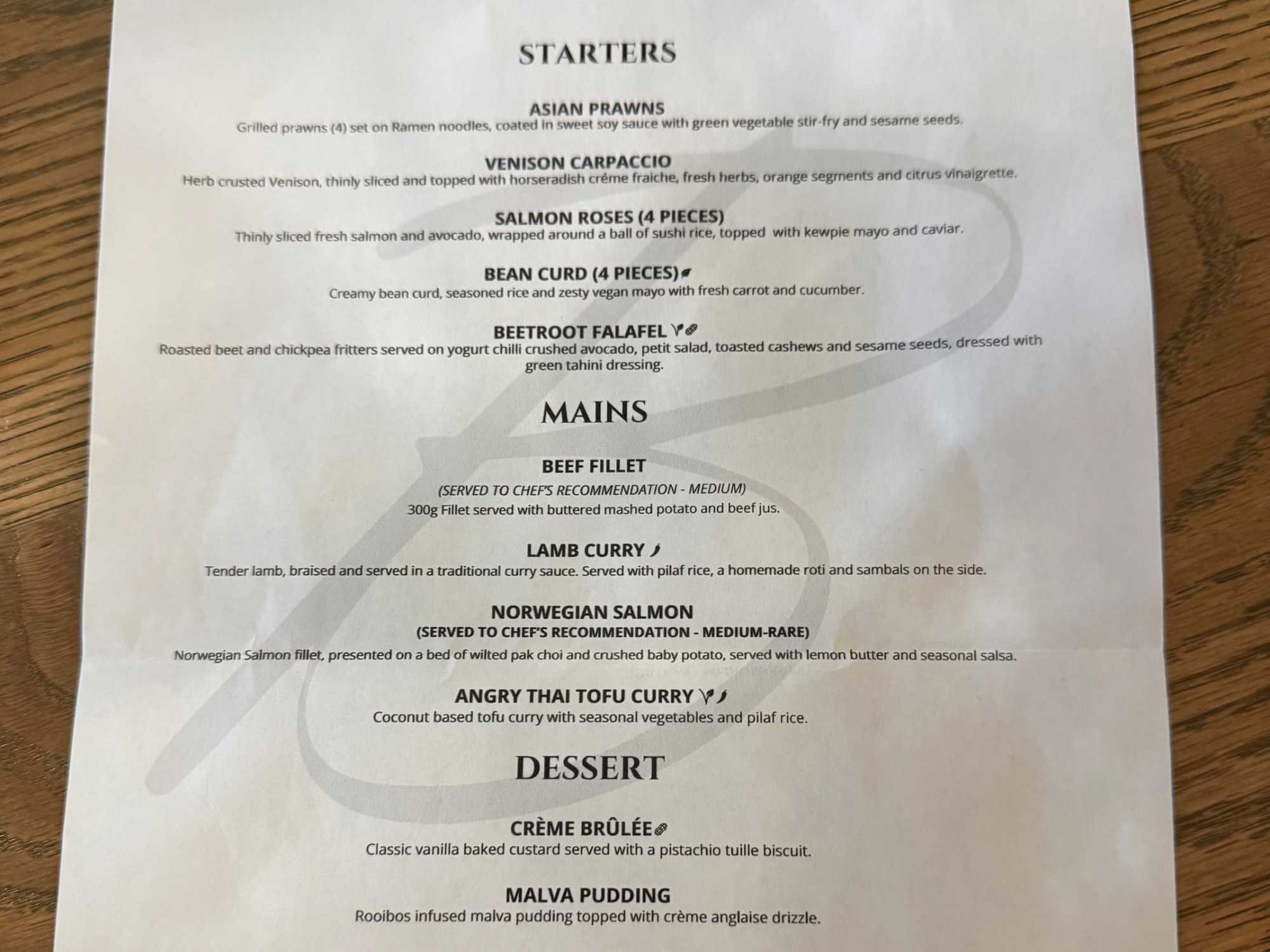 - Pouding Malva – Spécialité sud-africaine parfumée au rooibos, servie avec une sauce anglaise onctueuse.
