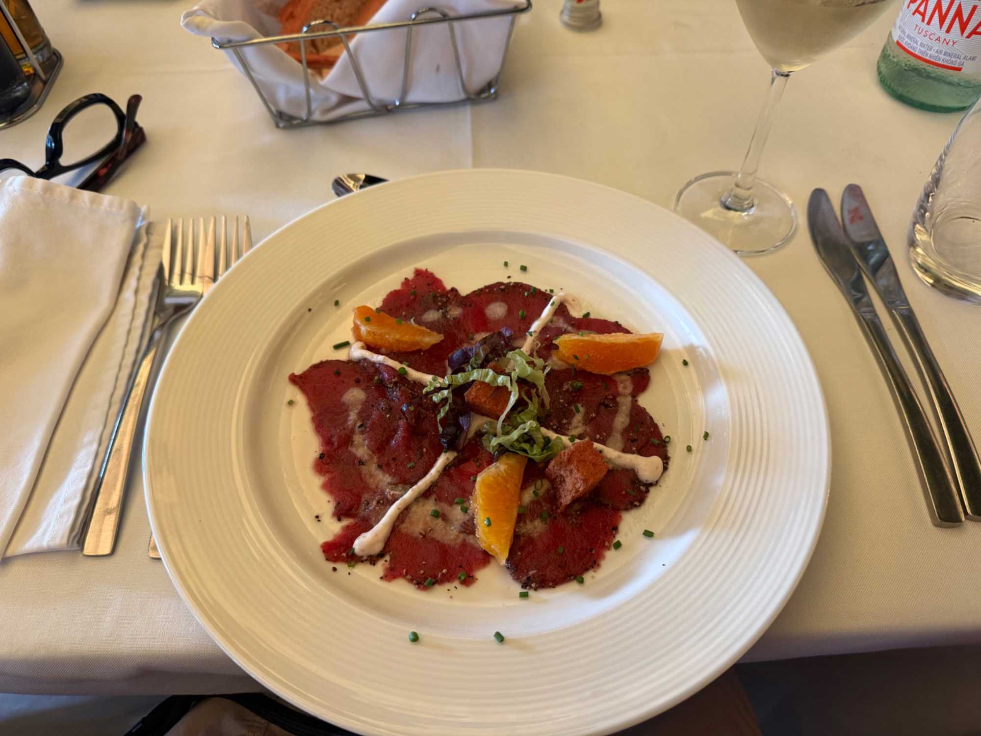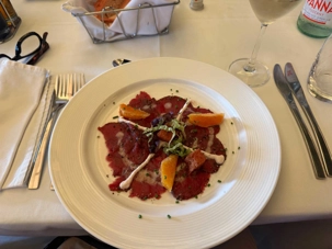 - Carpaccio de venaison – Venaison finement tranchée en croûte d’herbes, servie avec crème de raifort, agrumes et vinaigrette citronnée.
