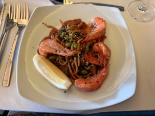 - Crevettes asiatiques – Crevettes grillées servies sur des nouilles ramen, accompagnées de légumes sautés et de graines de sésame, dans une sauce sucrée relevée.