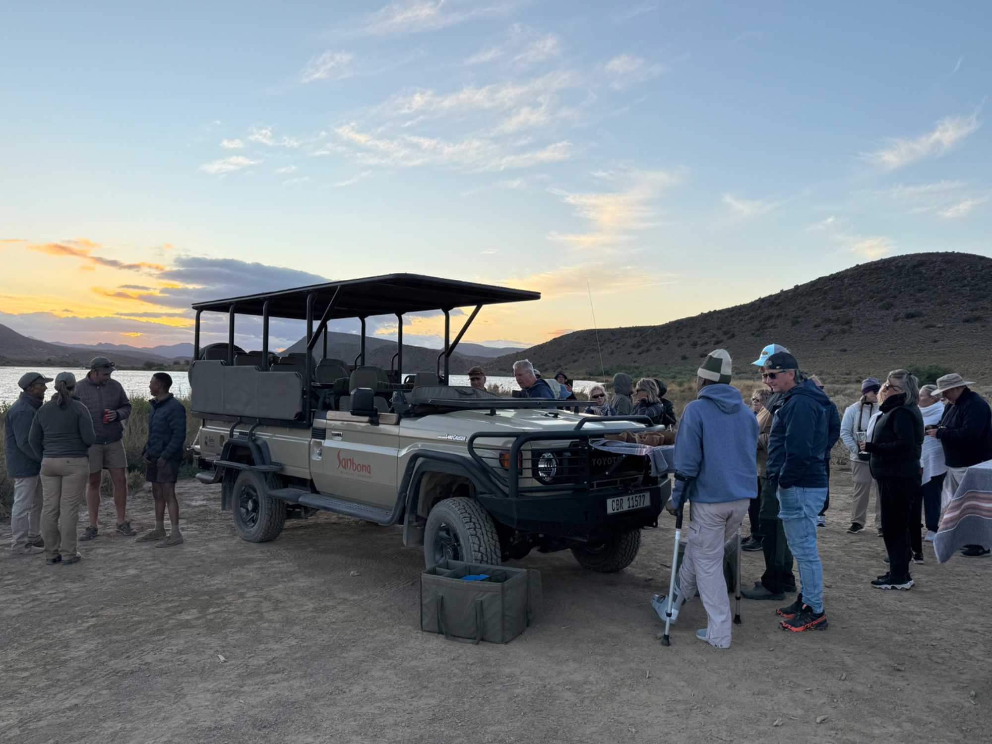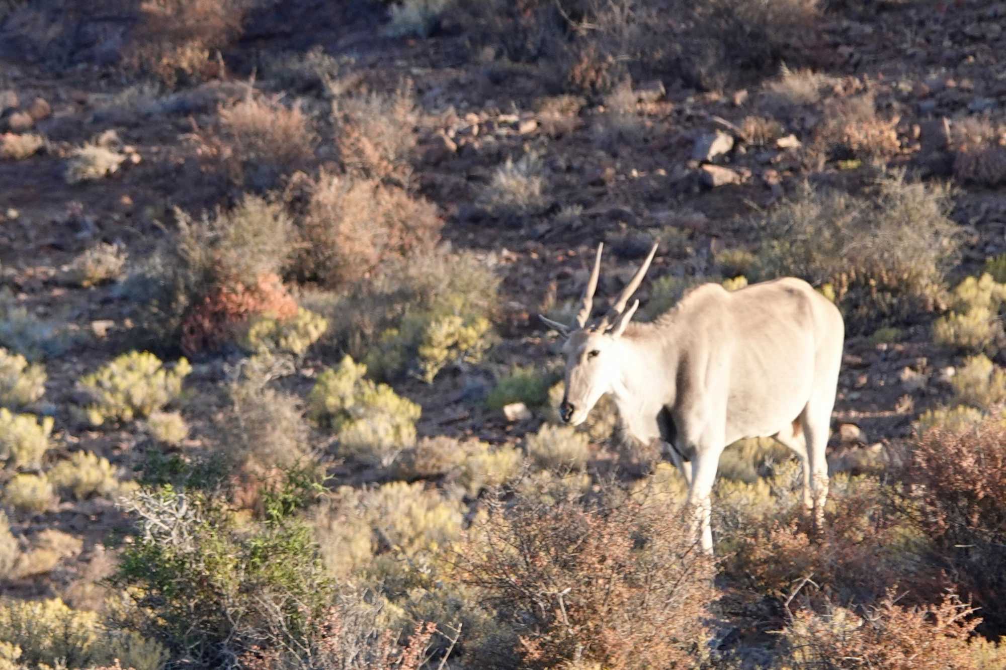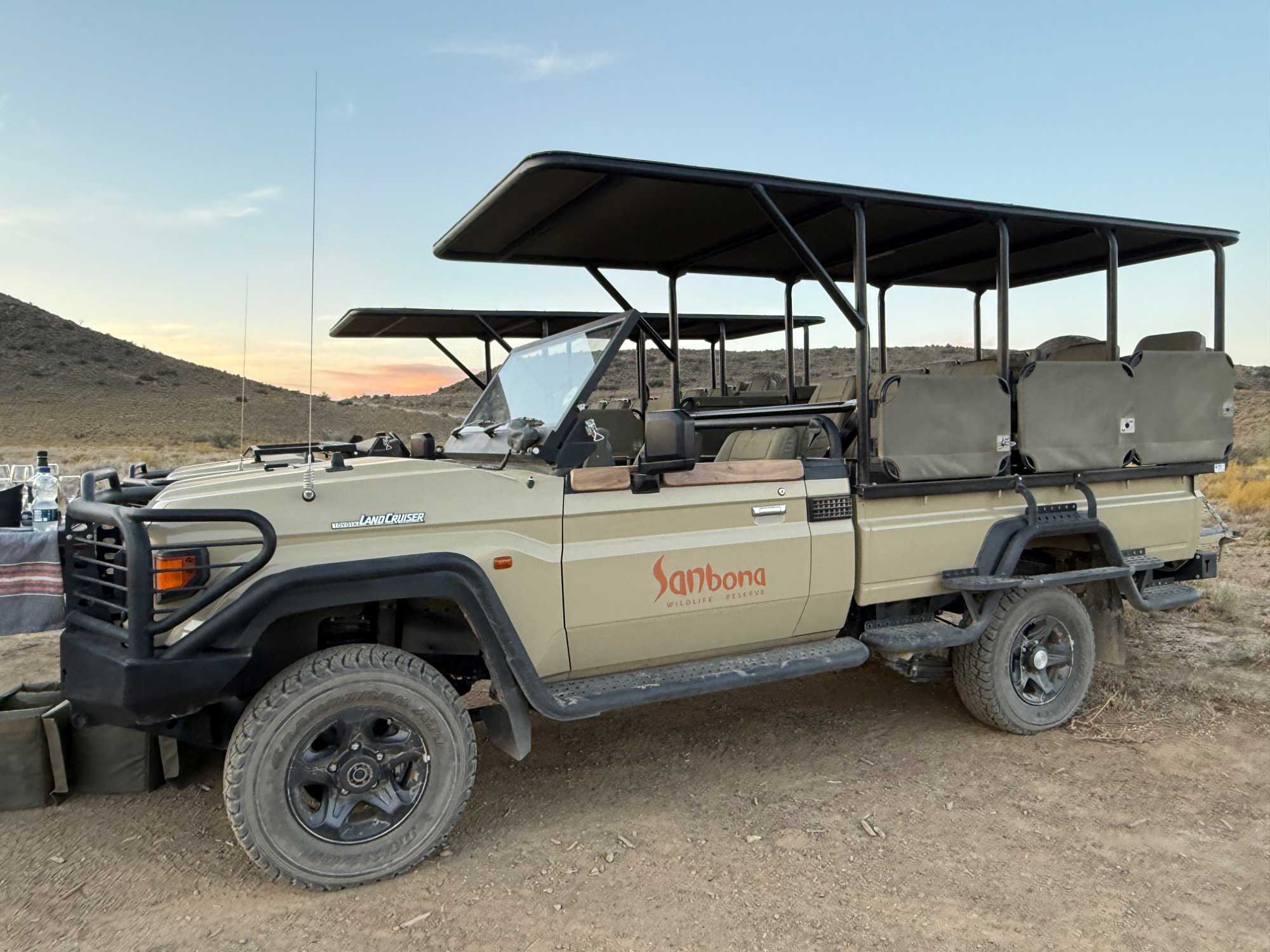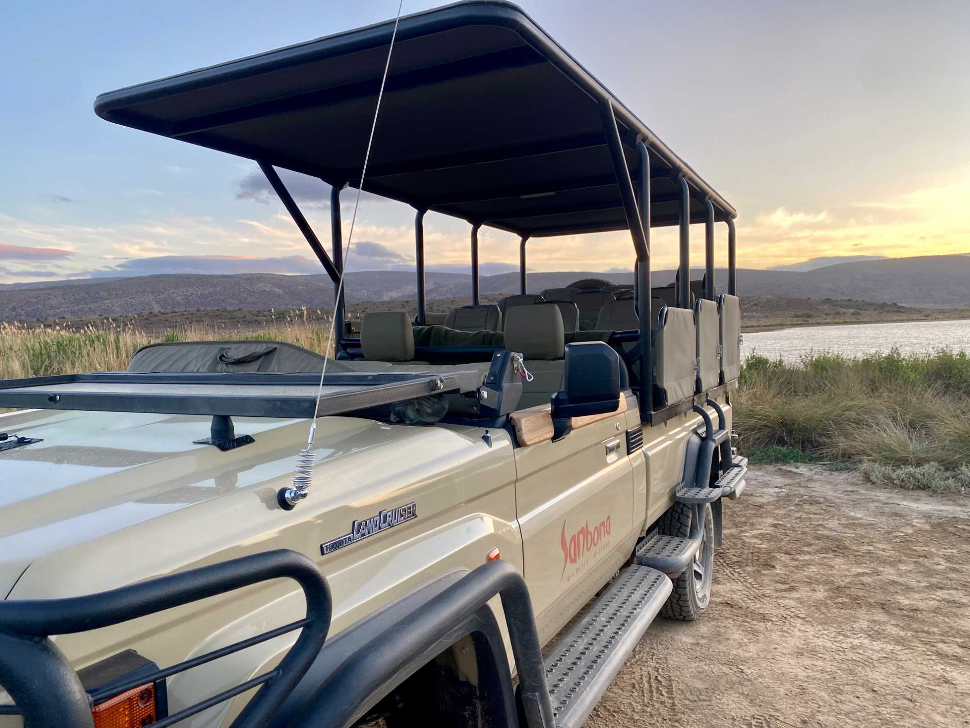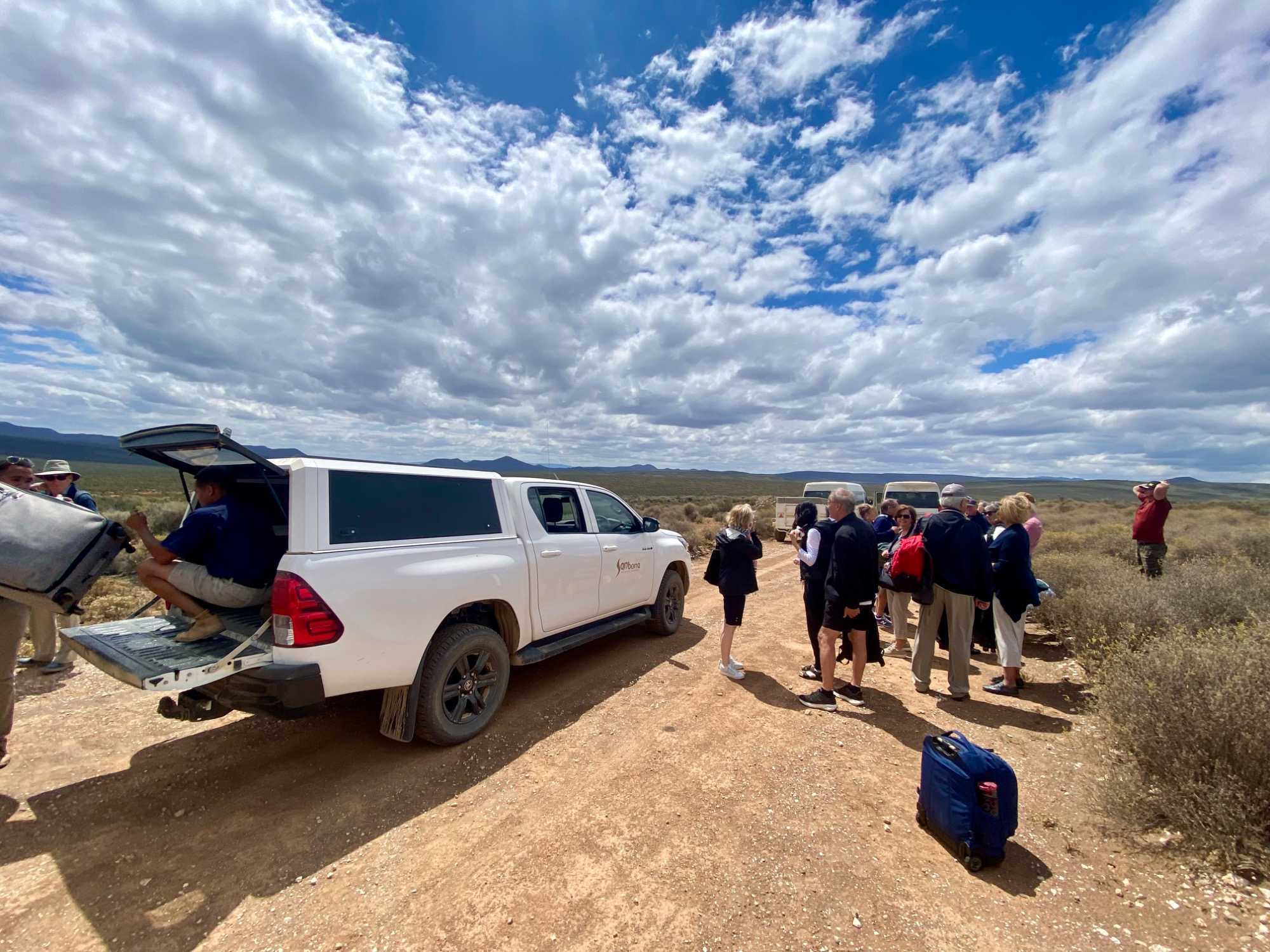 Vers 12 h 30, nous atteignons l’entrée de la réserve privée Sanbona, où nous passerons deux nuits. Le personnel du Gondwana Family Lodge nous accueille chaleureusement ; nous quittons notre autobus pour parcourir les 45 minutes qui nous séparent du lodge à bord de véhicules adaptés.
