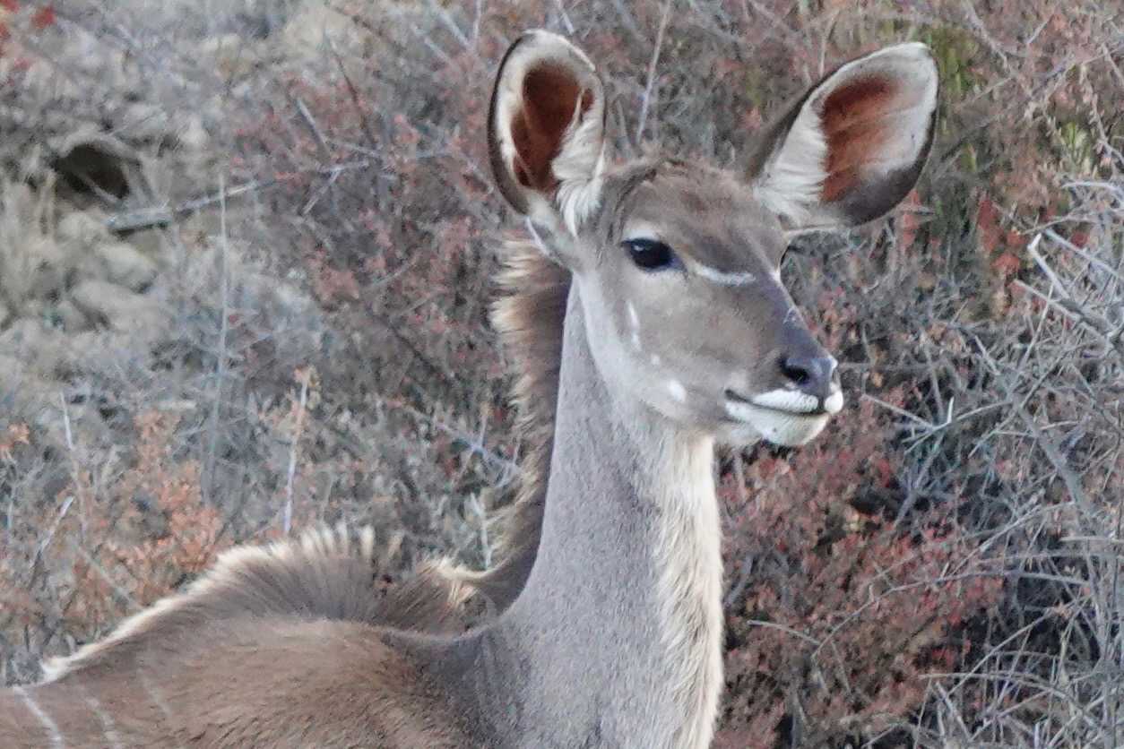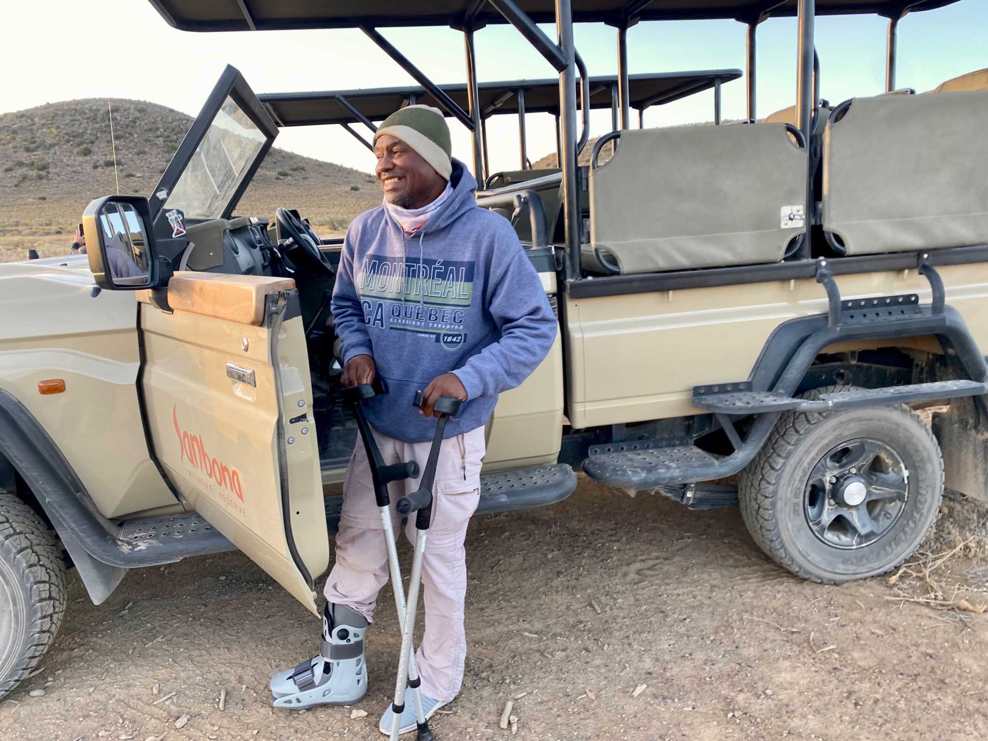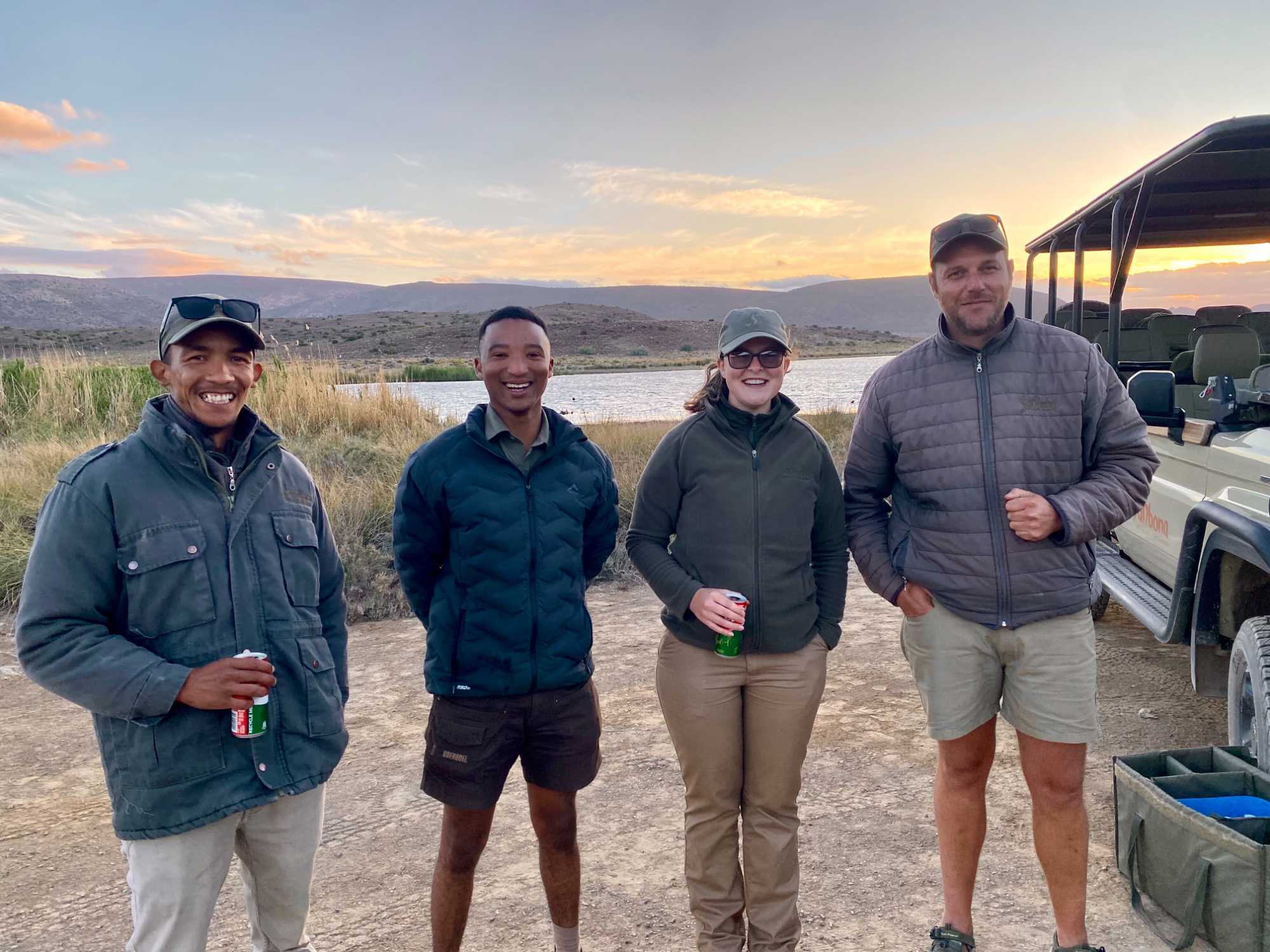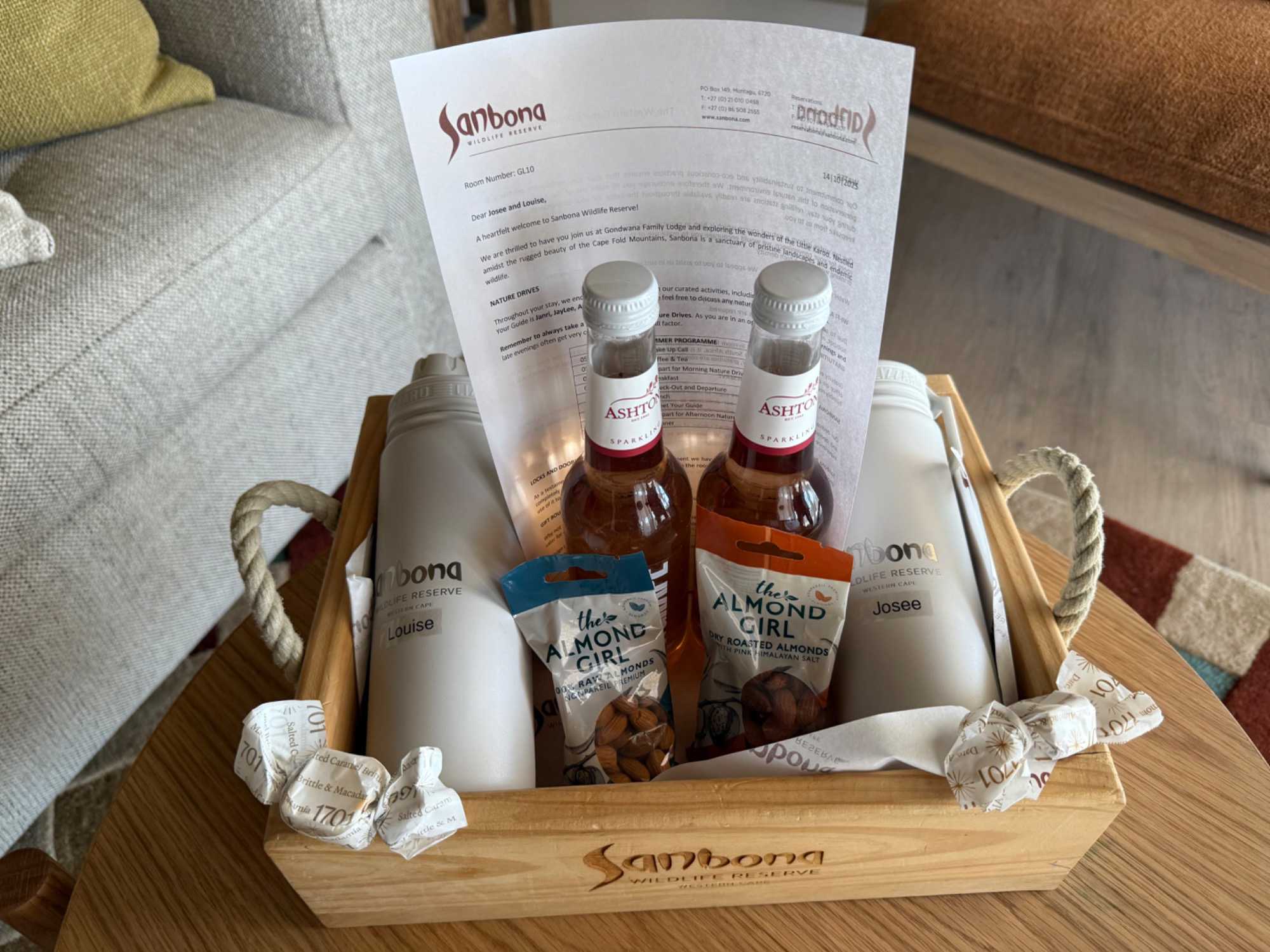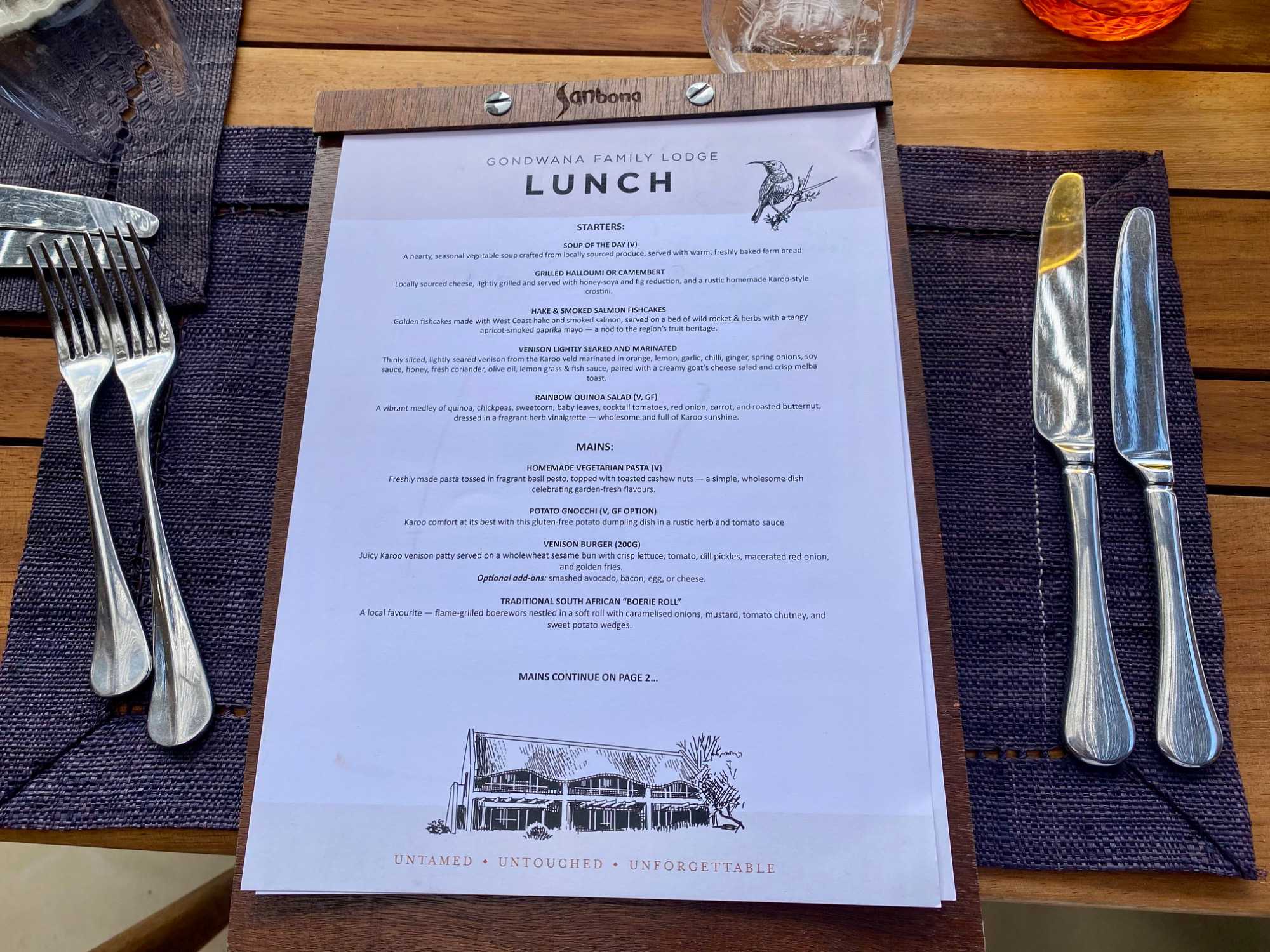 Vers 12 h 30, nous atteignons l’entrée de la réserve privée Sanbona, où nous passerons deux nuits. Le personnel du Gondwana Family Lodge nous accueille chaleureusement ; nous quittons notre autobus pour parcourir les 45 minutes qui nous séparent du lodge à bord de véhicules adaptés.