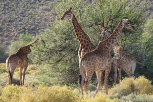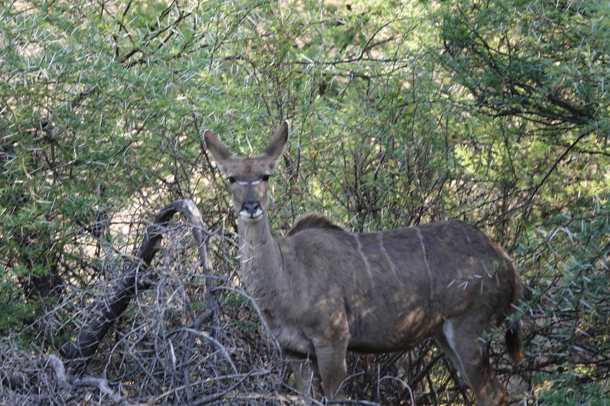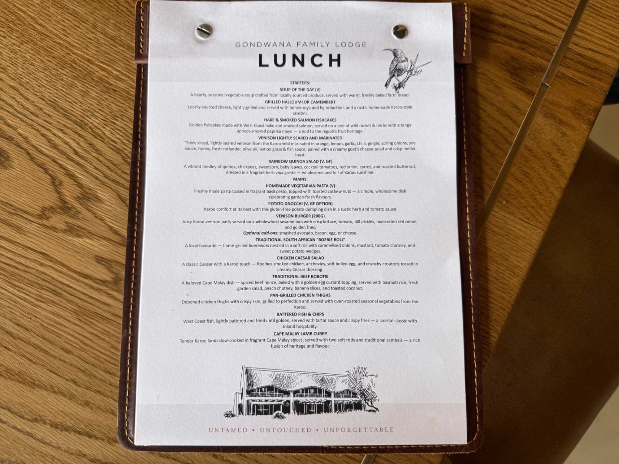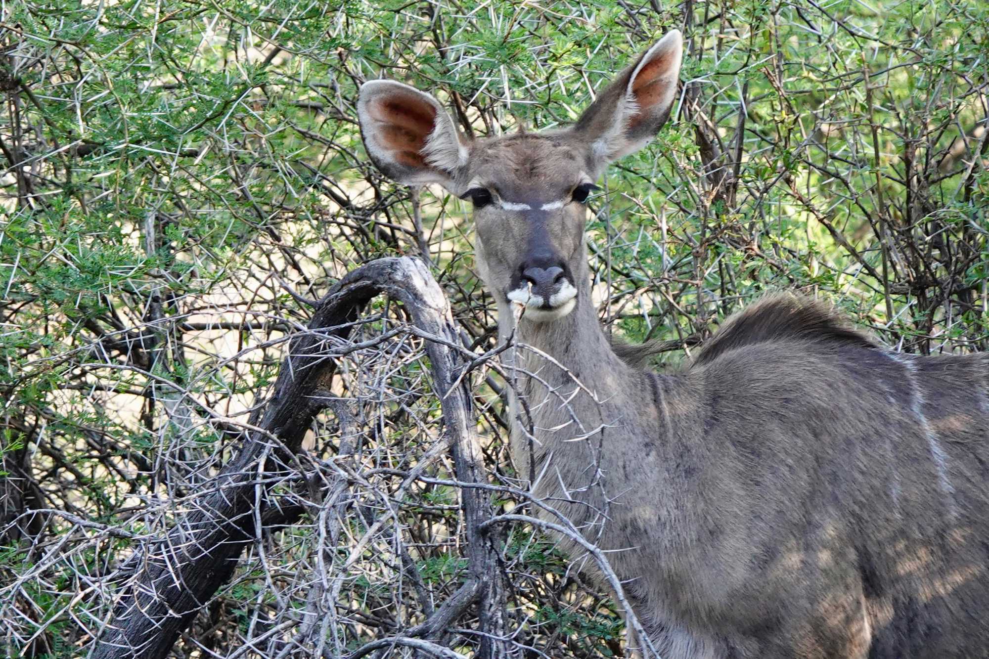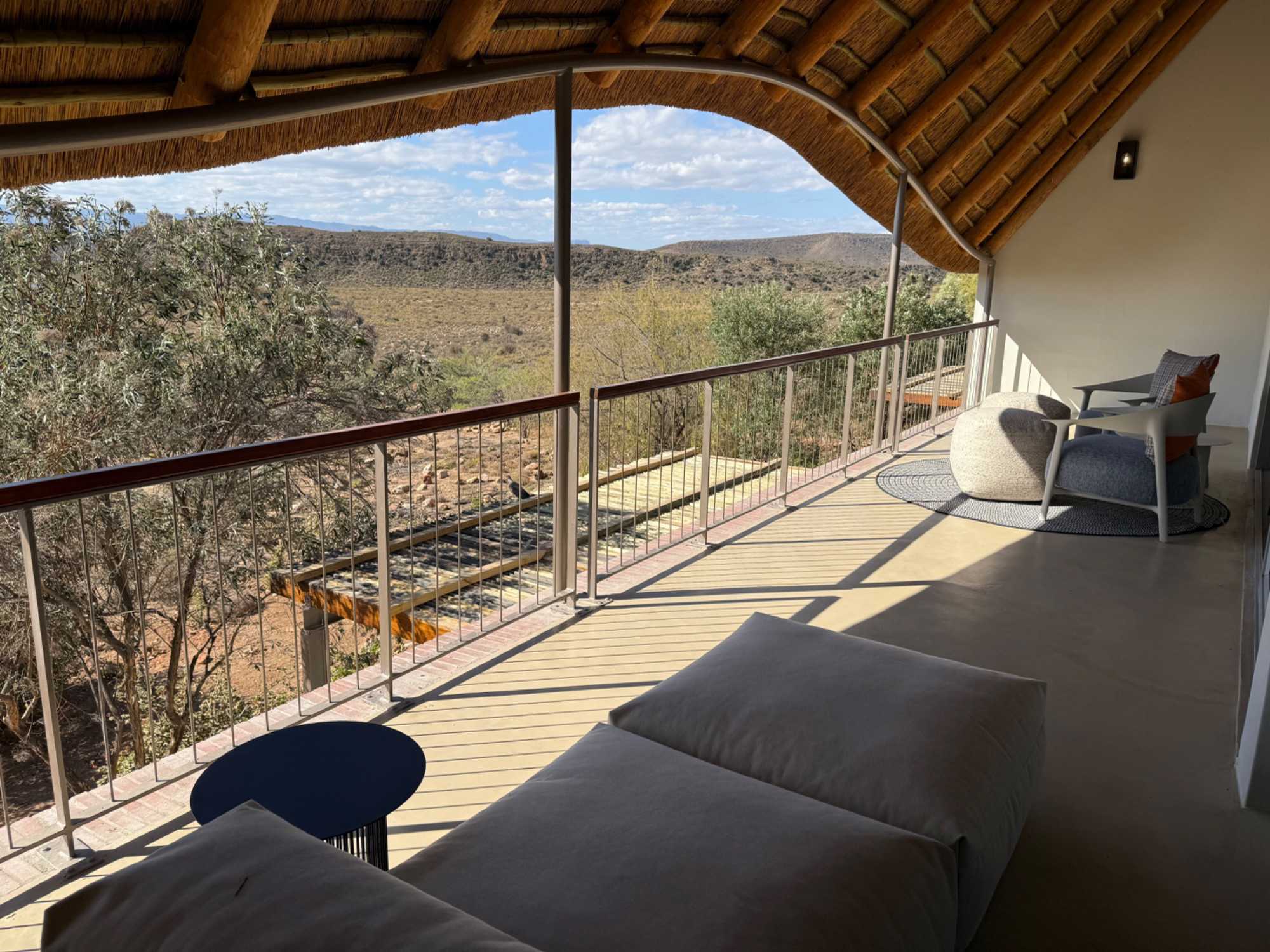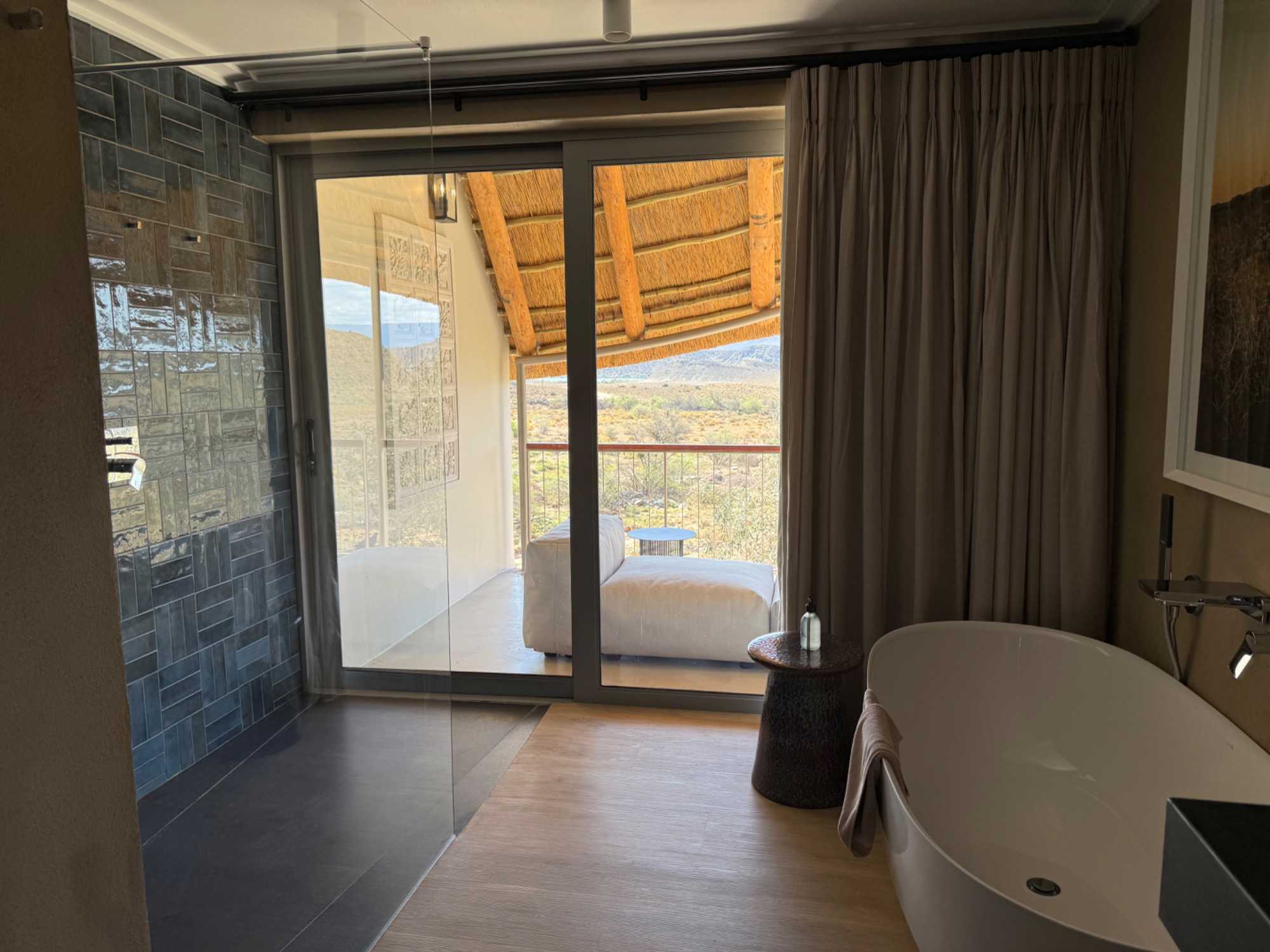Vers 12 h 30, nous atteignons l’entrée de la réserve privée Sanbona, où nous passerons deux nuits. Le personnel du Gondwana Family Lodge nous accueille chaleureusement ; nous quittons notre autobus pour parcourir les 45 minutes qui nous séparent du lodge à bord de véhicules adaptés.