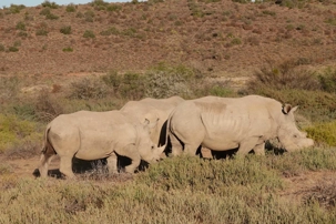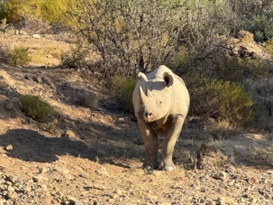 - Puis, un moment d’exception : un groupe de sept rhinocéros blancs ! Deux mères et leurs petits, un mâle imposant, et d’autres femelles. Nous les observons interagir, se frôler, se défier – une scène puissante et pleine de vie.