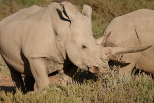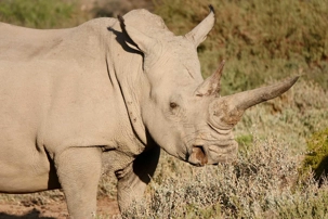 Le rhinocéros blanc (Ceratotherium simum) : plus massif, sociable et paisible, adepte des prairies ouvertes.