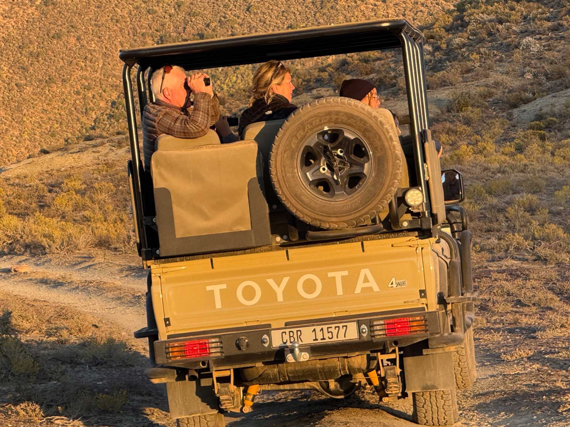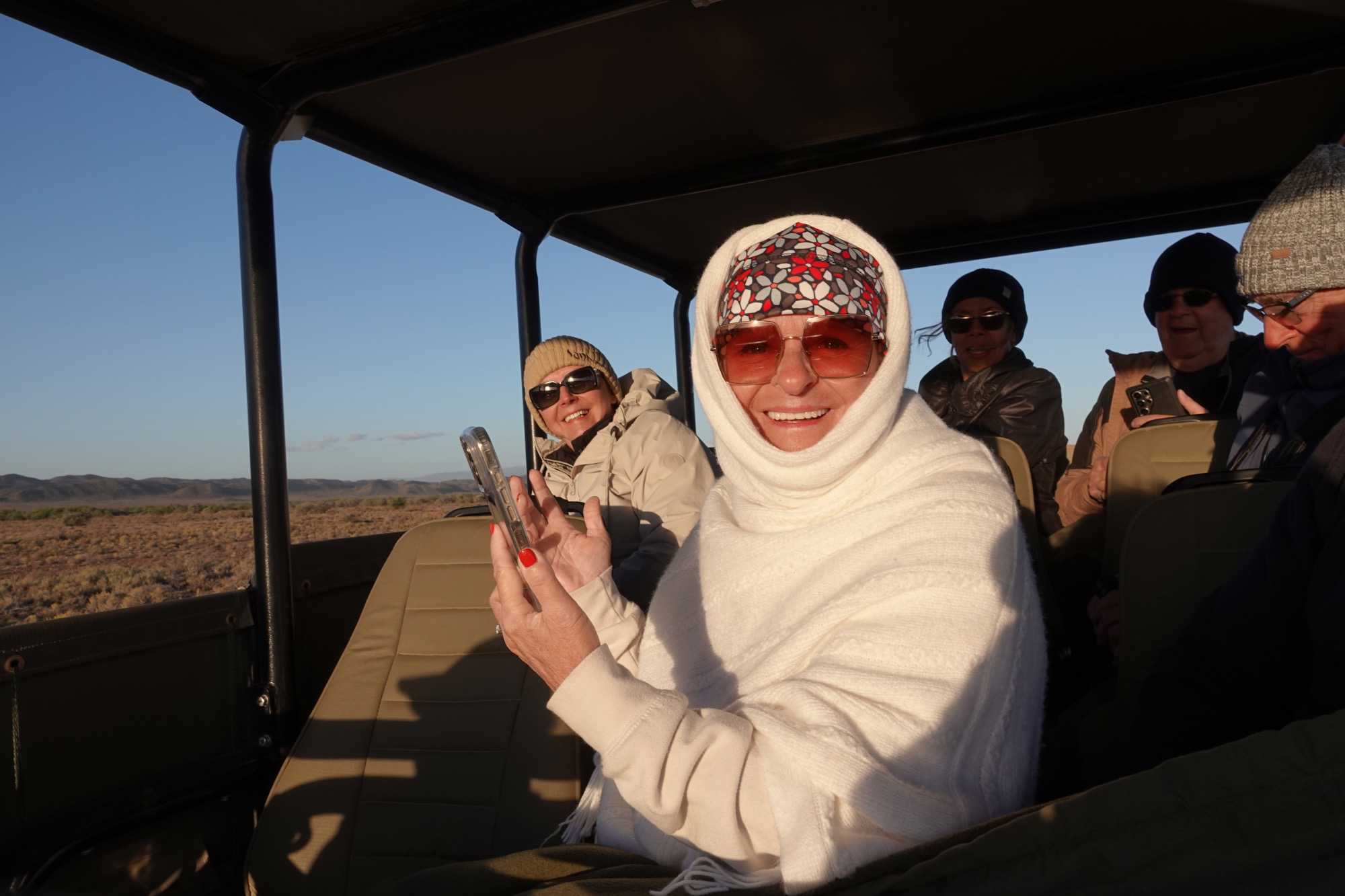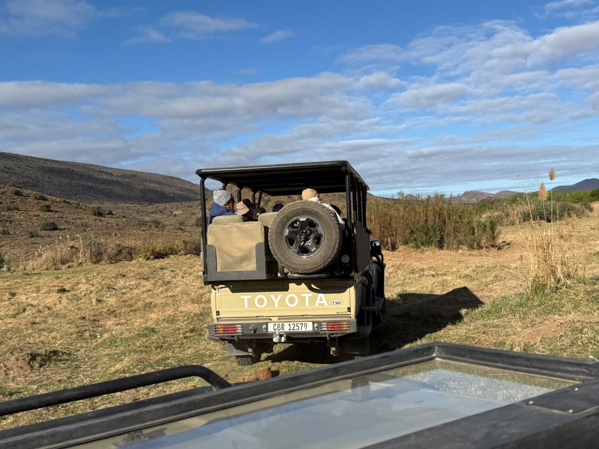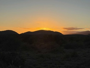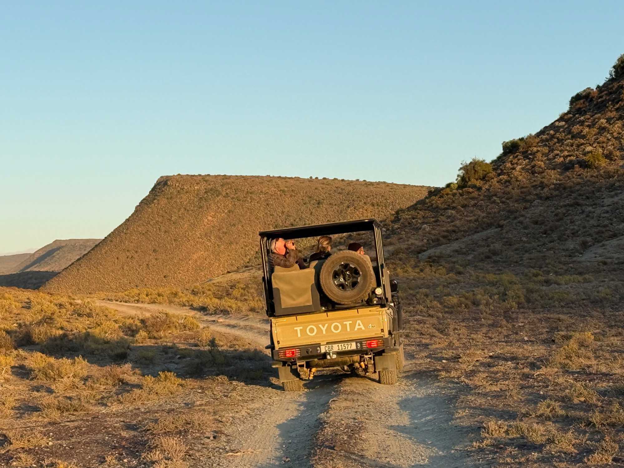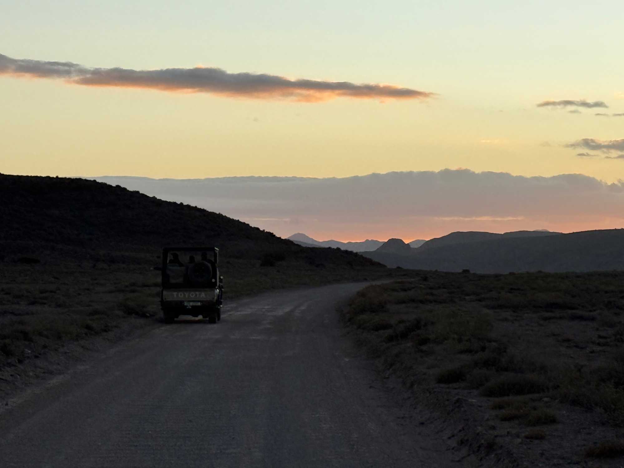 Très heureux de repartir à nouveau pour notre deuxième safari dans la splendide nature de la réserve de Sanbona, nous avons vécu une matinée tout aussi magique que la précédente. Le réveil fut matinal, sous une température fraîche mais déjà plus douce que la veille au soir. Bien emmitouflés, nous avons pris la route avant le lever du soleil pour vivre à nouveau ce moment privilégié où la nature s’éveille. 🌅