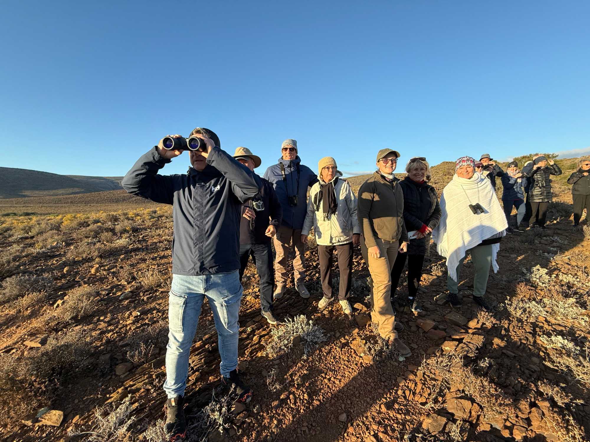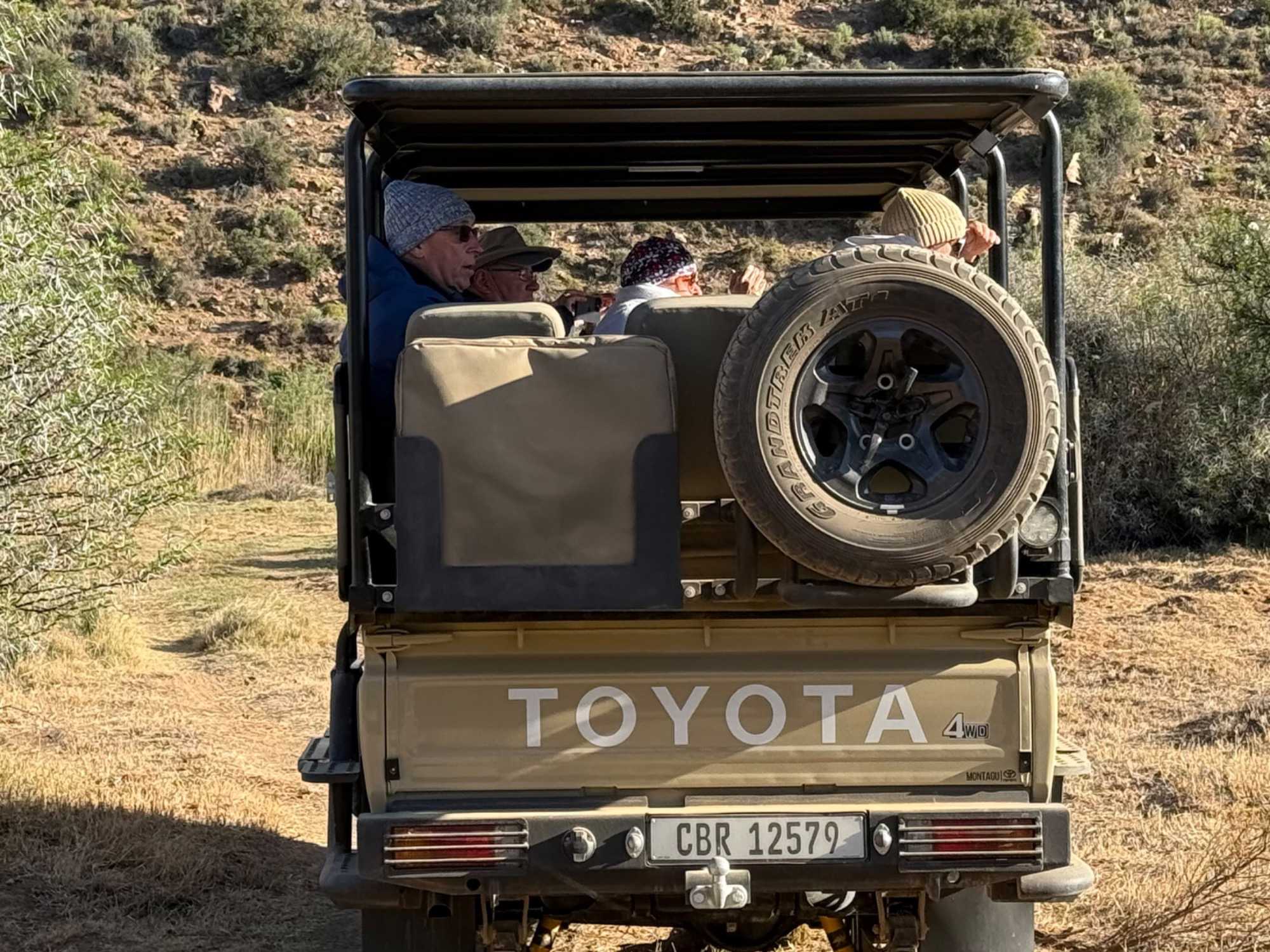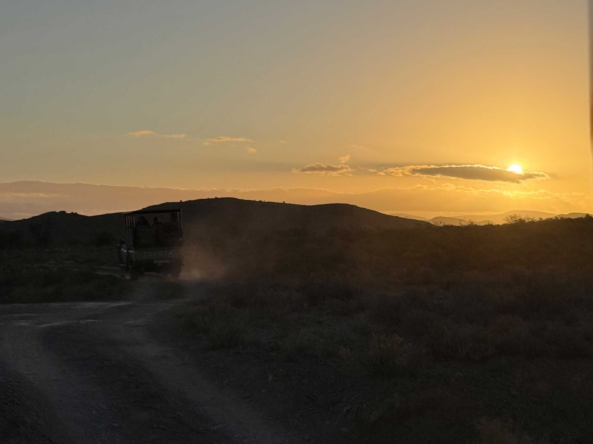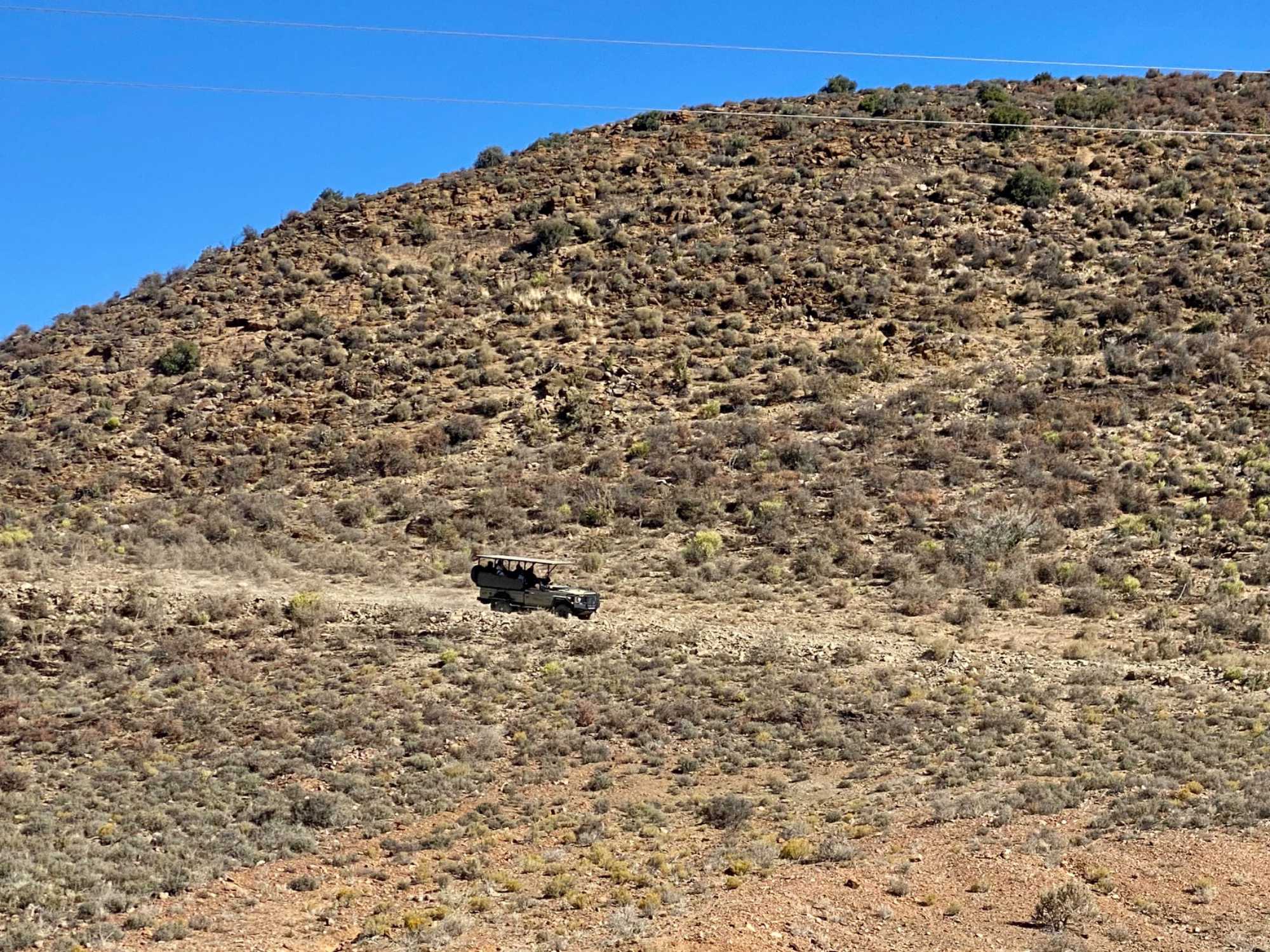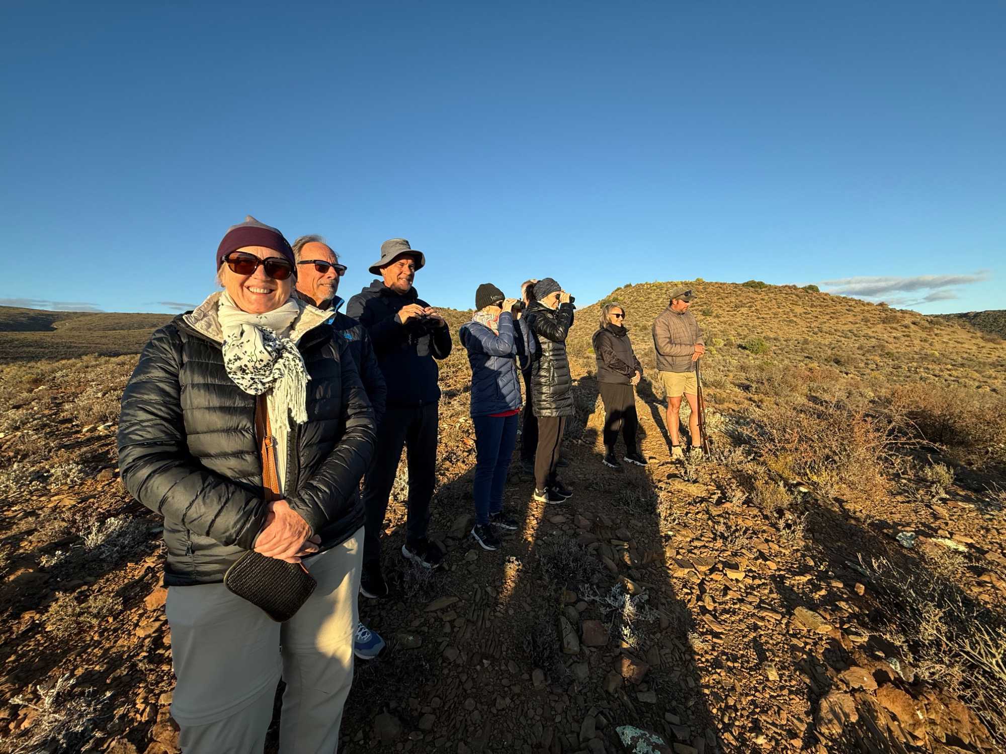 Très heureux de repartir à nouveau pour notre deuxième safari dans la splendide nature de la réserve de Sanbona, nous avons vécu une matinée tout aussi magique que la précédente. Le réveil fut matinal, sous une température fraîche mais déjà plus douce que la veille au soir. Bien emmitouflés, nous avons pris la route avant le lever du soleil pour vivre à nouveau ce moment privilégié où la nature s’éveille. 🌅
