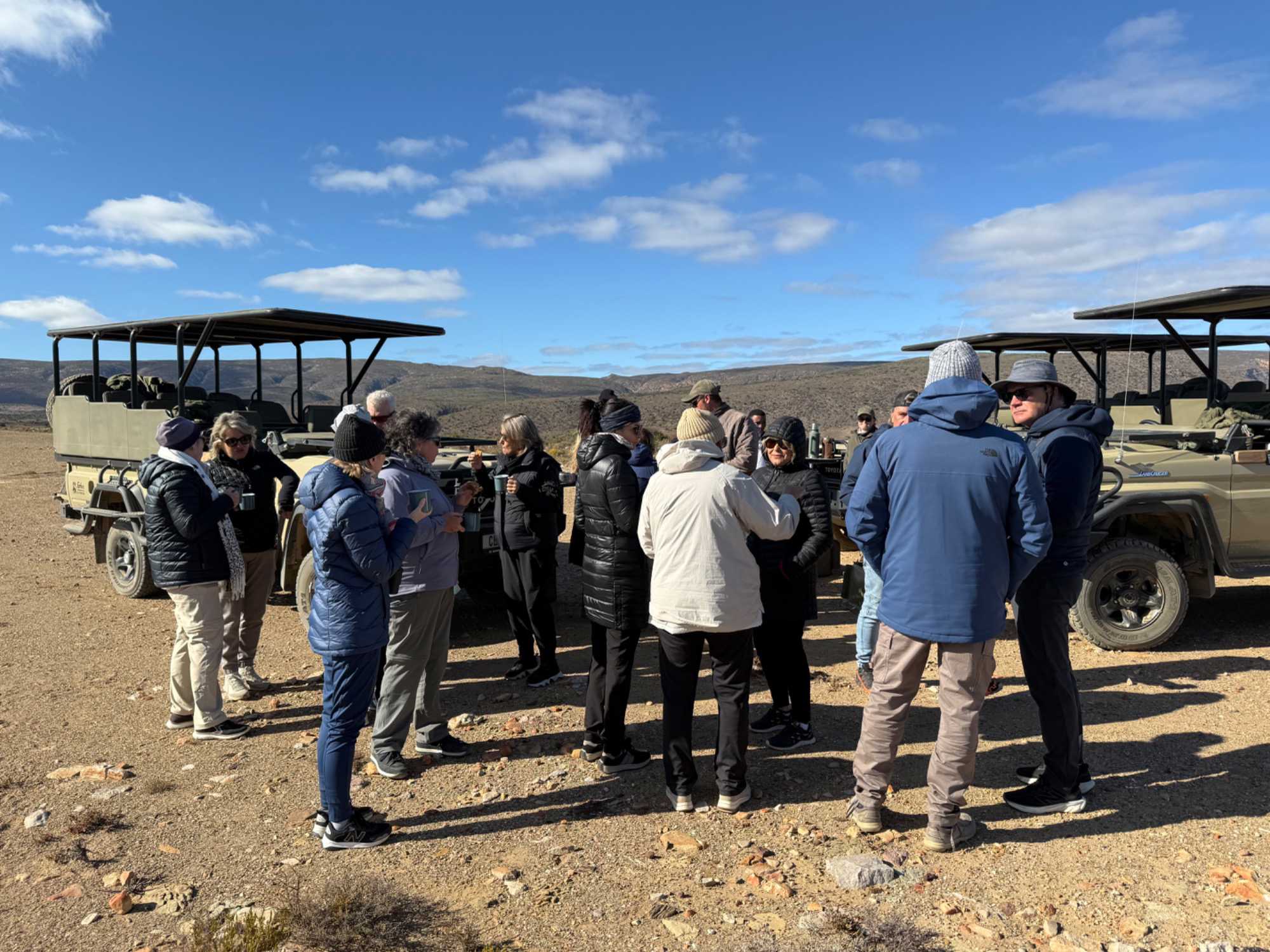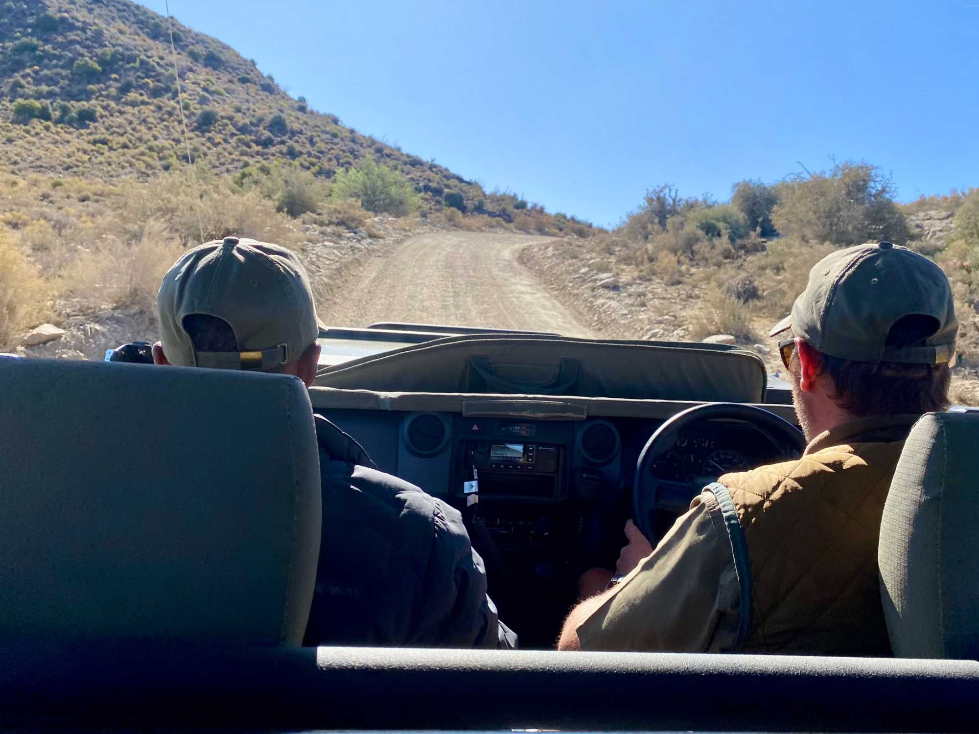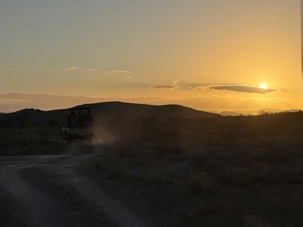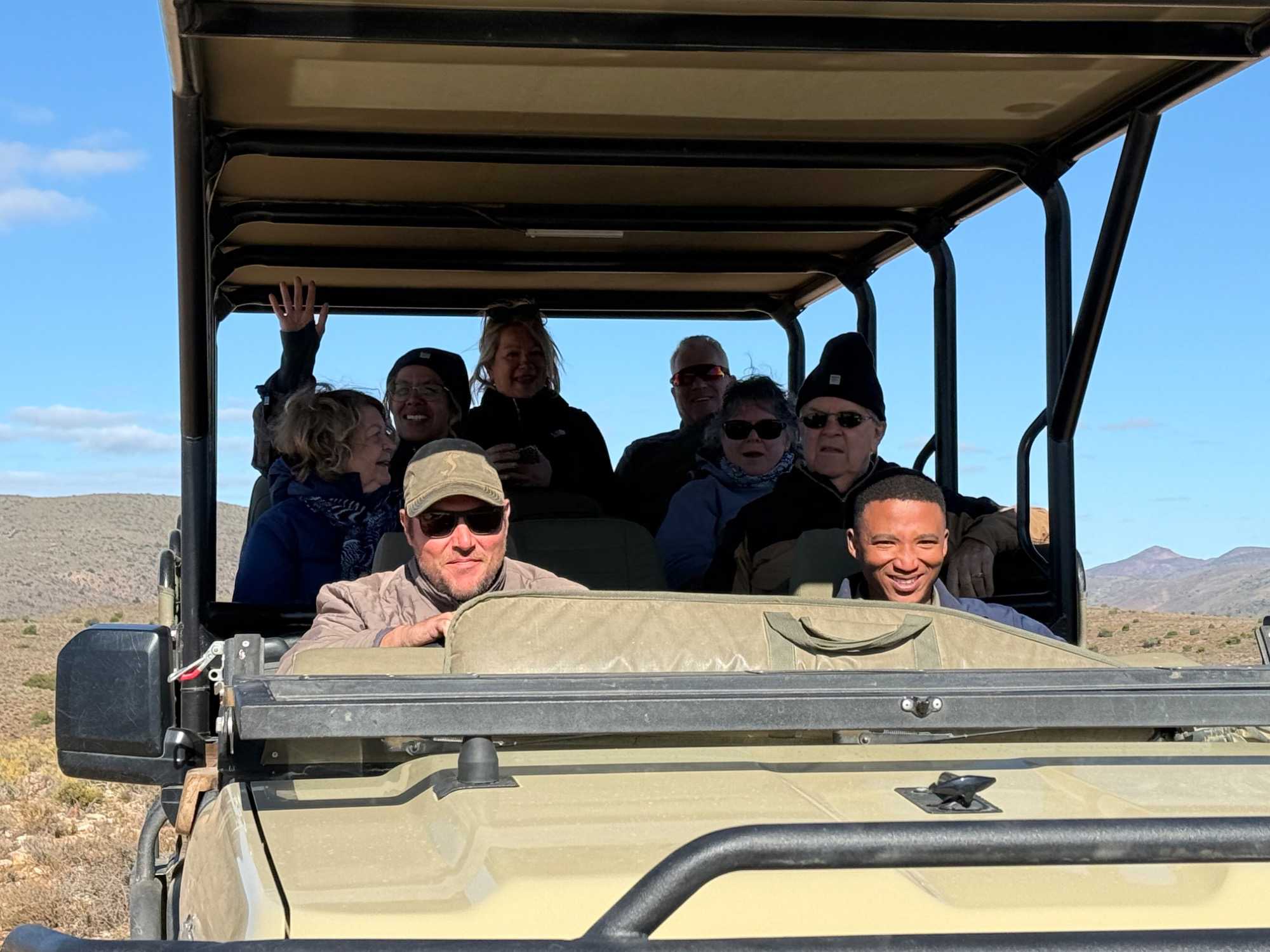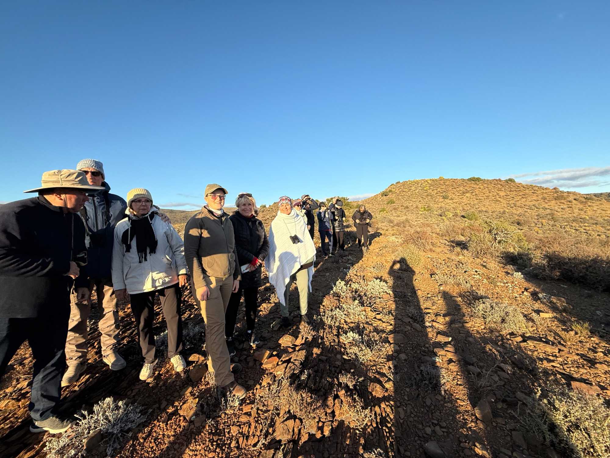 Très heureux de repartir à nouveau pour notre deuxième safari dans la splendide nature de la réserve de Sanbona, nous avons vécu une matinée tout aussi magique que la précédente. Le réveil fut matinal, sous une température fraîche mais déjà plus douce que la veille au soir. Bien emmitouflés, nous avons pris la route avant le lever du soleil pour vivre à nouveau ce moment privilégié où la nature s’éveille. 🌅