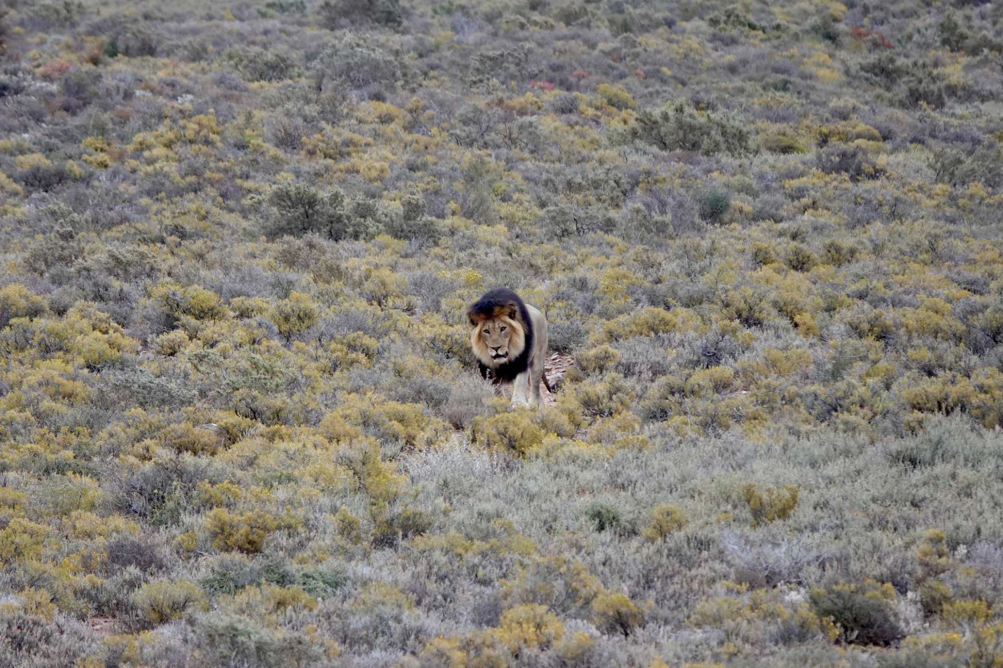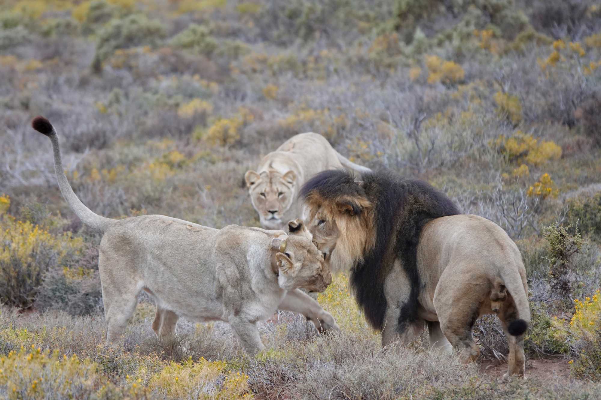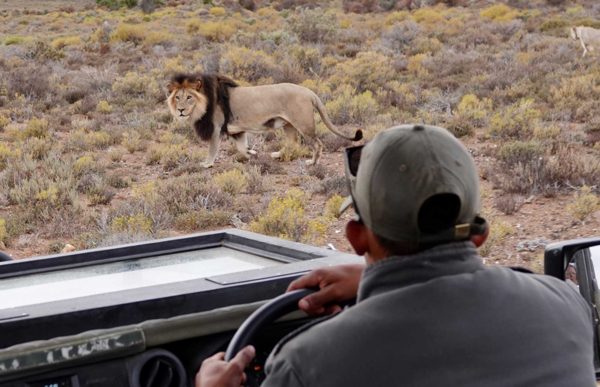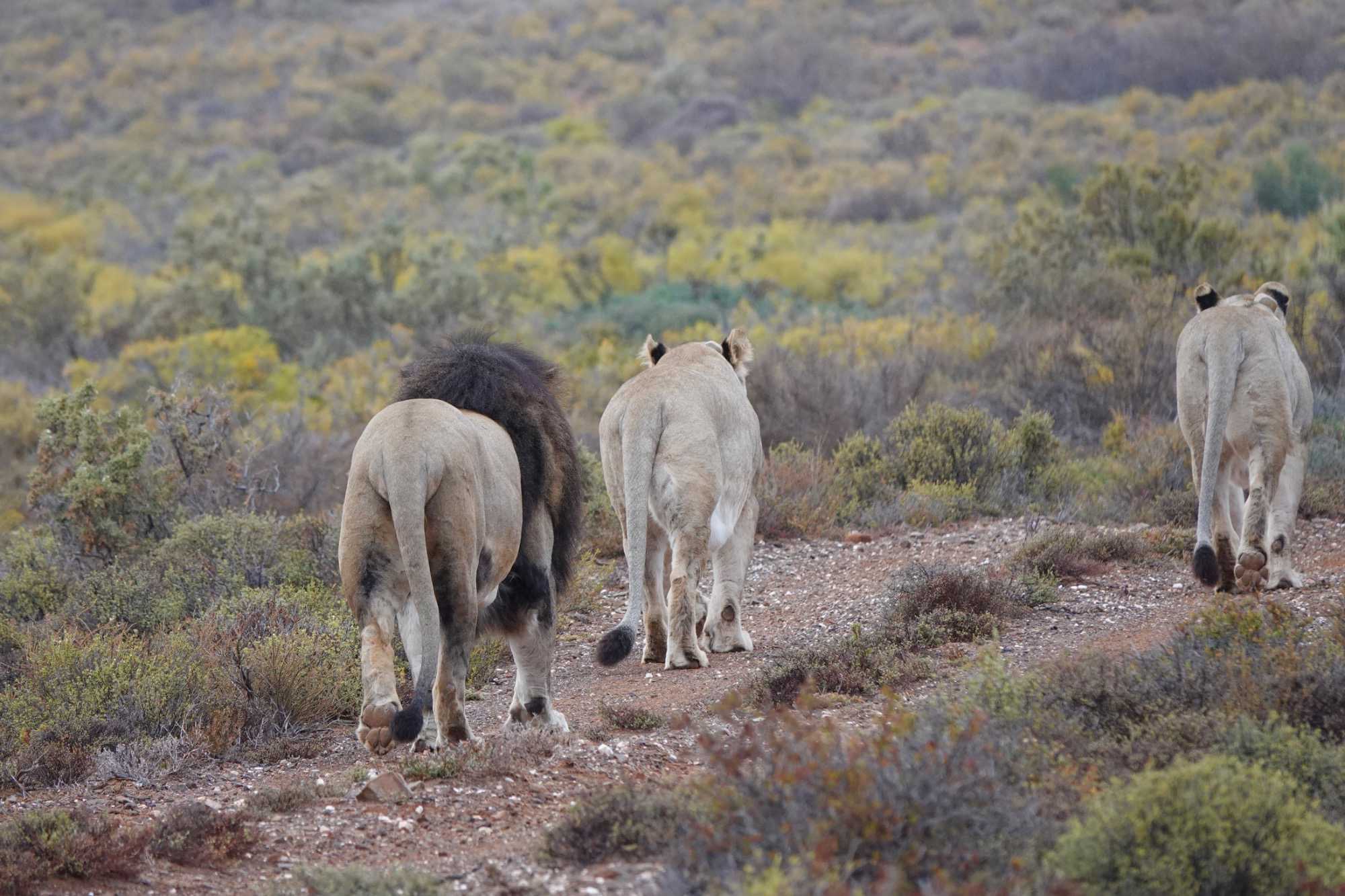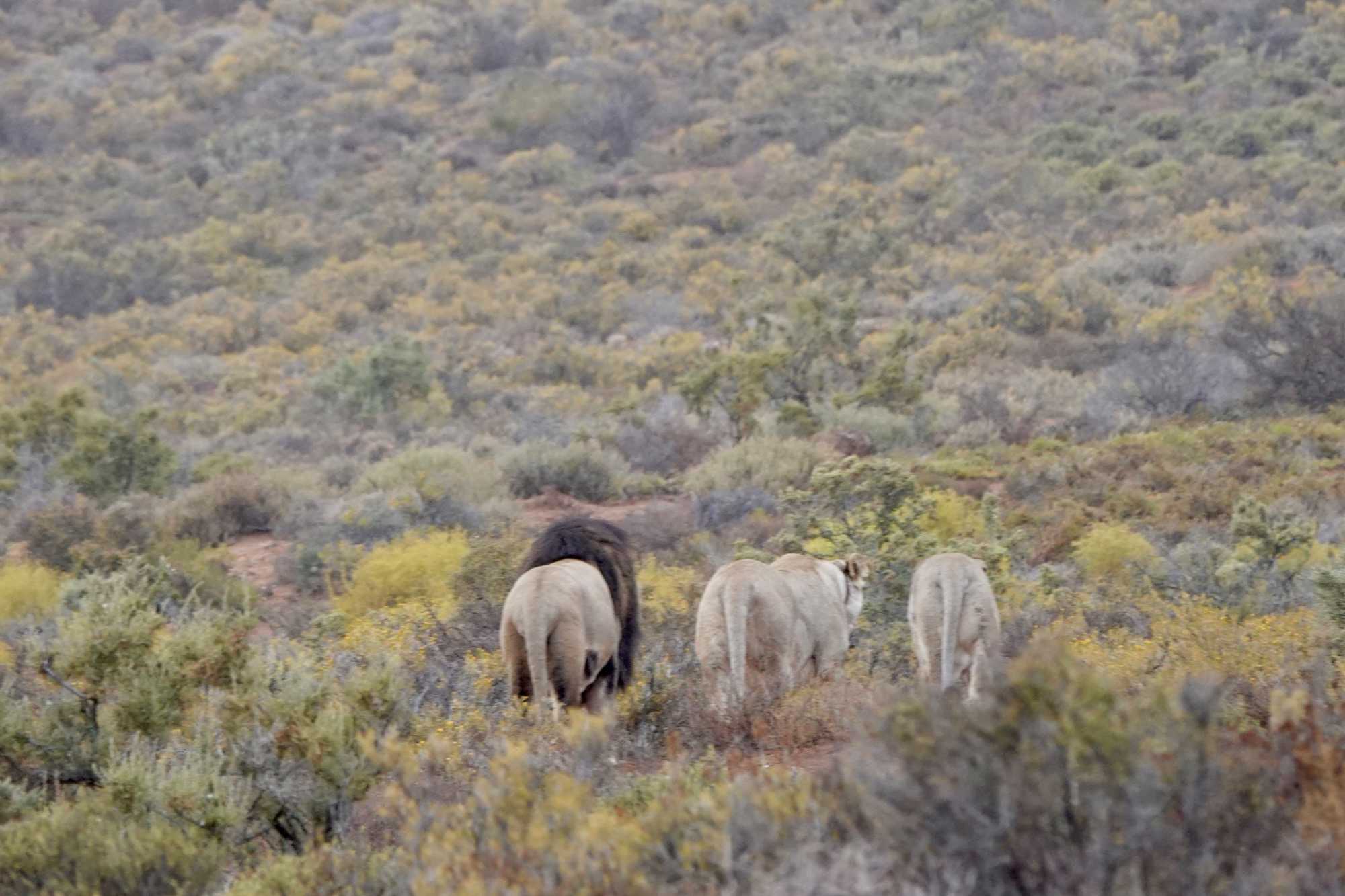 Un peu plus loin, nos guides repèrent deux lionnes qui avancent dans notre direction. Nous comprenons vite que nous allons assister à leurs retrouvailles. Les lionnes étaient parties chasser depuis quelques semaines et reviennent enfin vers le mâle. Ce fut un moment magique et bouleversant : accolades, frottements de tête, gestes tendres… Un spectacle d’une beauté rare, empreint de puissance et de grâce. ❤️Nos guides nous apprennent que la réserve de Sanbona abrite seulement trois lions : un mâle et deux femelles. Les lionnes sont placées sous contraception pour éviter la consanguinité, car la population est volontairement limitée pour préserver l’équilibre naturel du territoire. Nous avons donc été les chanceux qui ont eu la chance de voir toute la famille réunie — un moment que nous n’oublierons jamais. 🦁