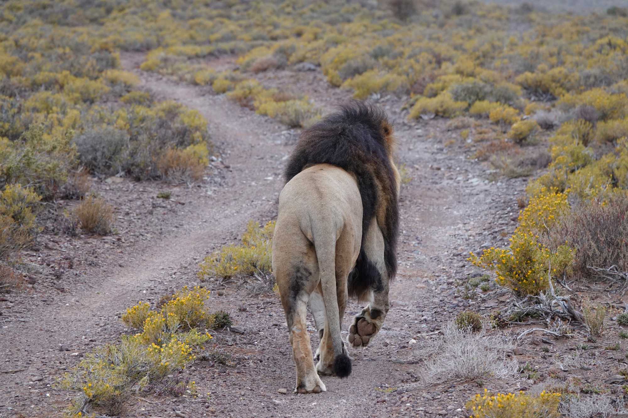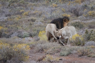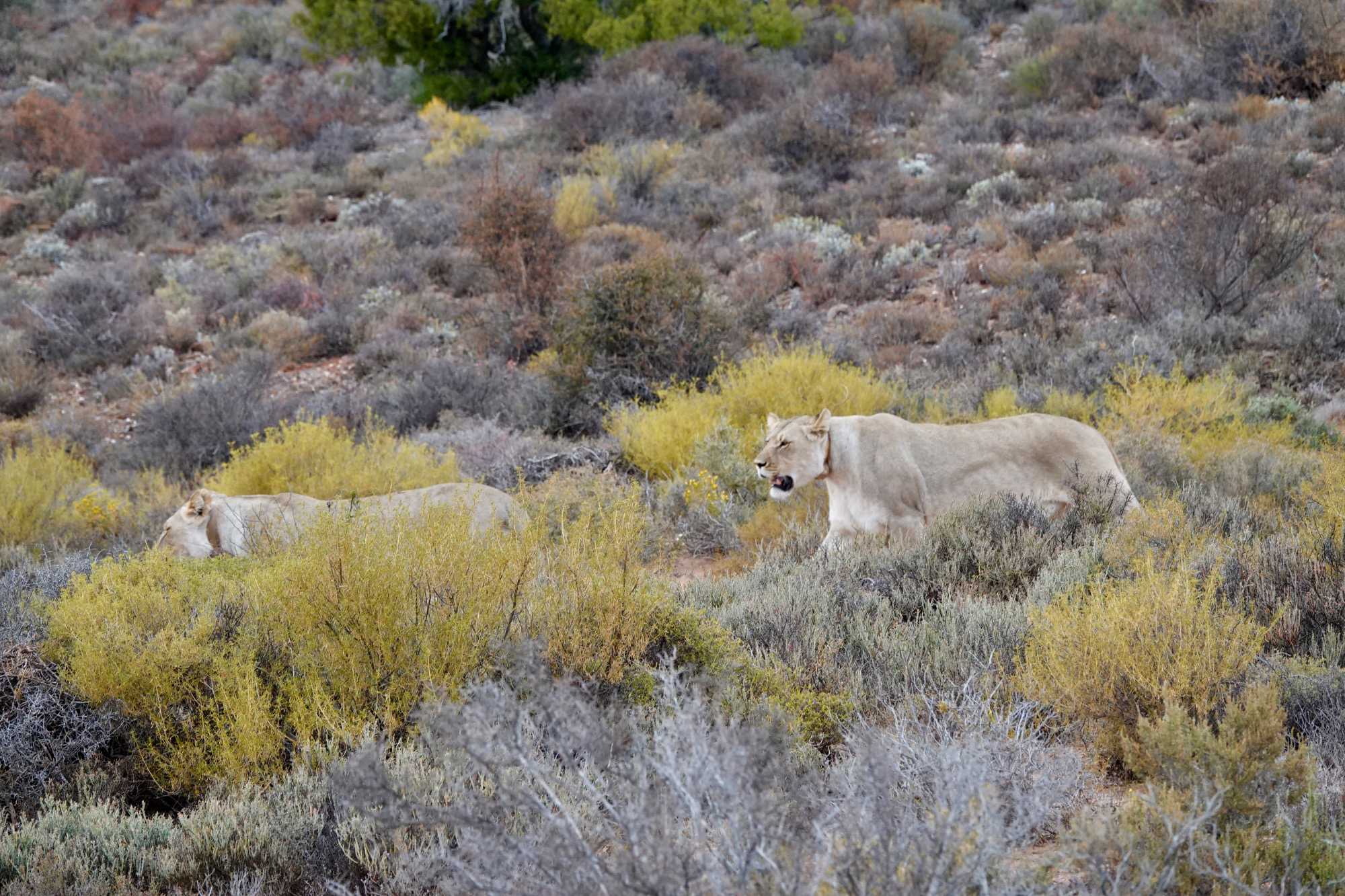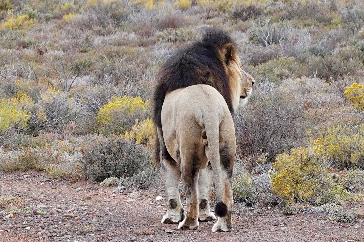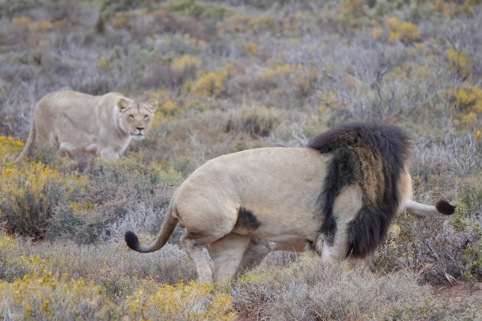 Un peu plus loin, nos guides repèrent deux lionnes qui avancent dans notre direction. Nous comprenons vite que nous allons assister à leurs retrouvailles. Les lionnes étaient parties chasser depuis quelques semaines et reviennent enfin vers le mâle. Ce fut un moment magique et bouleversant : accolades, frottements de tête, gestes tendres… Un spectacle d’une beauté rare, empreint de puissance et de grâce. ❤️Nos guides nous apprennent que la réserve de Sanbona abrite seulement trois lions : un mâle et deux femelles. Les lionnes sont placées sous contraception pour éviter la consanguinité, car la population est volontairement limitée pour préserver l’équilibre naturel du territoire. Nous avons donc été les chanceux qui ont eu la chance de voir toute la famille réunie — un moment que nous n’oublierons jamais. 🦁