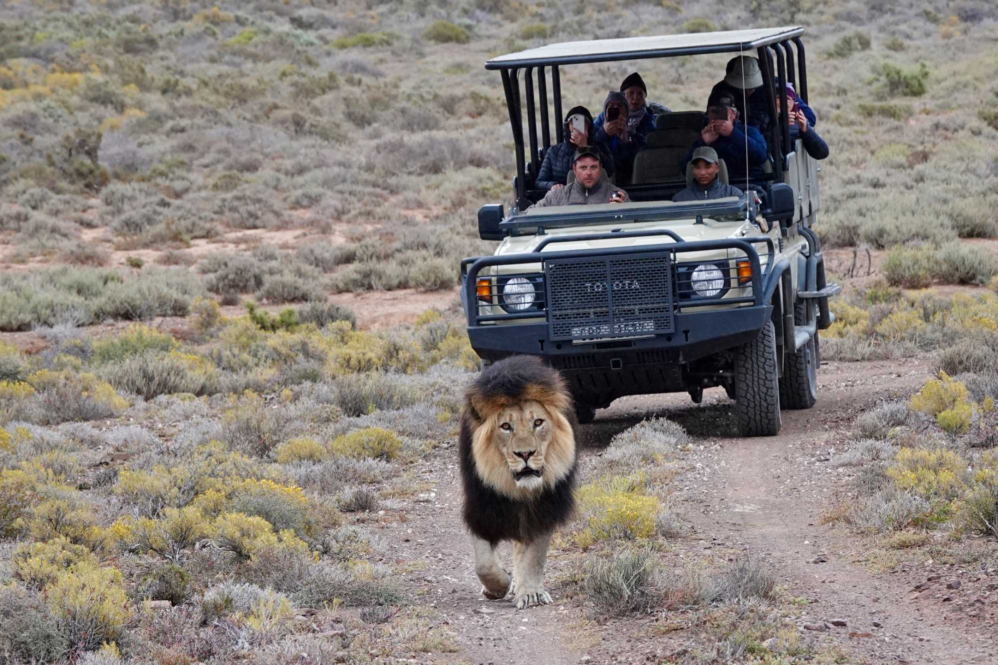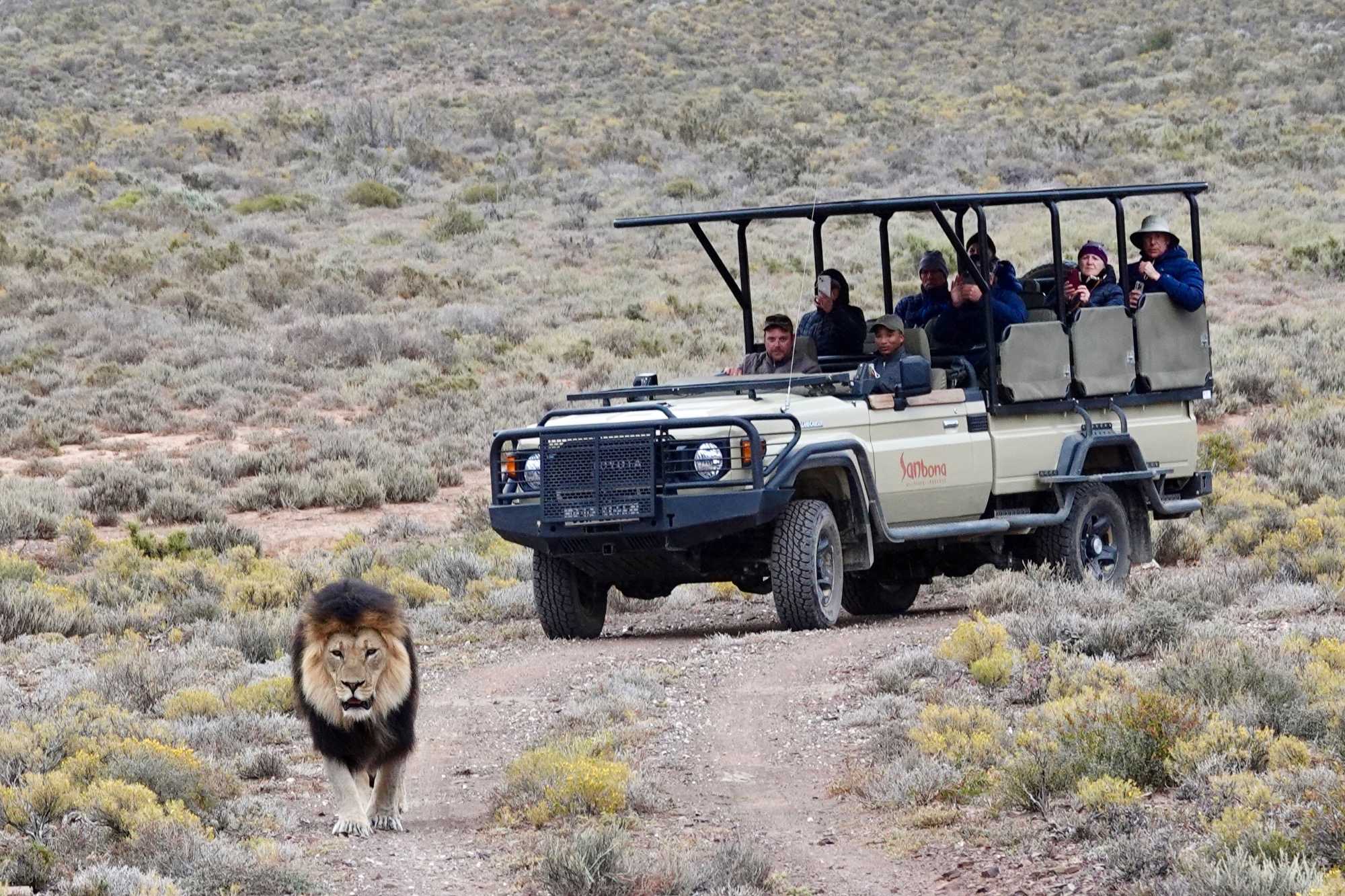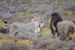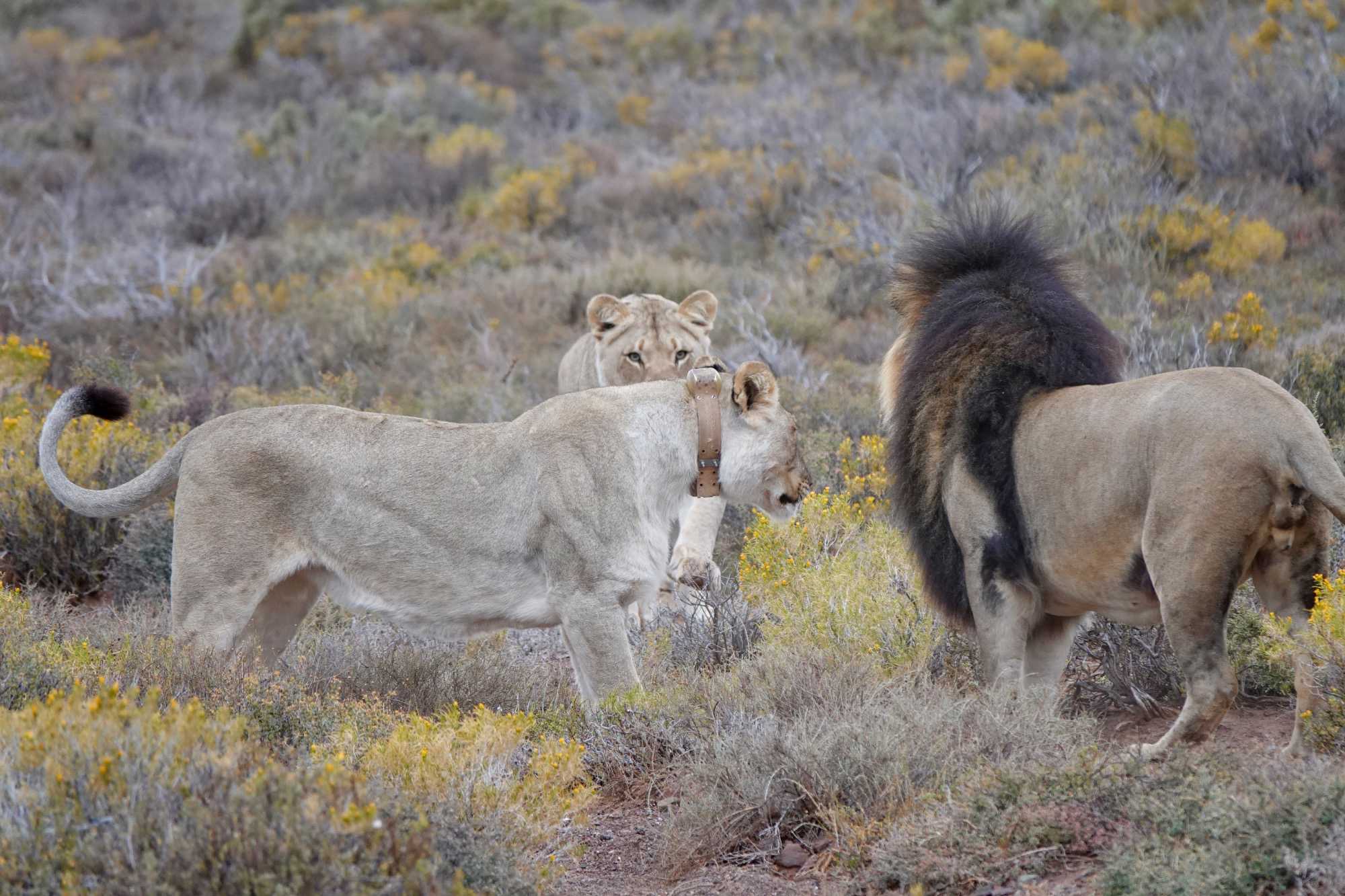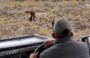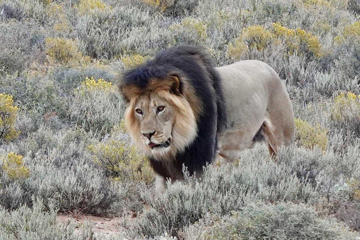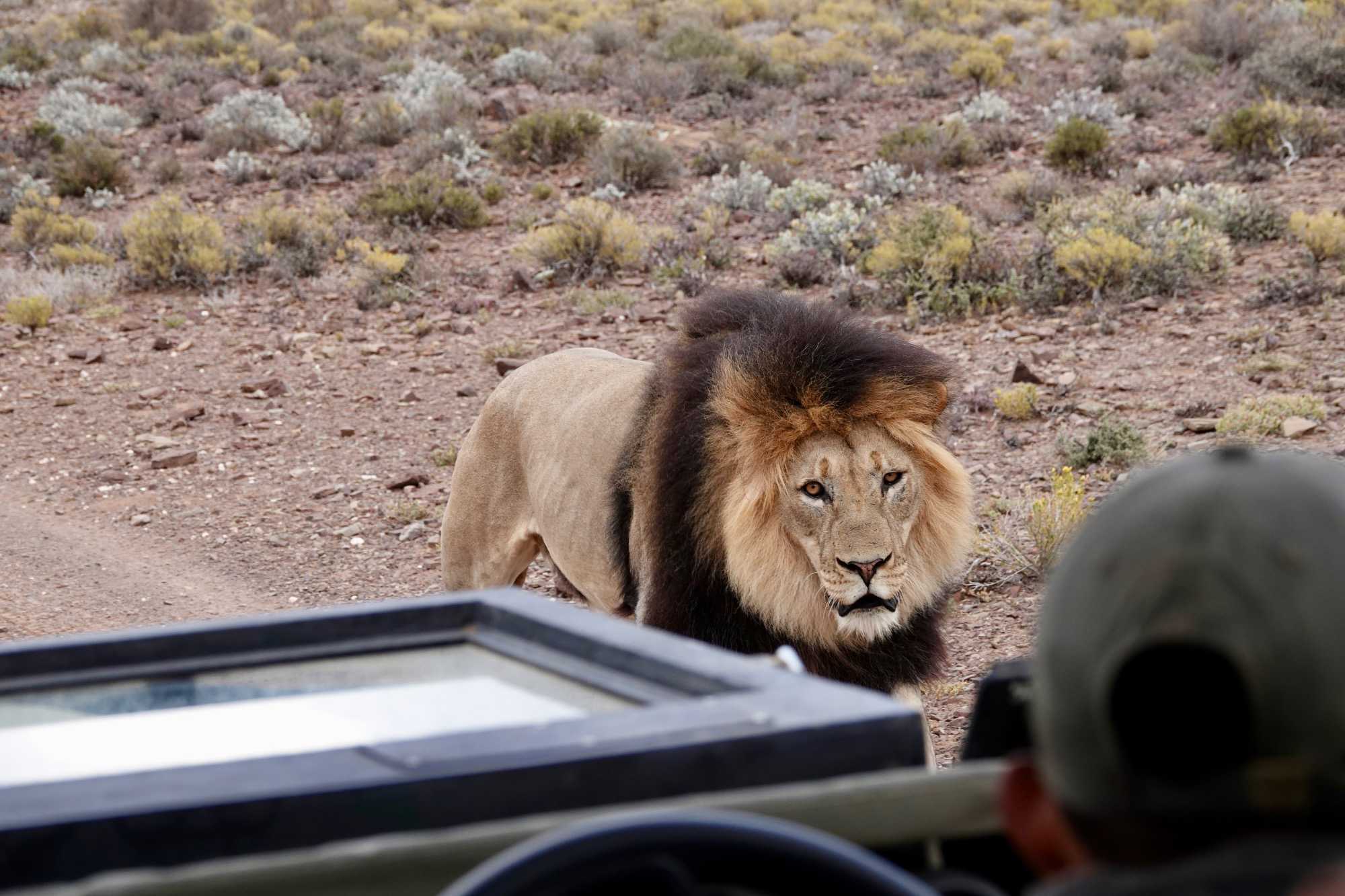 Un peu plus loin, nos guides repèrent deux lionnes qui avancent dans notre direction. Nous comprenons vite que nous allons assister à leurs retrouvailles. Les lionnes étaient parties chasser depuis quelques semaines et reviennent enfin vers le mâle. Ce fut un moment magique et bouleversant : accolades, frottements de tête, gestes tendres… Un spectacle d’une beauté rare, empreint de puissance et de grâce. ❤️Nos guides nous apprennent que la réserve de Sanbona abrite seulement trois lions : un mâle et deux femelles. Les lionnes sont placées sous contraception pour éviter la consanguinité, car la population est volontairement limitée pour préserver l’équilibre naturel du territoire. Nous avons donc été les chanceux qui ont eu la chance de voir toute la famille réunie — un moment que nous n’oublierons jamais. 🦁