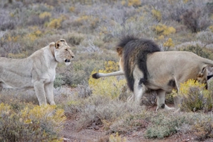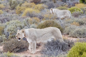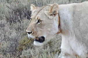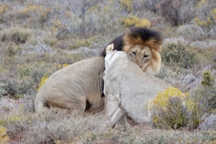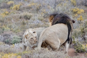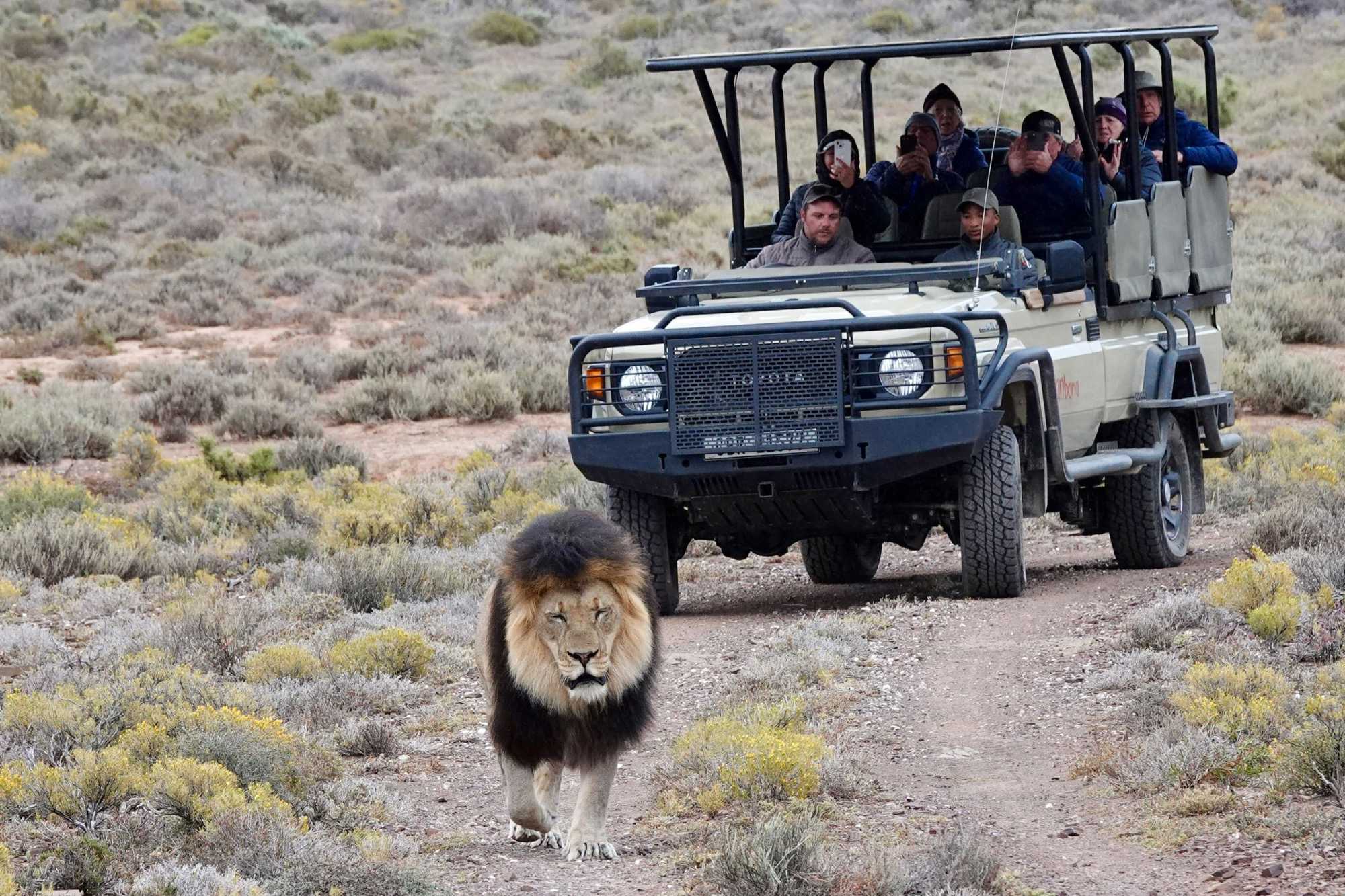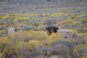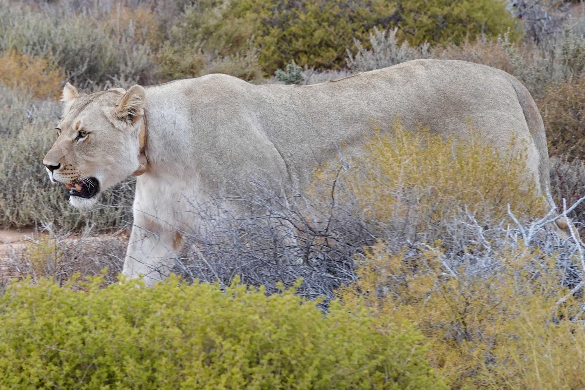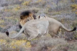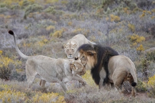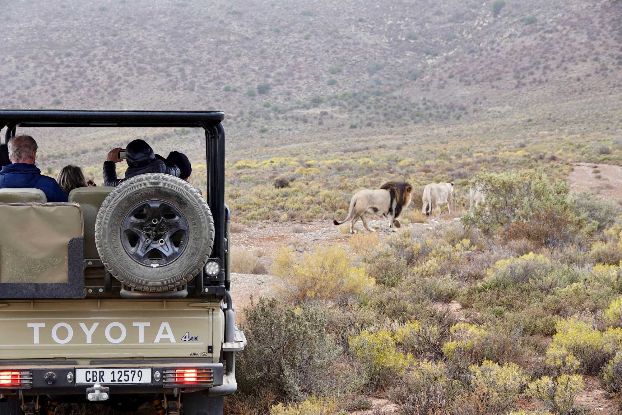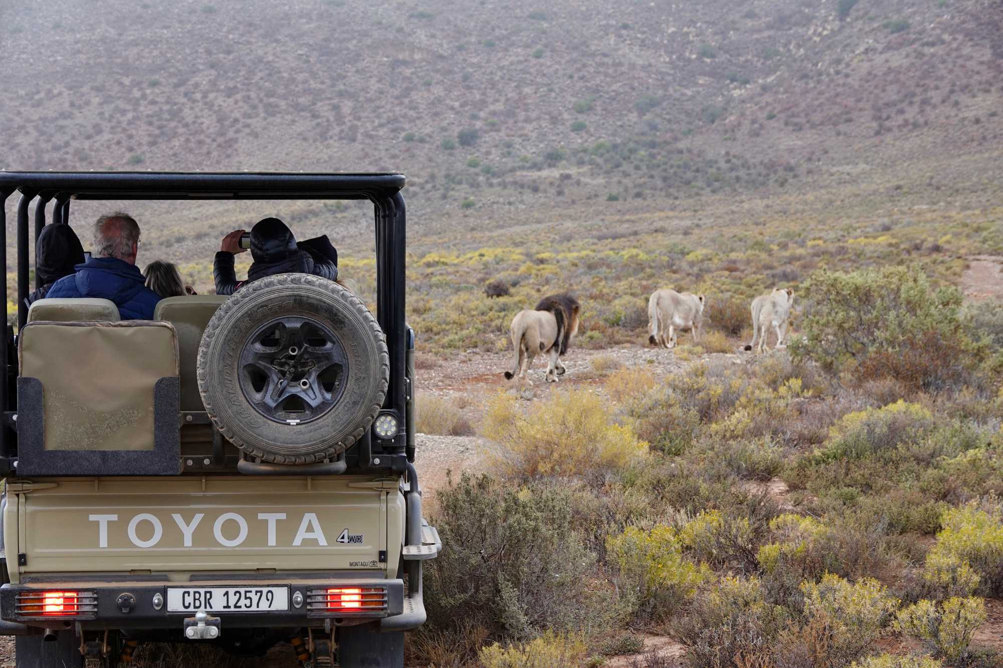 Un peu plus loin, nos guides repèrent deux lionnes qui avancent dans notre direction. Nous comprenons vite que nous allons assister à leurs retrouvailles. Les lionnes étaient parties chasser depuis quelques semaines et reviennent enfin vers le mâle. Ce fut un moment magique et bouleversant : accolades, frottements de tête, gestes tendres… Un spectacle d’une beauté rare, empreint de puissance et de grâce. ❤️Nos guides nous apprennent que la réserve de Sanbona abrite seulement trois lions : un mâle et deux femelles. Les lionnes sont placées sous contraception pour éviter la consanguinité, car la population est volontairement limitée pour préserver l’équilibre naturel du territoire. Nous avons donc été les chanceux qui ont eu la chance de voir toute la famille réunie — un moment que nous n’oublierons jamais. 🦁
