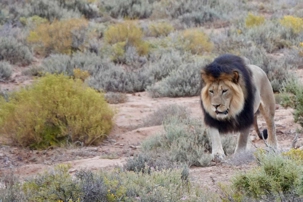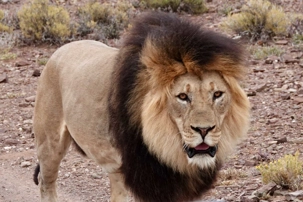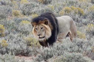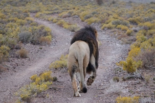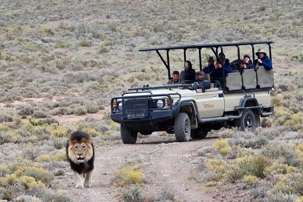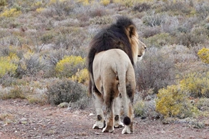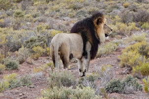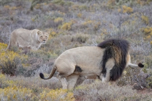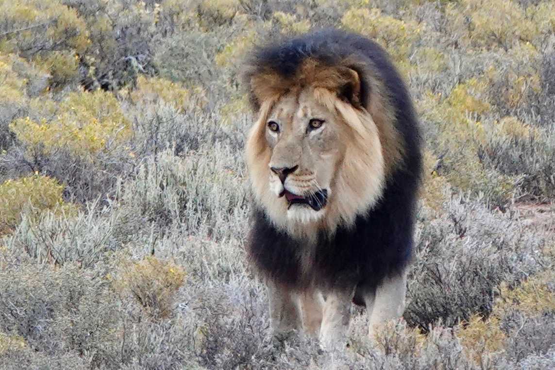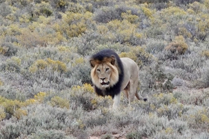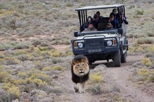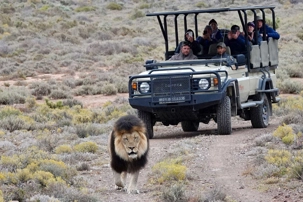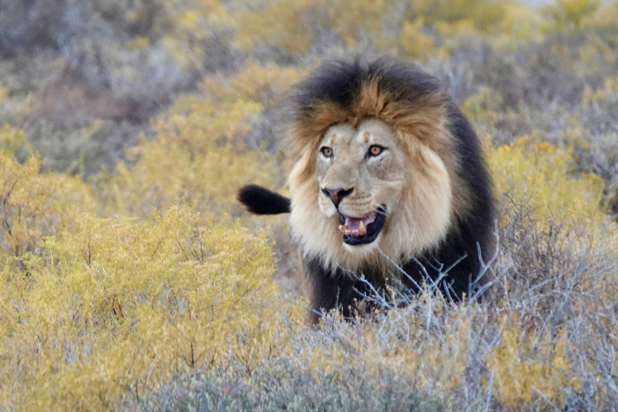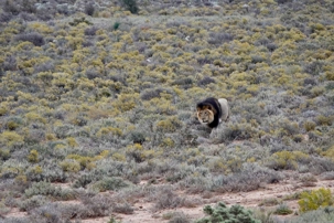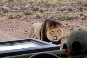 Et soudain, le moment tant attendu : le lion apparaît. Un mâle superbe, à la crinière épaisse et dorée, descend lentement de la colline avec une allure majestueuse. Il marche d’un pas tranquille, totalement indifférent à la présence de nos trois jeeps — les seules de la réserve à cet instant. Quelle chance d’être seuls au monde, témoins de cette scène !