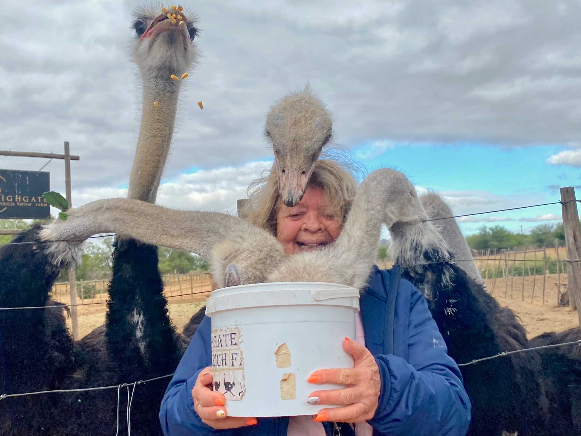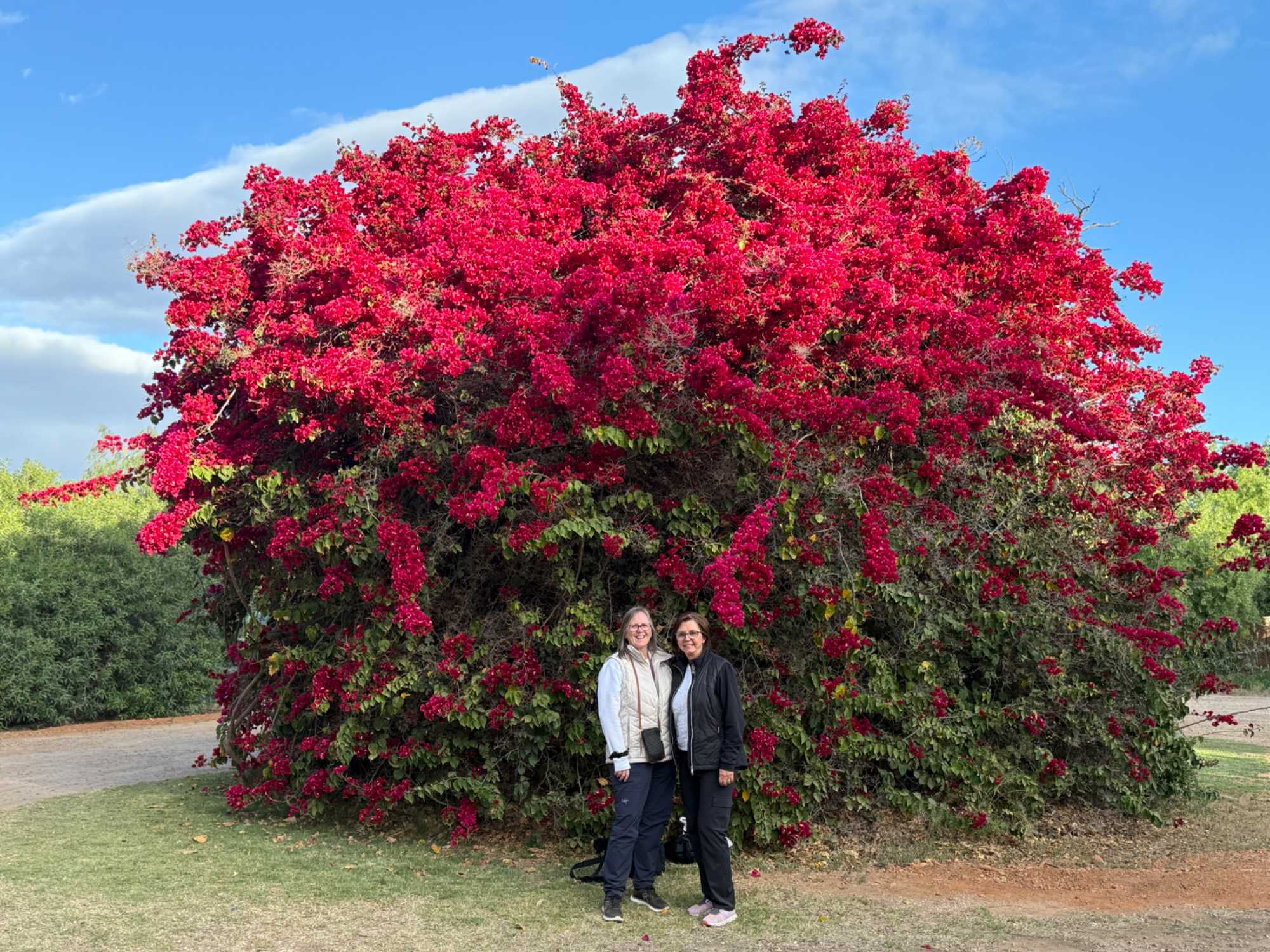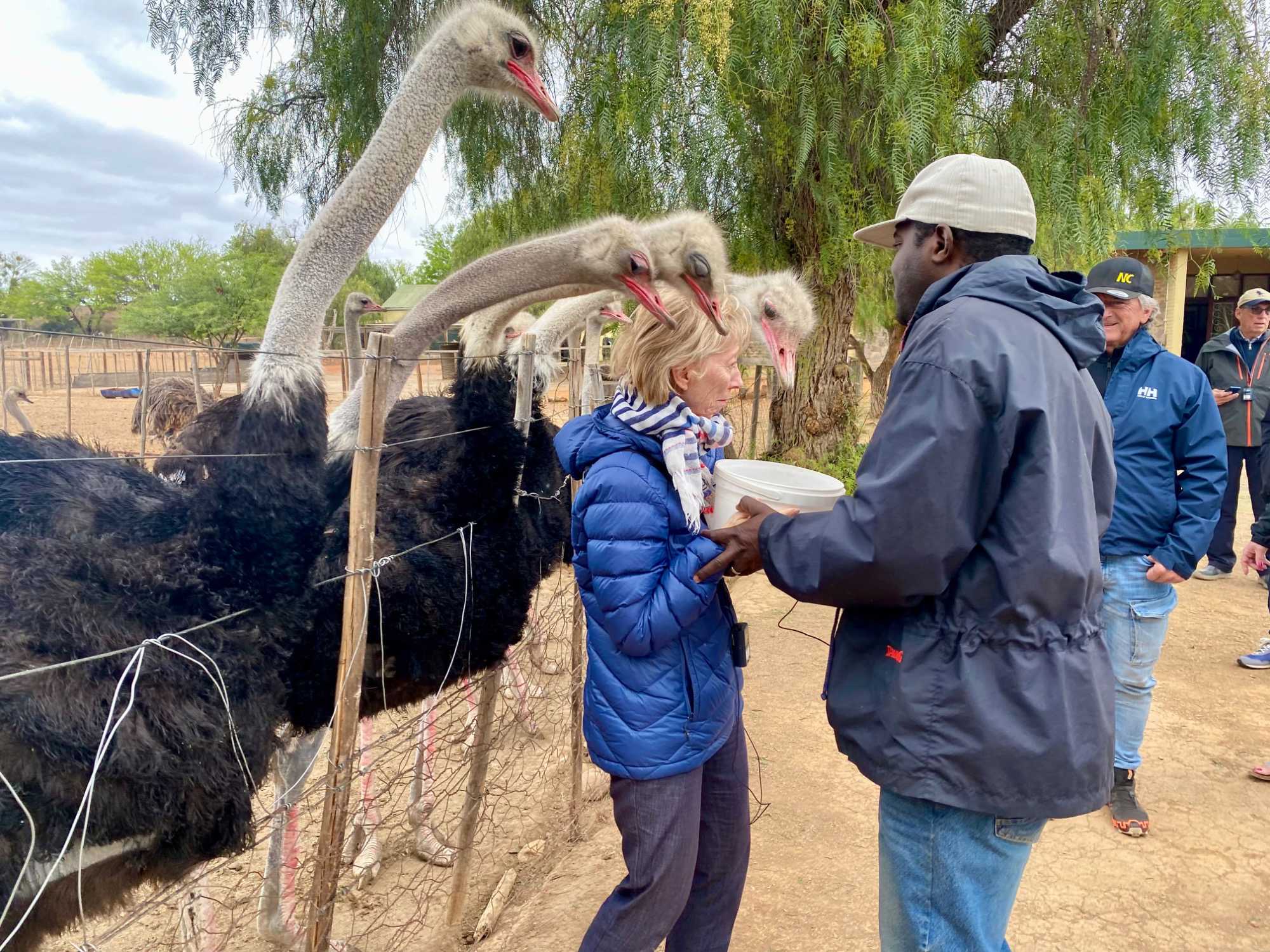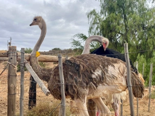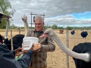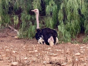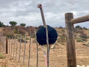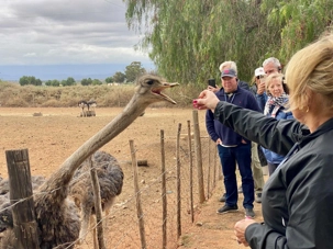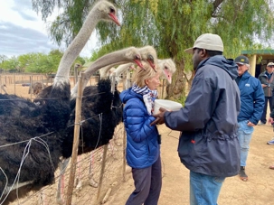 L’après-midi fut consacré à la visite d’une ferme d’élevage d’autruches, emblématique de la région. Nous y découvrons ces oiseaux majestueux, des poussins fragiles et des œufs incroyablement solides sur lesquels on peut même se tenir debout ! 🥚 Ce fut une visite à la fois amusante et fascinante, ponctuée d’explications sur la reproduction, l’incubation et les soins apportés aux jeunes oiseaux. Et comment oublier ce splendide bougainvillier rouge, immense et éclatant, qui ornait l’entrée de la ferme ? 🌺 Un véritable tableau vivant qui nous a tous charmés. Certains voyageurs en ont profité pour faire quelques achats souvenirs — plumes, objets décoratifs, ou articles en cuir d’autruche — avant de reprendre la route.