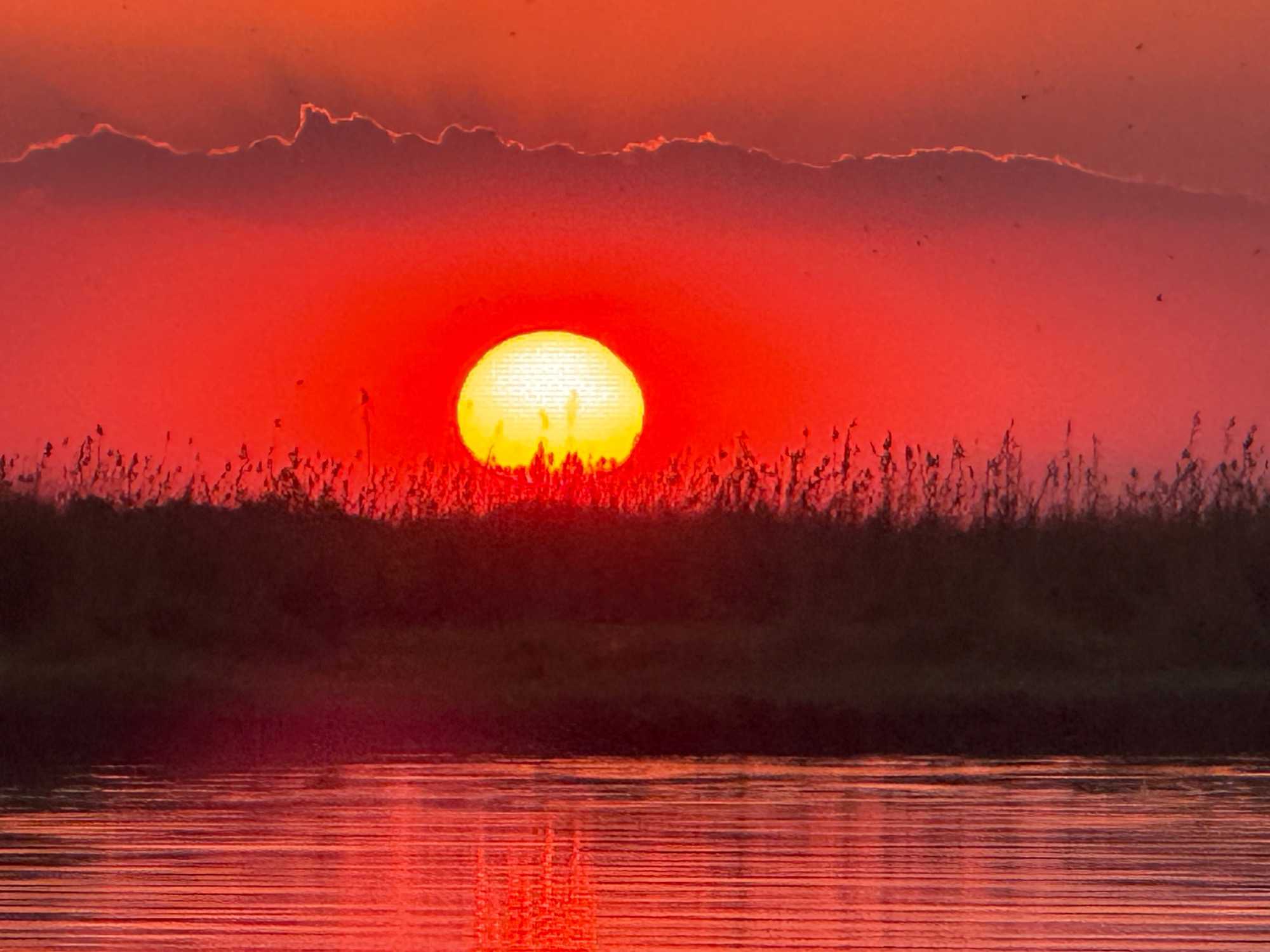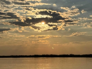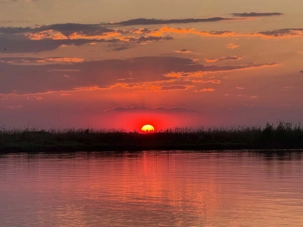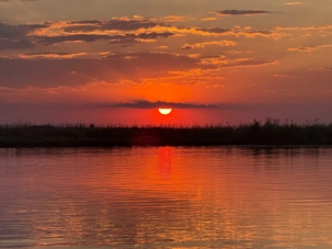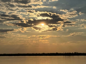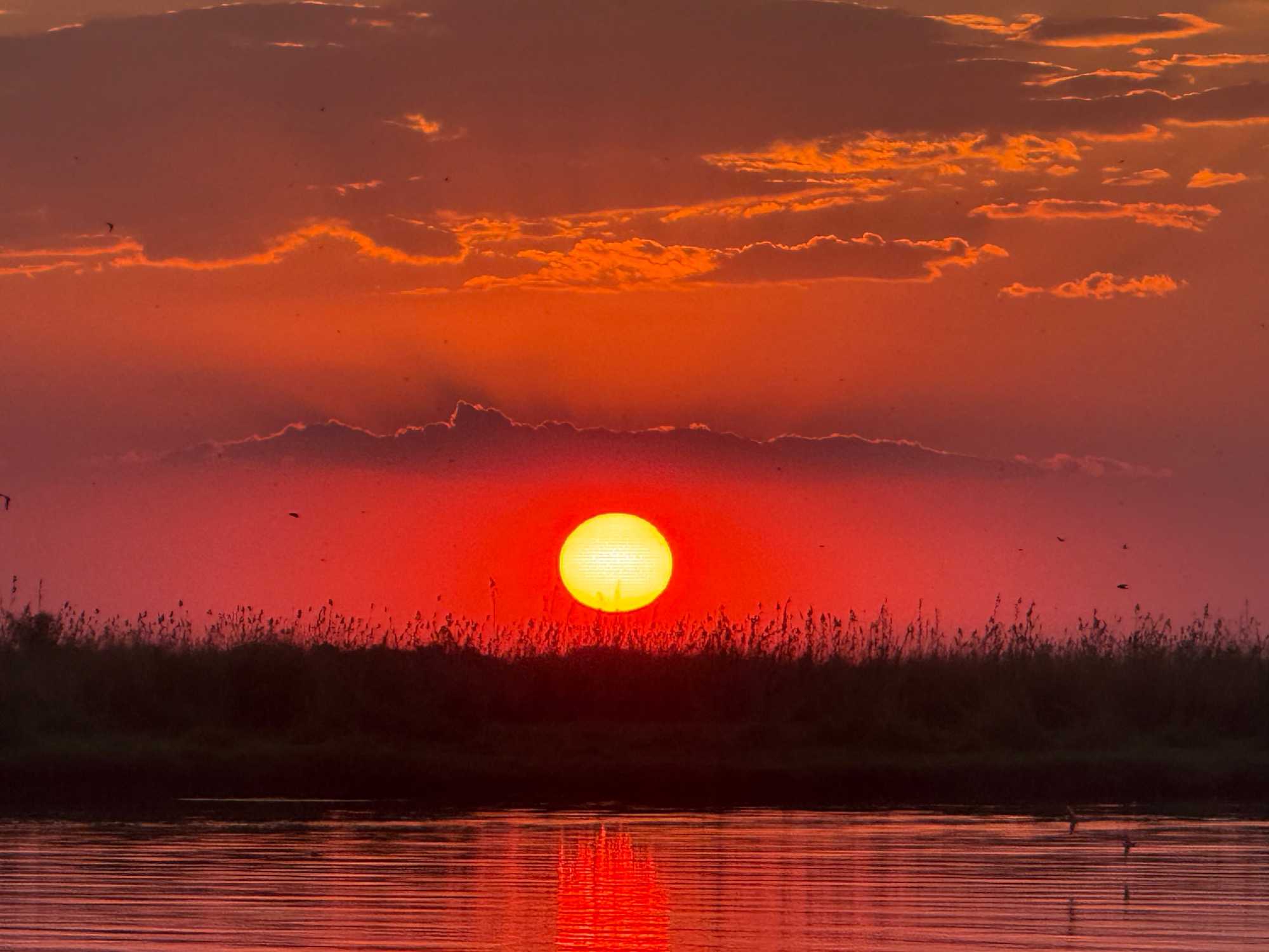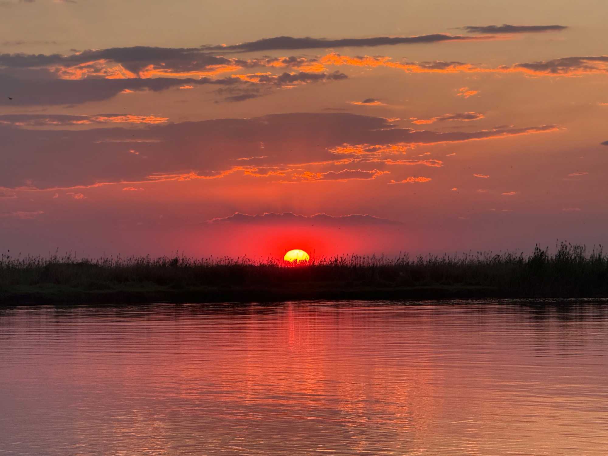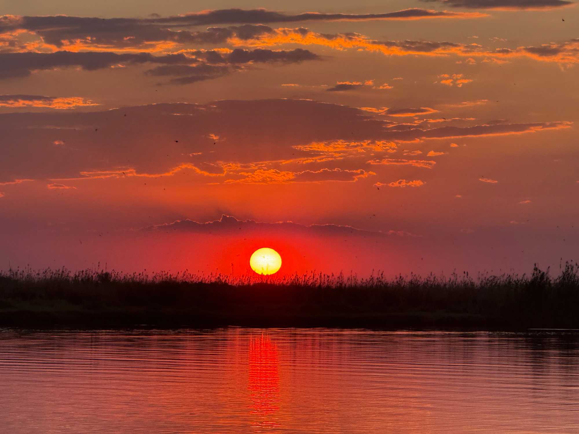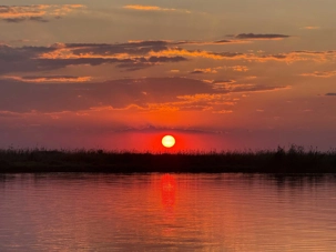 Et soudain… le moment magique ✨ : le soleil d’Afrique, immense et flamboyant, a lentement plongé dans les eaux du fleuve. Le ciel s’est embrasé de teintes dorées, orangées et pourpres, illuminant chaque regard.