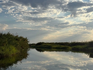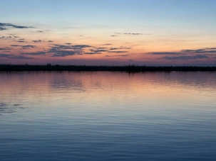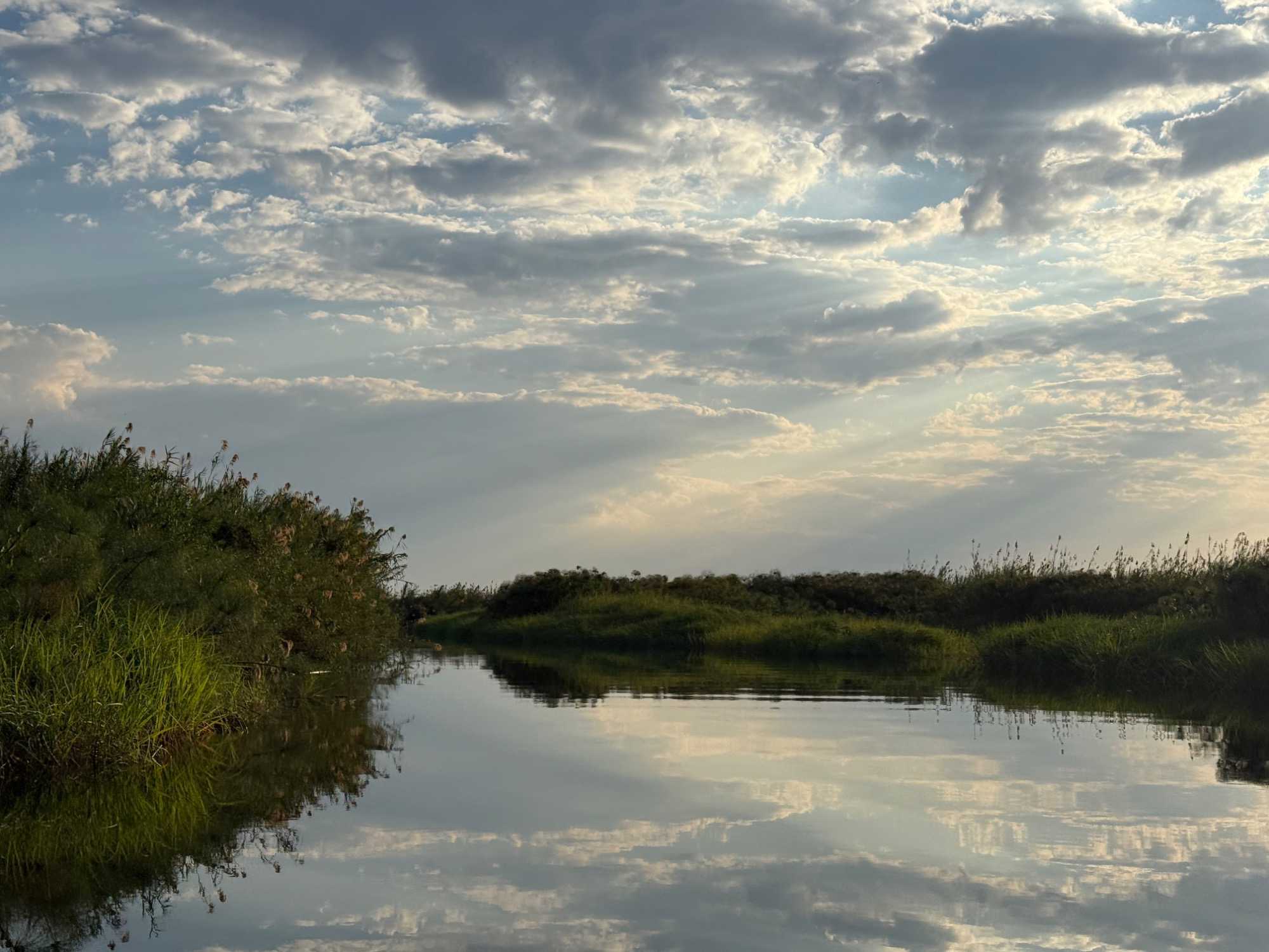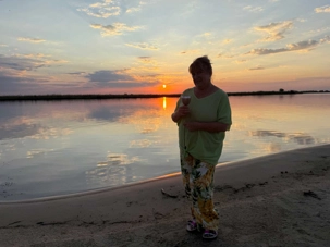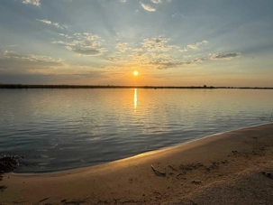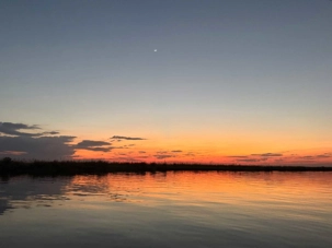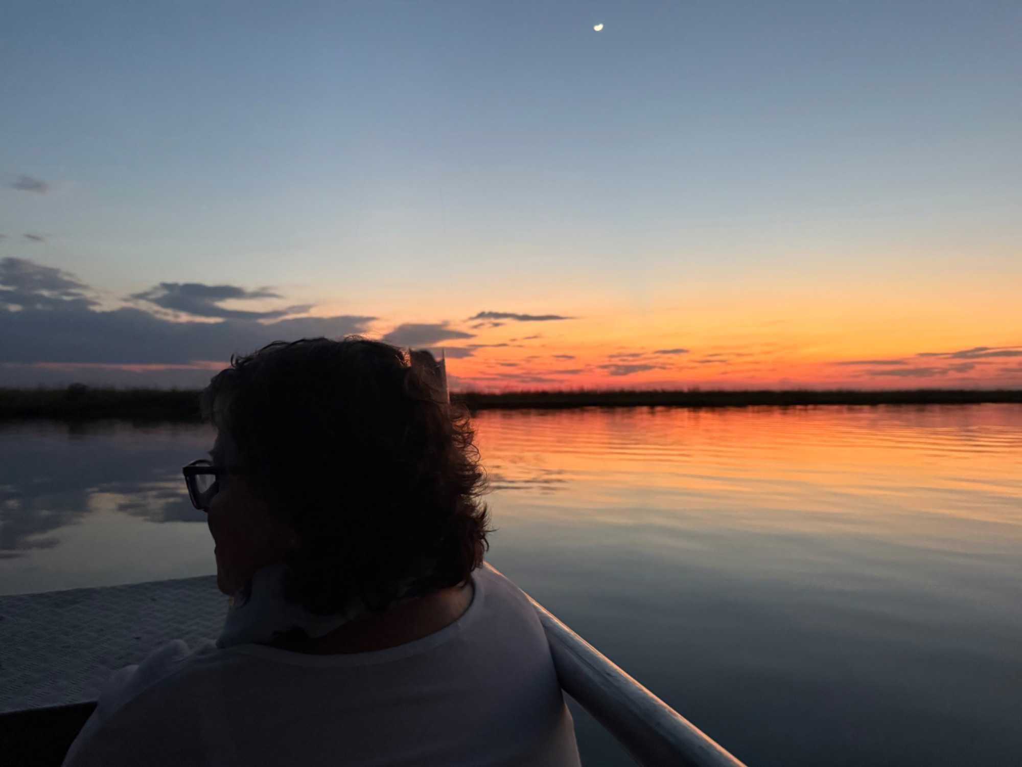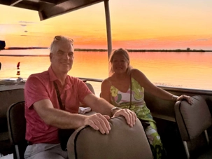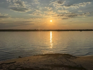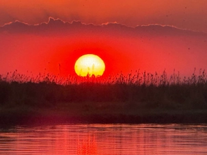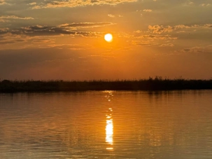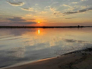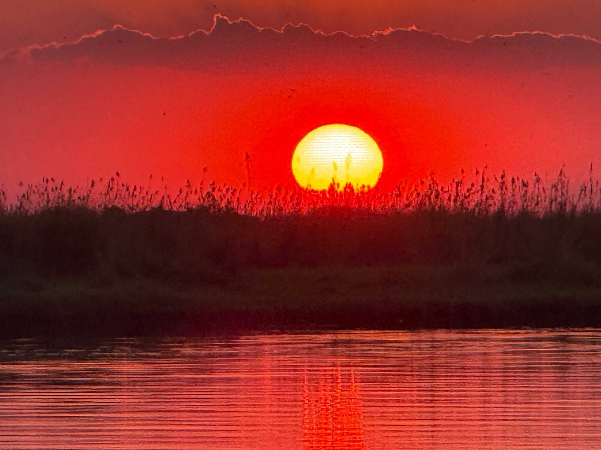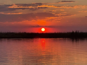 Et soudain… le moment magique ✨ : le soleil d’Afrique, immense et flamboyant, a lentement plongé dans les eaux du fleuve. Le ciel s’est embrasé de teintes dorées, orangées et pourpres, illuminant chaque regard.