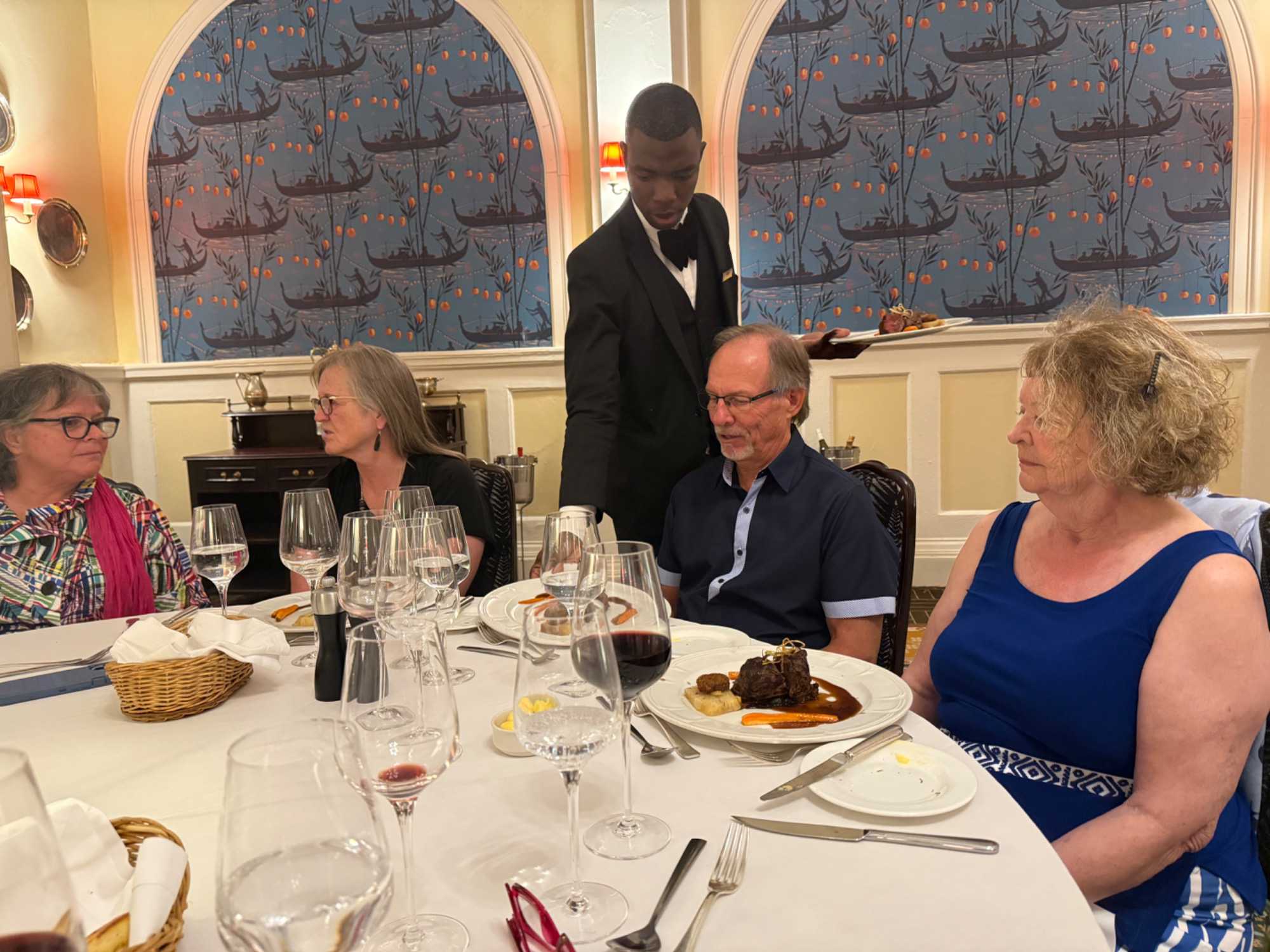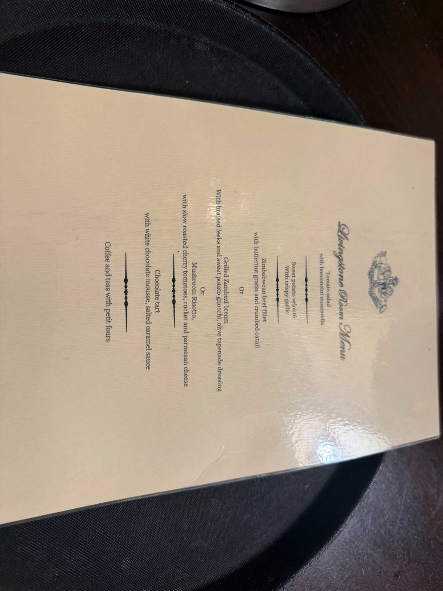 En fin d’après-midi, vers 19 h, nous repartons pour notre souper au mythique Victoria Falls Hotel, véritable institution du Zimbabwe 🇿🇼. Fondé en 1904, cet hôtel historique évoque à merveille l’époque des grands explorateurs et l’élégance coloniale de la région. Ses jardins et ses galeries respirent l’histoire, et sa vue sur les gorges du Zambèze est tout simplement spectaculaire 🌄. Nous prenons le souper dans la grande salle à manger Livingstone, un lieu noble et chaleureux, où un pianiste 🎶 accompagne le repas de douces mélodies. Le dîner, raffiné et servi avec soin, s’est déroulé dans une ambiance conviviale et détendue. Un magnifique moment de partage et de gastronomie, avant de regagner notre hôtel pour une nuit paisible 🌙 après cette superbe journée.
