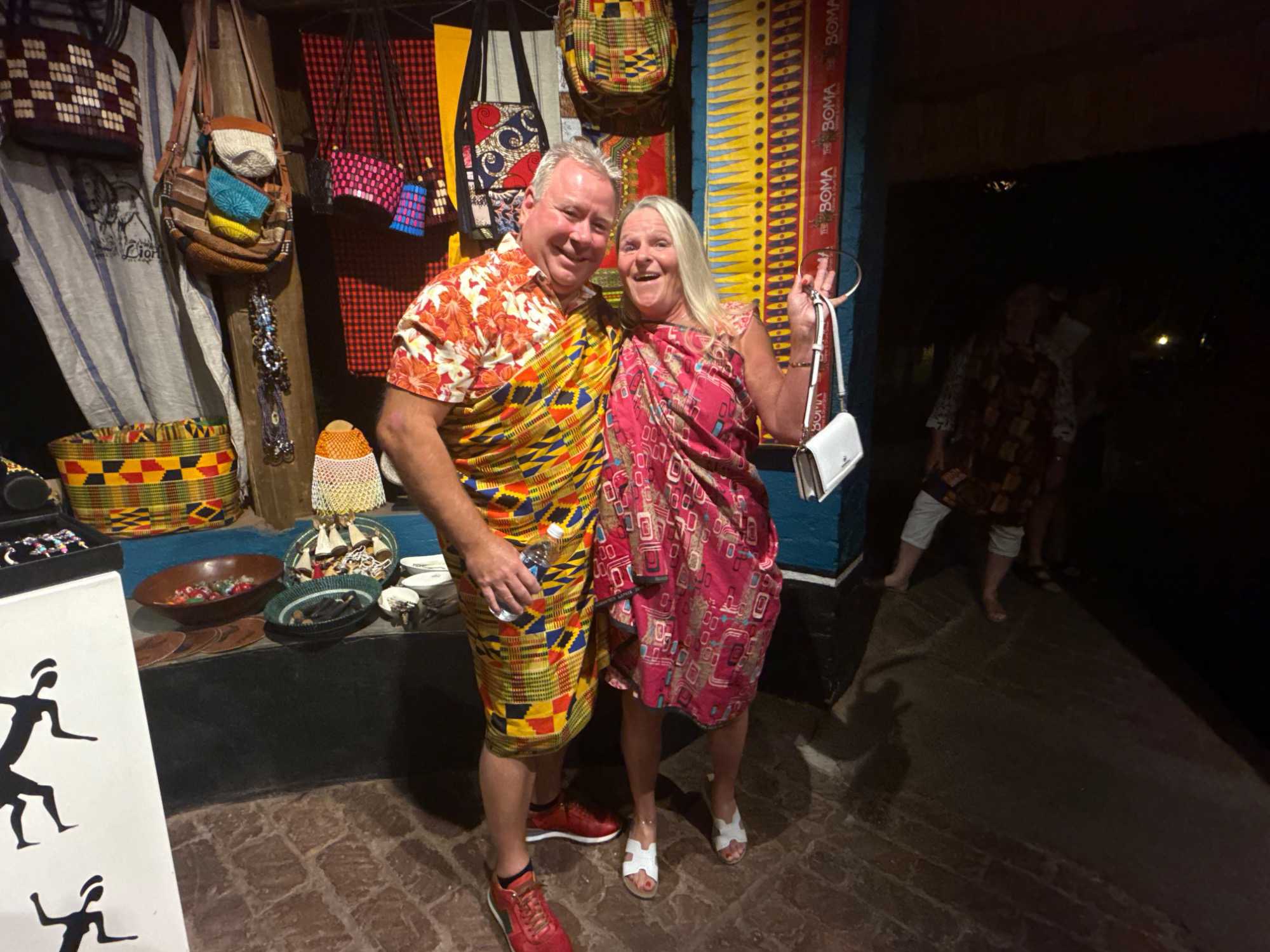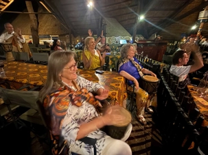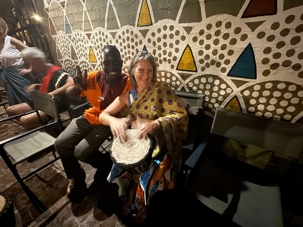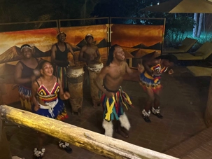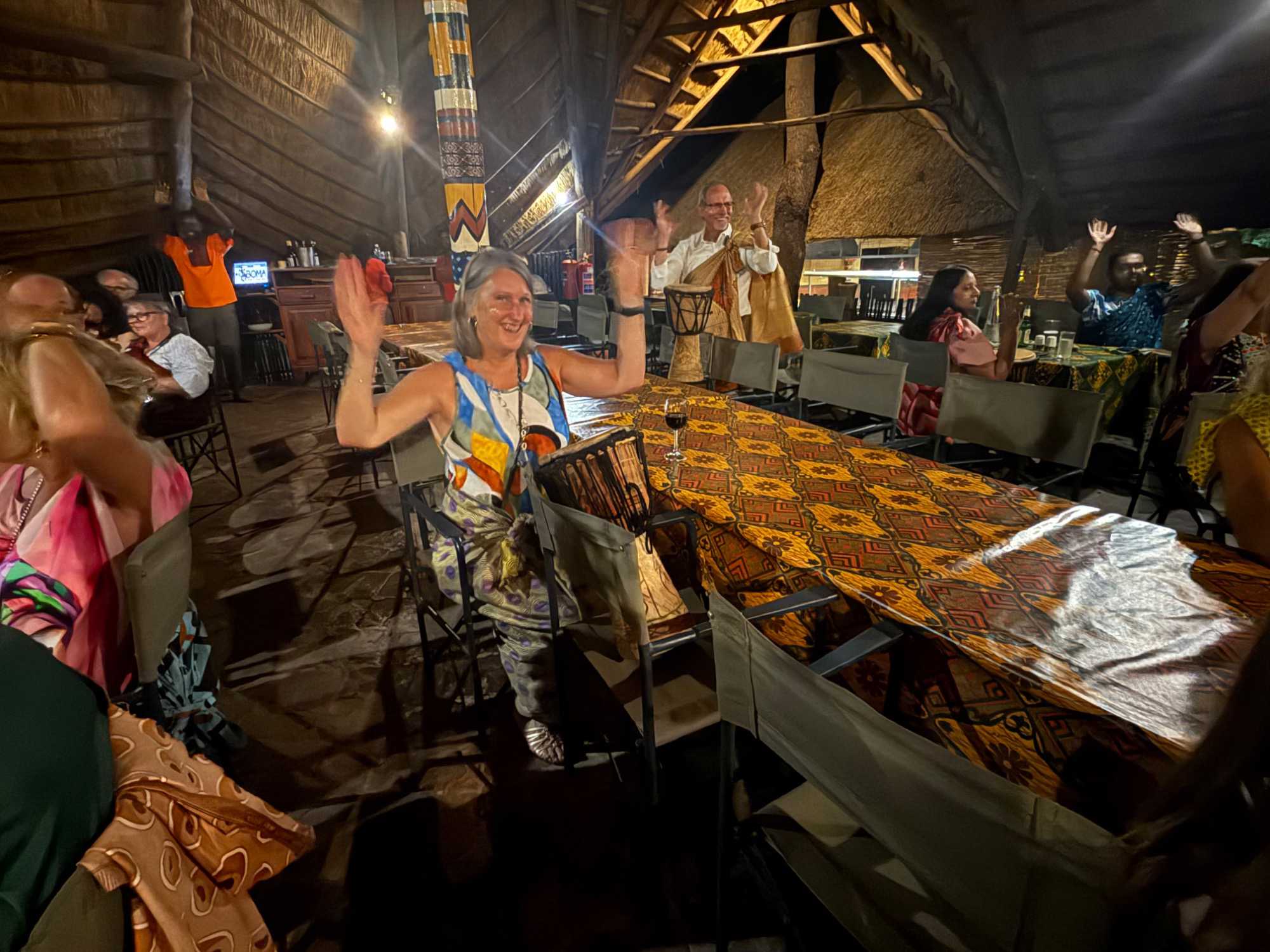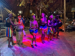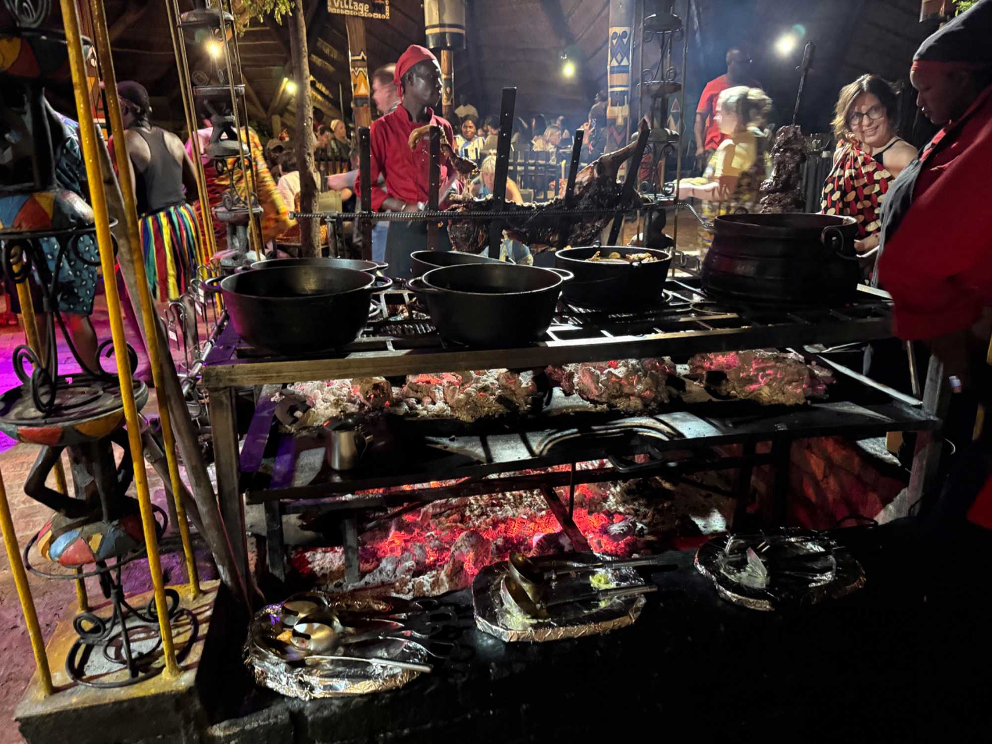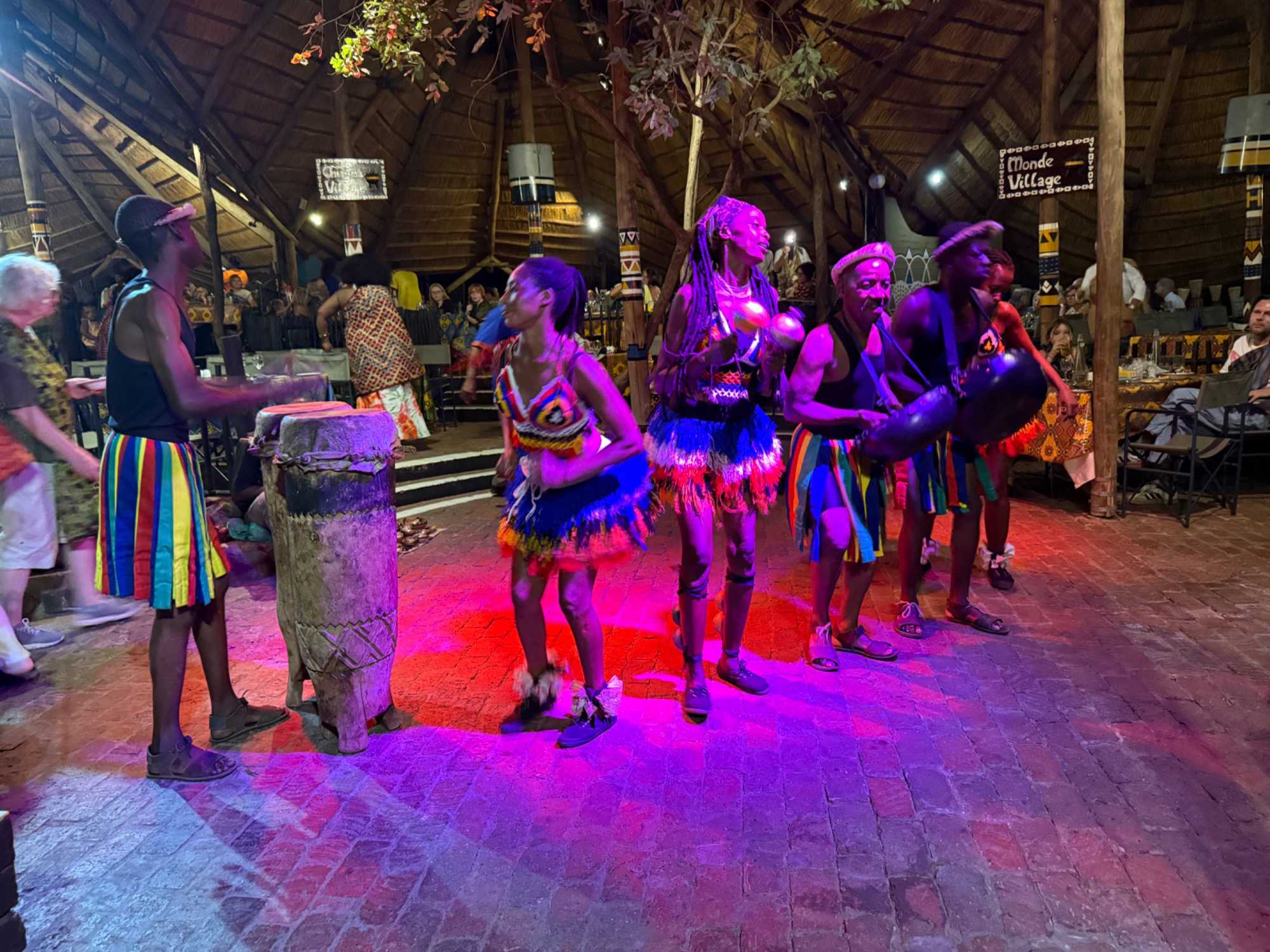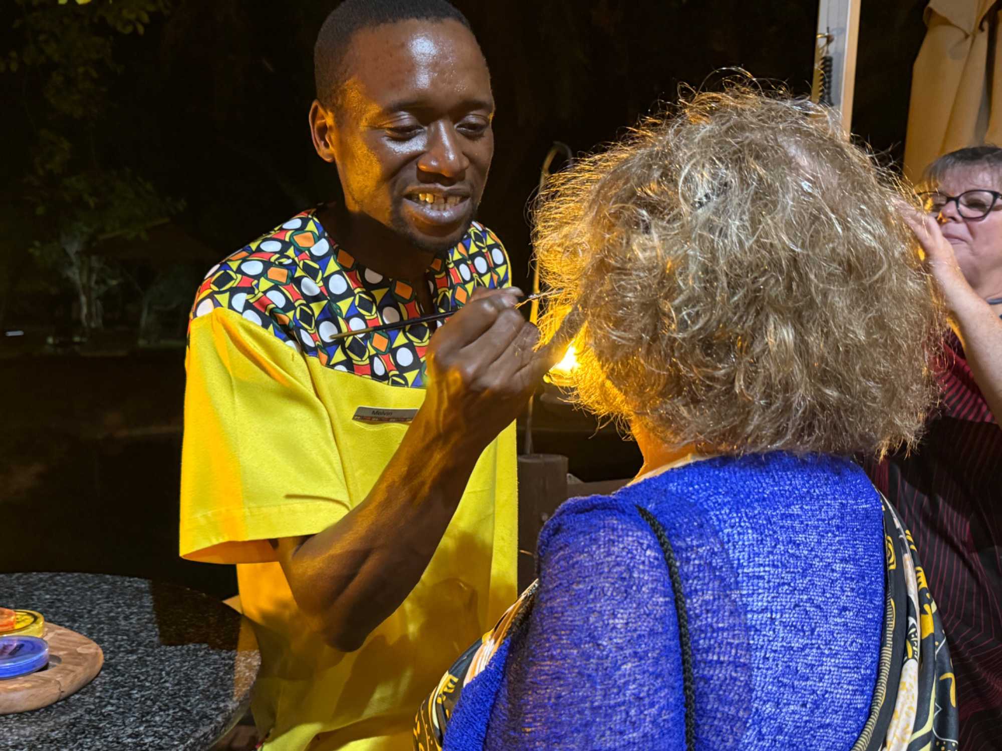 À notre arrivée, chacun a reçu un petit costume traditionnel, et un signe symbolique a été dessiné sur la joue — un joli rituel d’accueil aux accents de fête 🌺. Le site était superbe : lumières tamisées, tambours, chants africains et un immense buffet proposant une variété incroyable de plats locaux. Certains ont osé goûter à la viande sauvage et même au crocodile 🐊 !