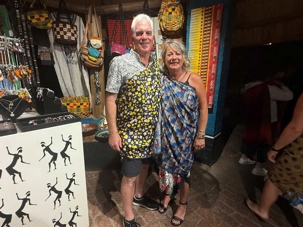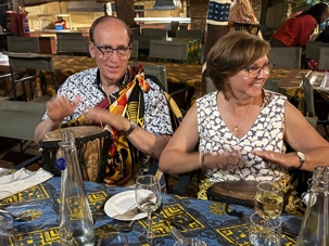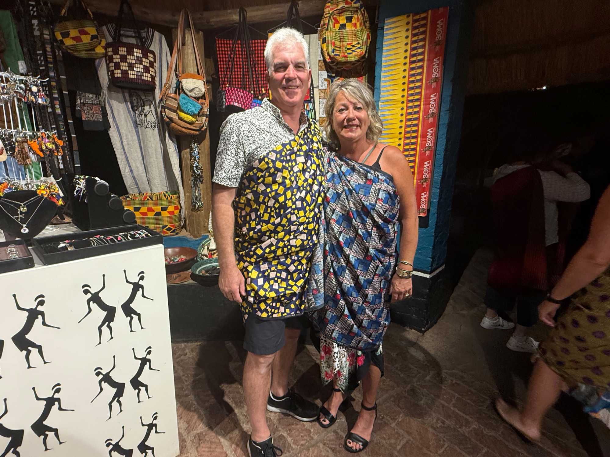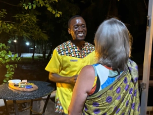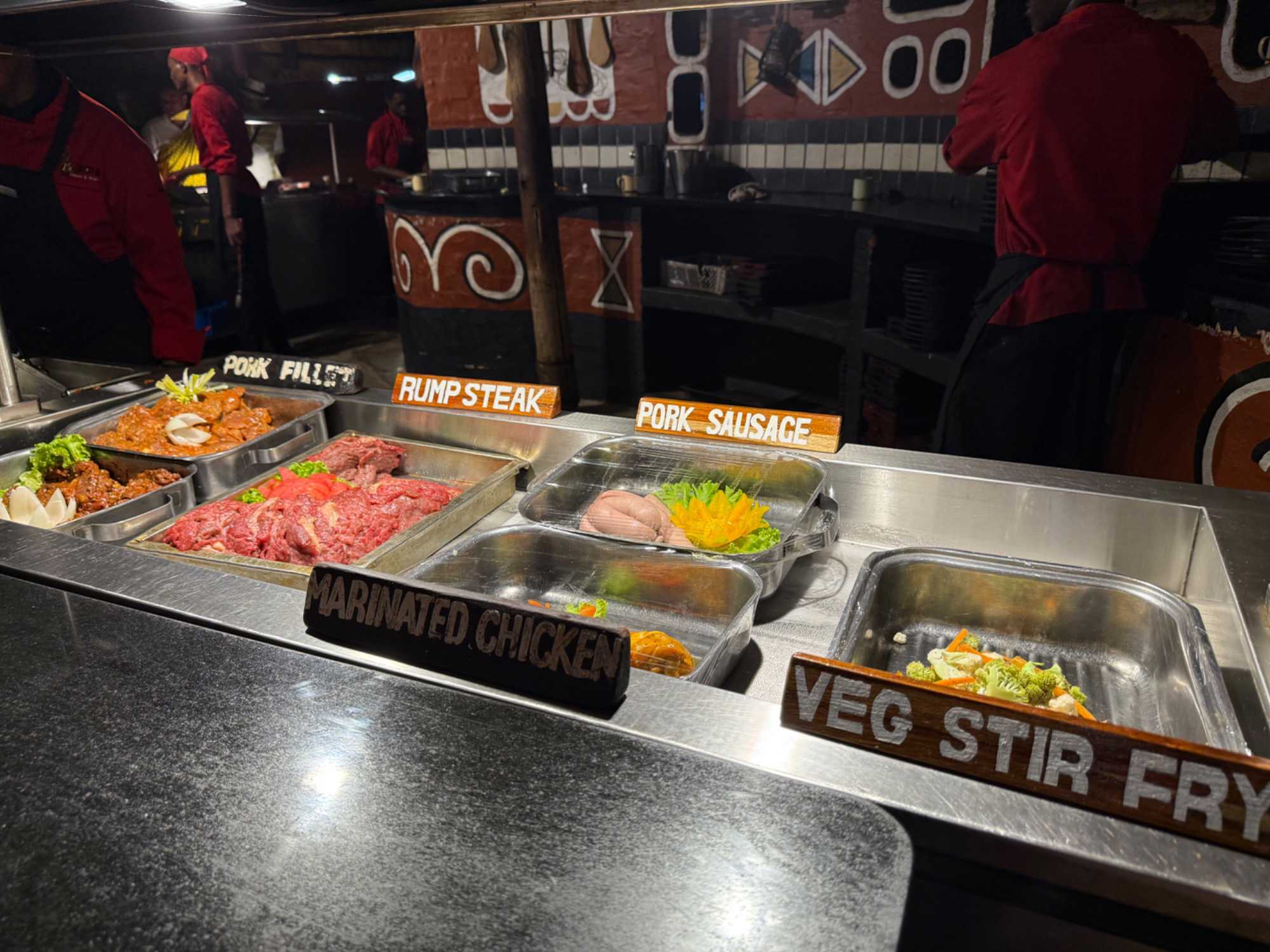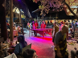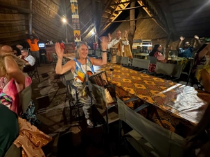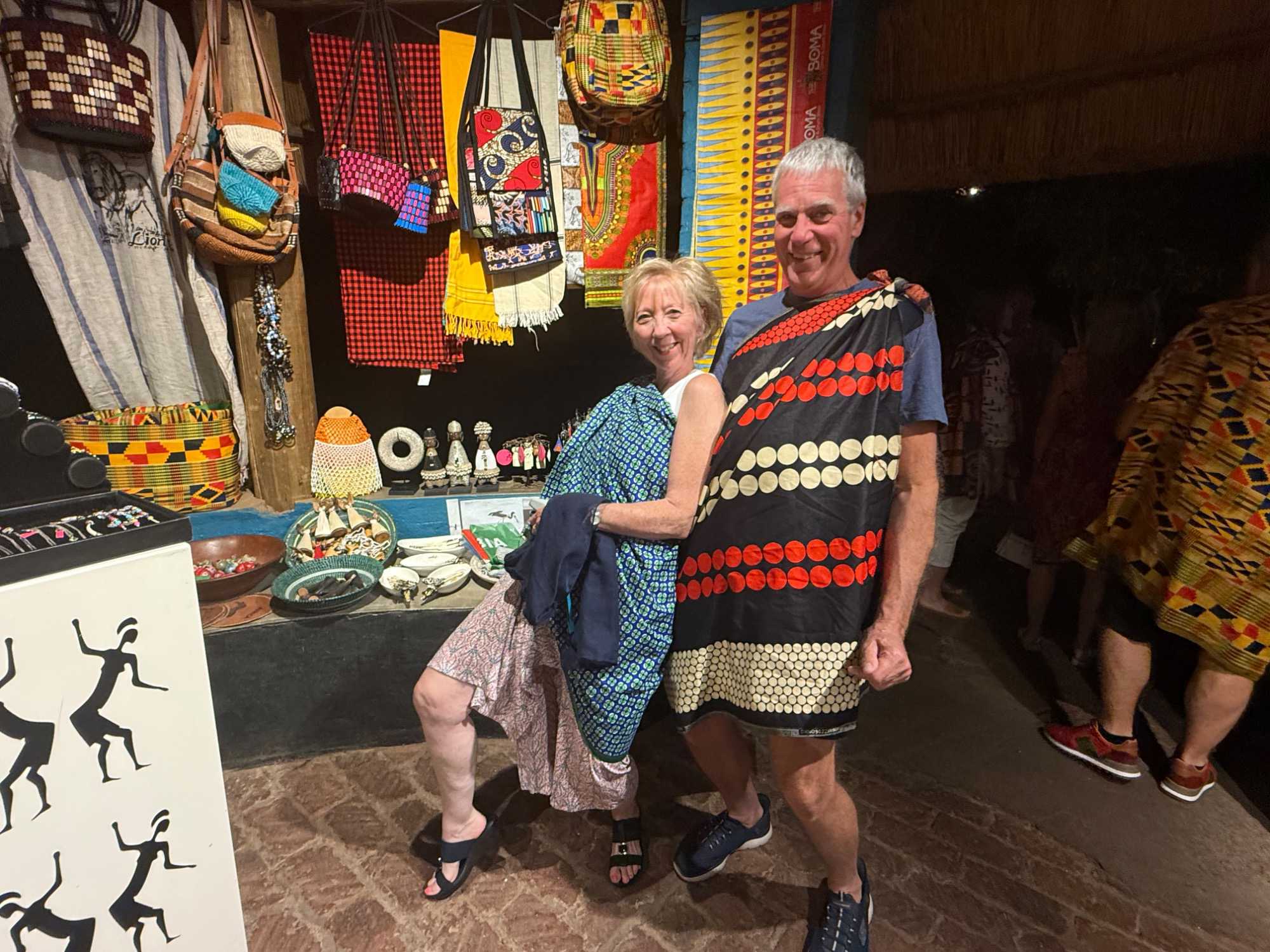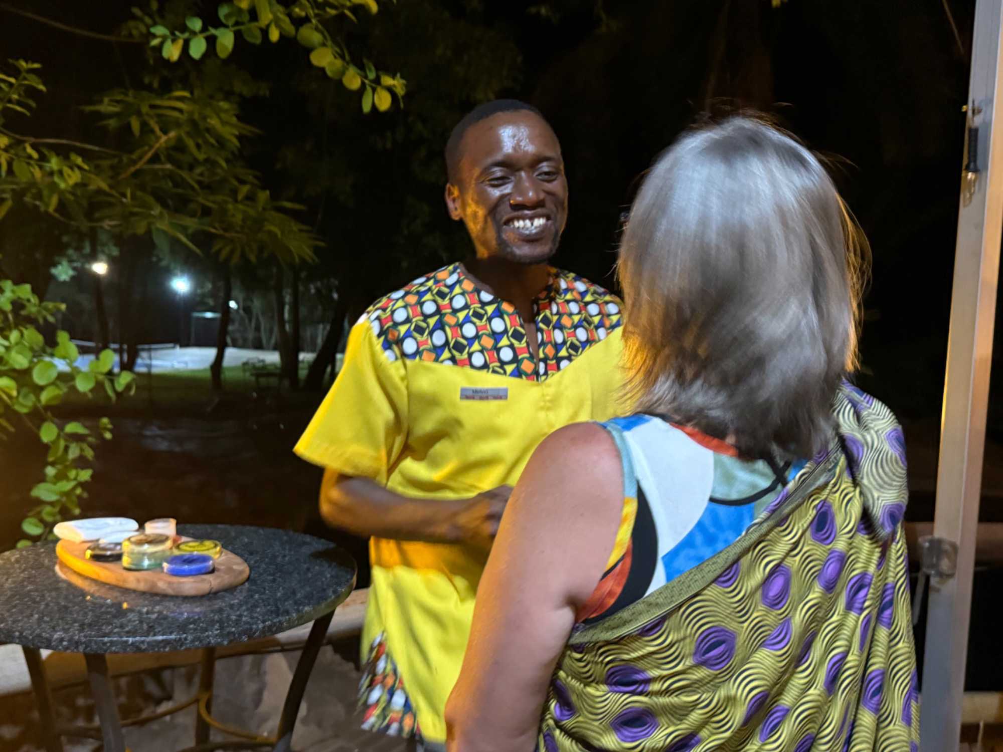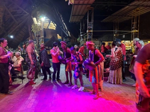 À notre arrivée, chacun a reçu un petit costume traditionnel, et un signe symbolique a été dessiné sur la joue — un joli rituel d’accueil aux accents de fête 🌺. Le site était superbe : lumières tamisées, tambours, chants africains et un immense buffet proposant une variété incroyable de plats locaux. Certains ont osé goûter à la viande sauvage et même au crocodile 🐊 !