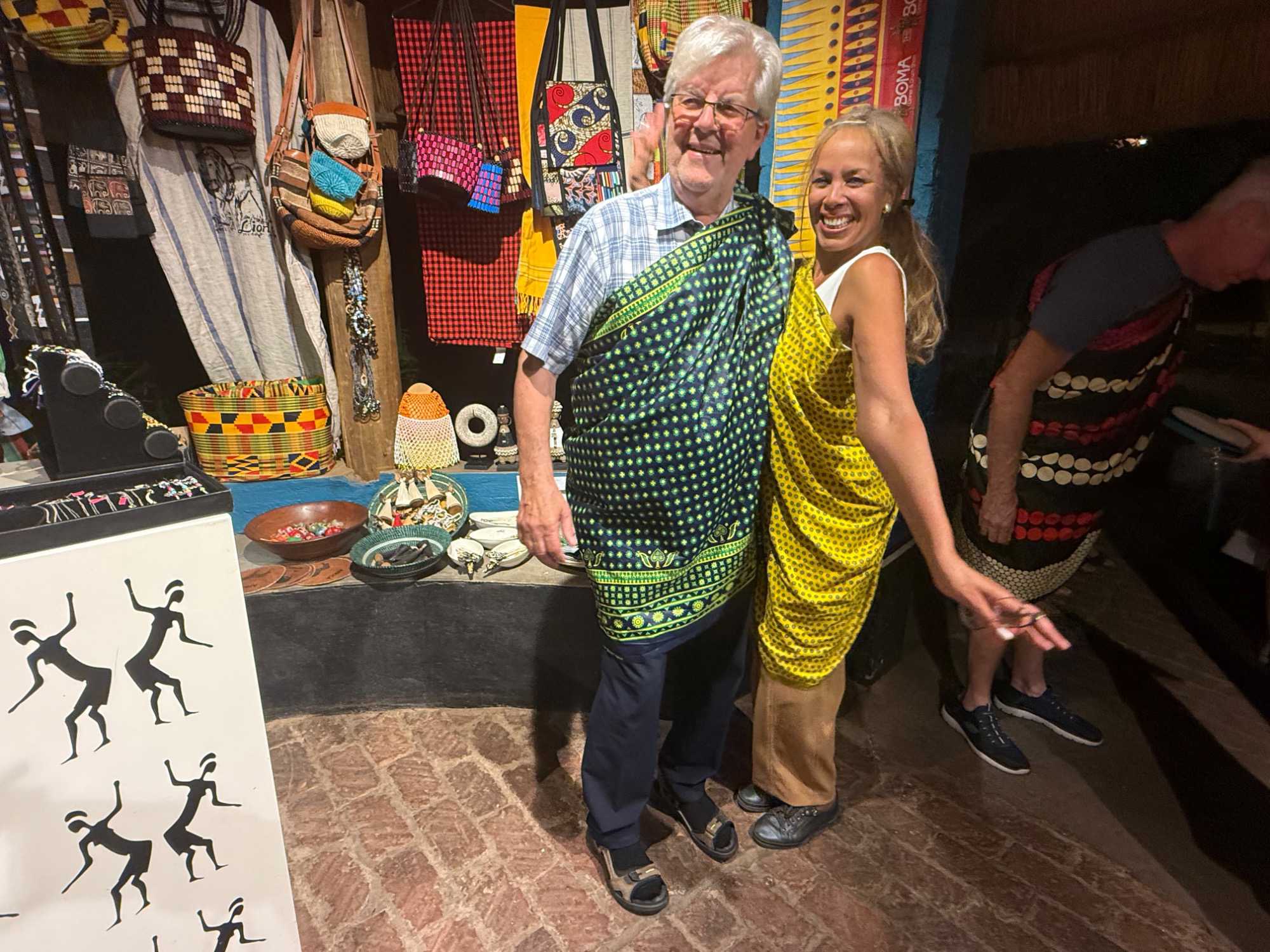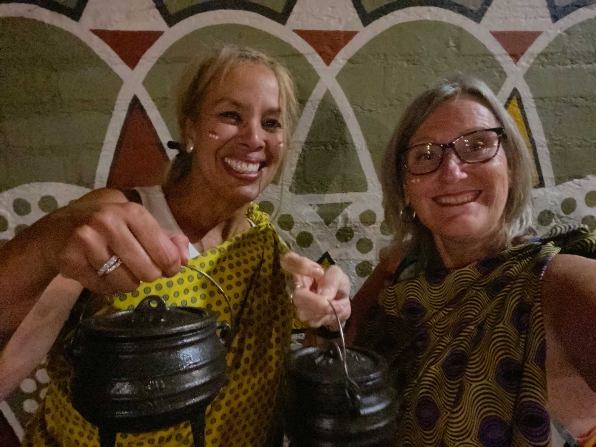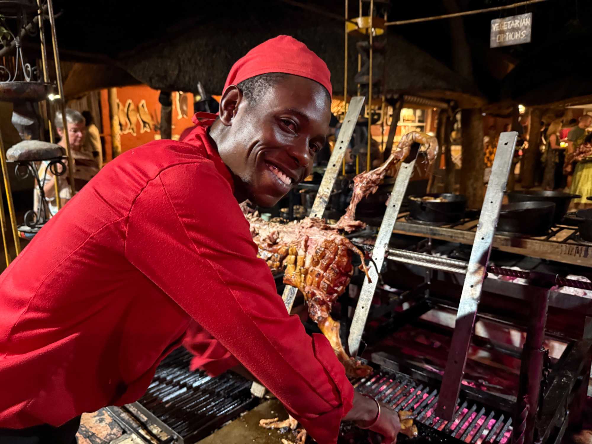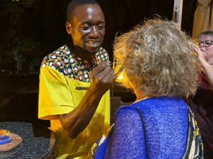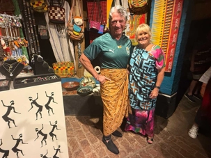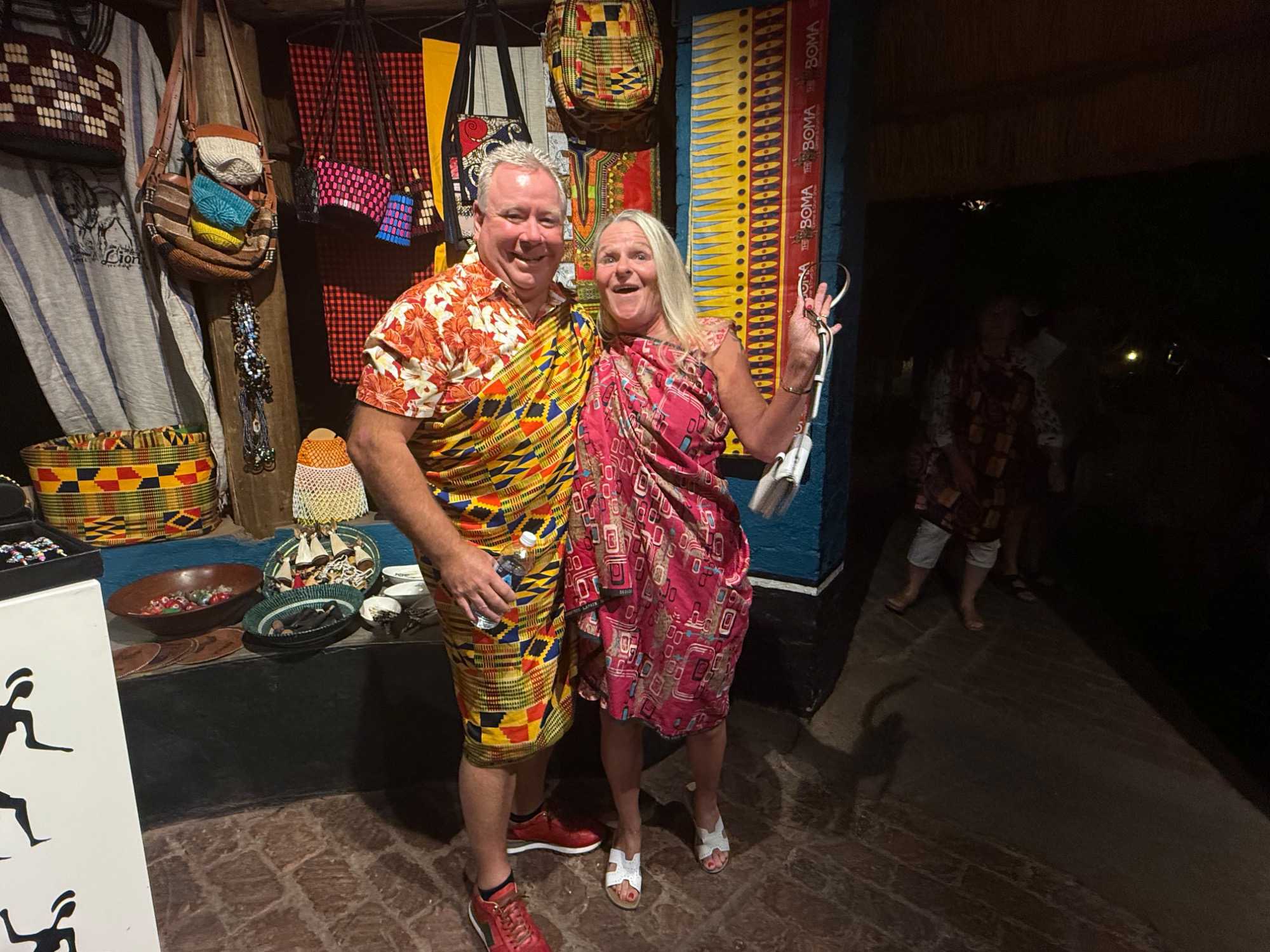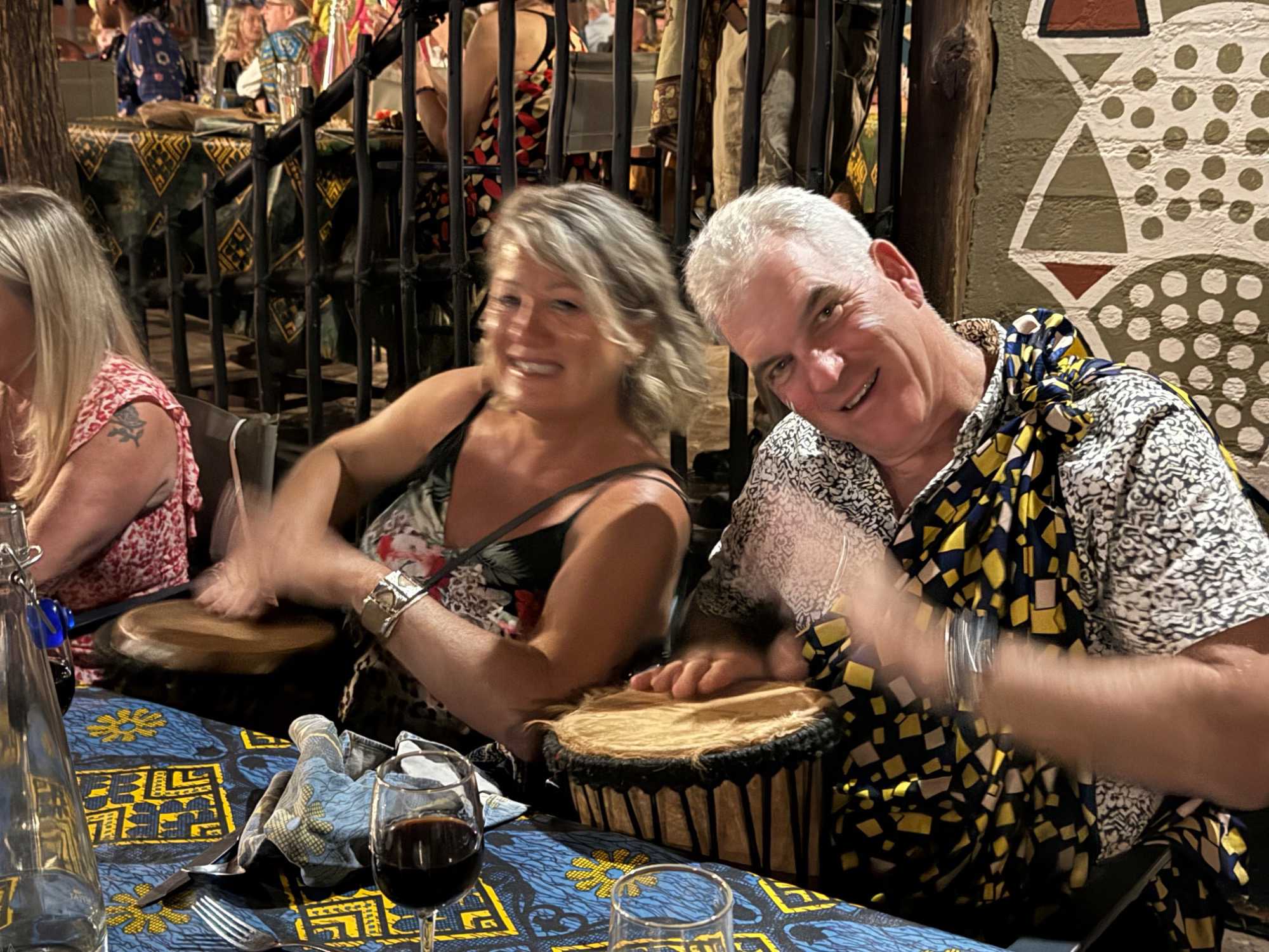 À notre arrivée, chacun a reçu un petit costume traditionnel, et un signe symbolique a été dessiné sur la joue — un joli rituel d’accueil aux accents de fête 🌺. Le site était superbe : lumières tamisées, tambours, chants africains et un immense buffet proposant une variété incroyable de plats locaux. Certains ont osé goûter à la viande sauvage et même au crocodile 🐊 !