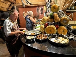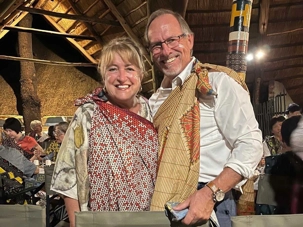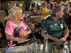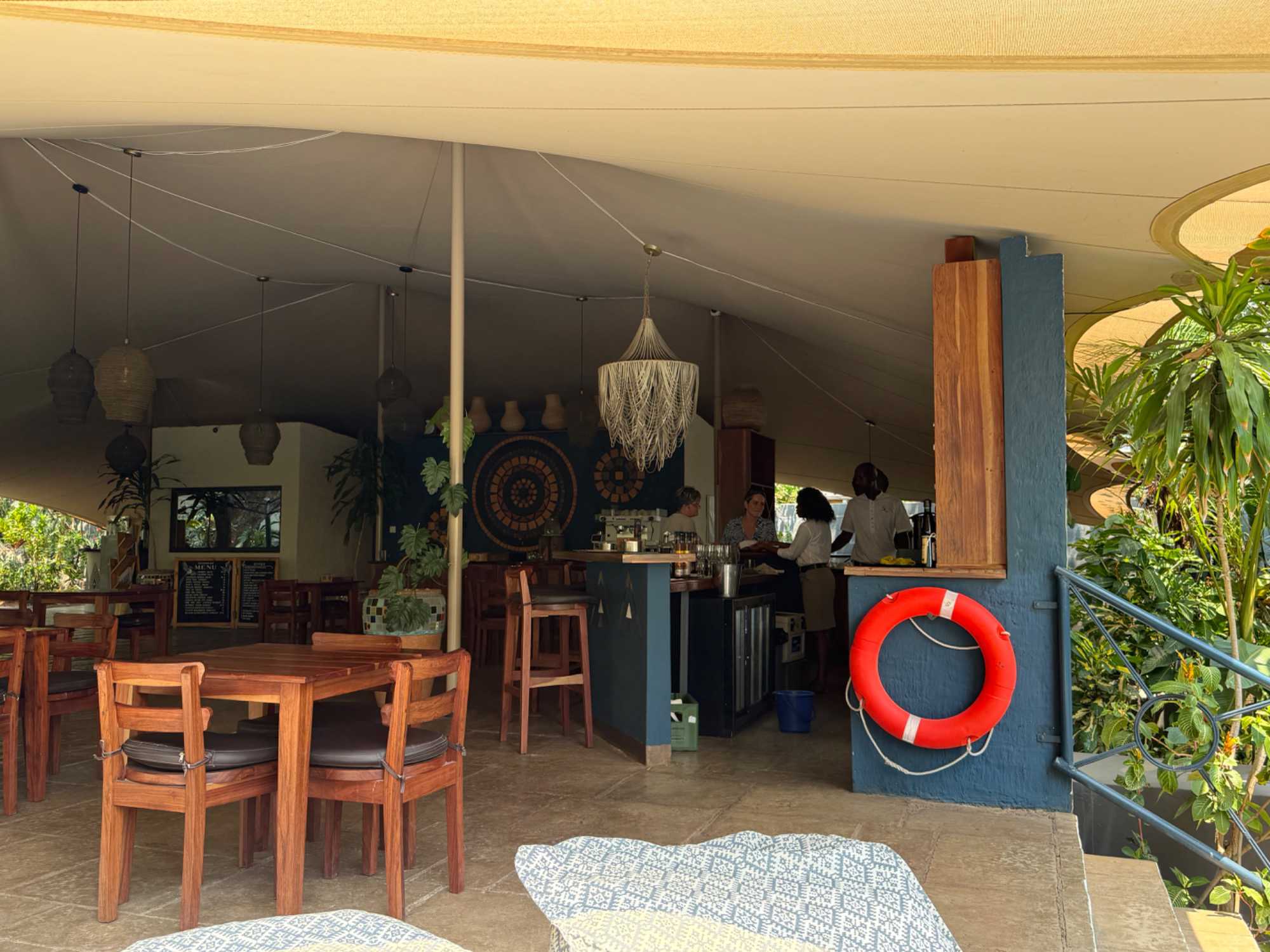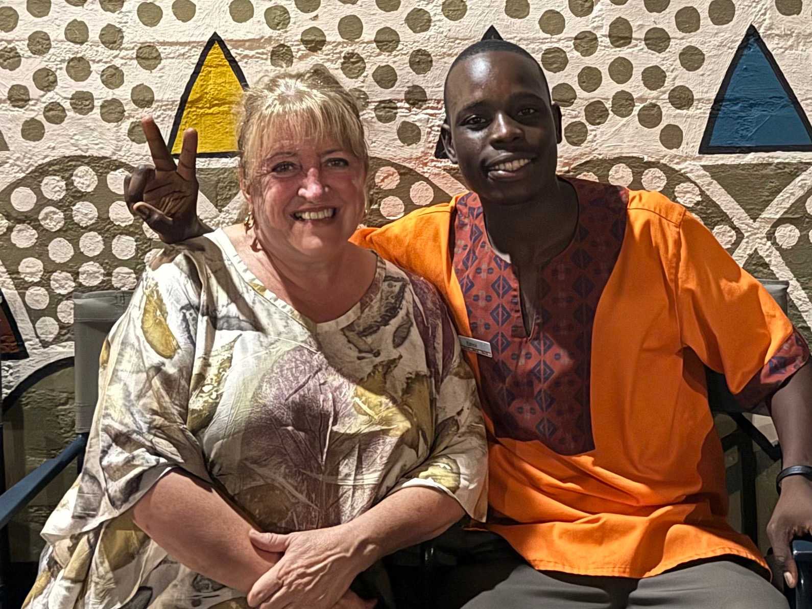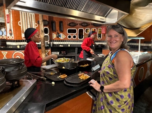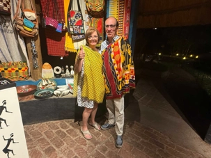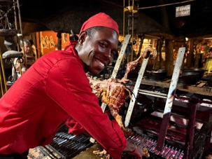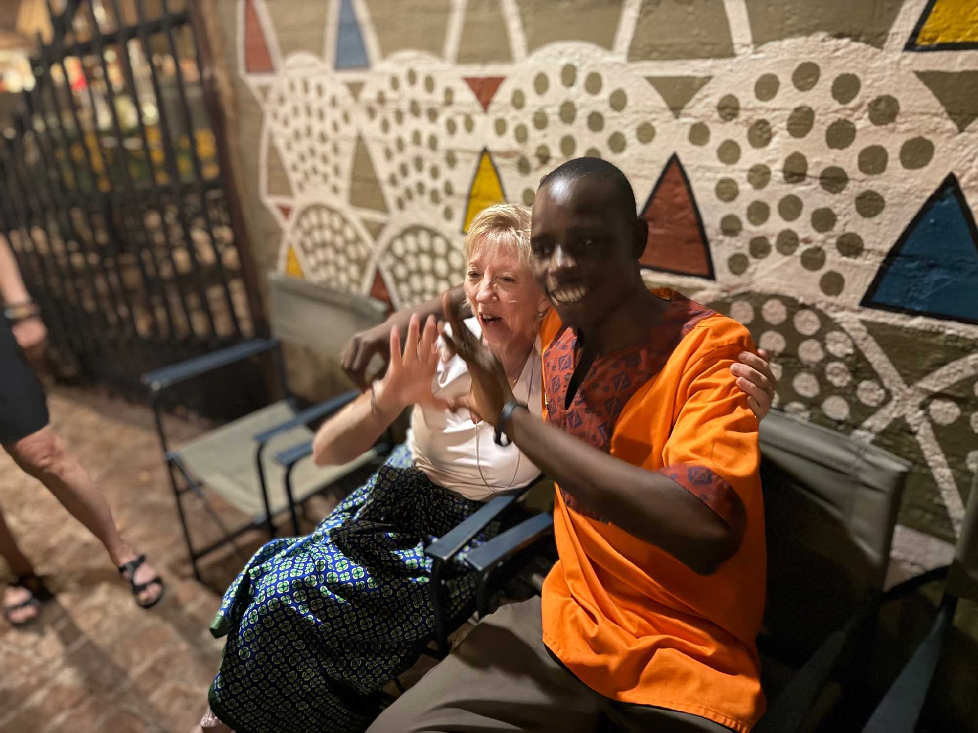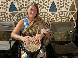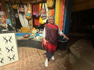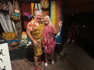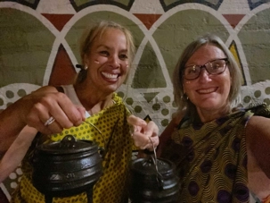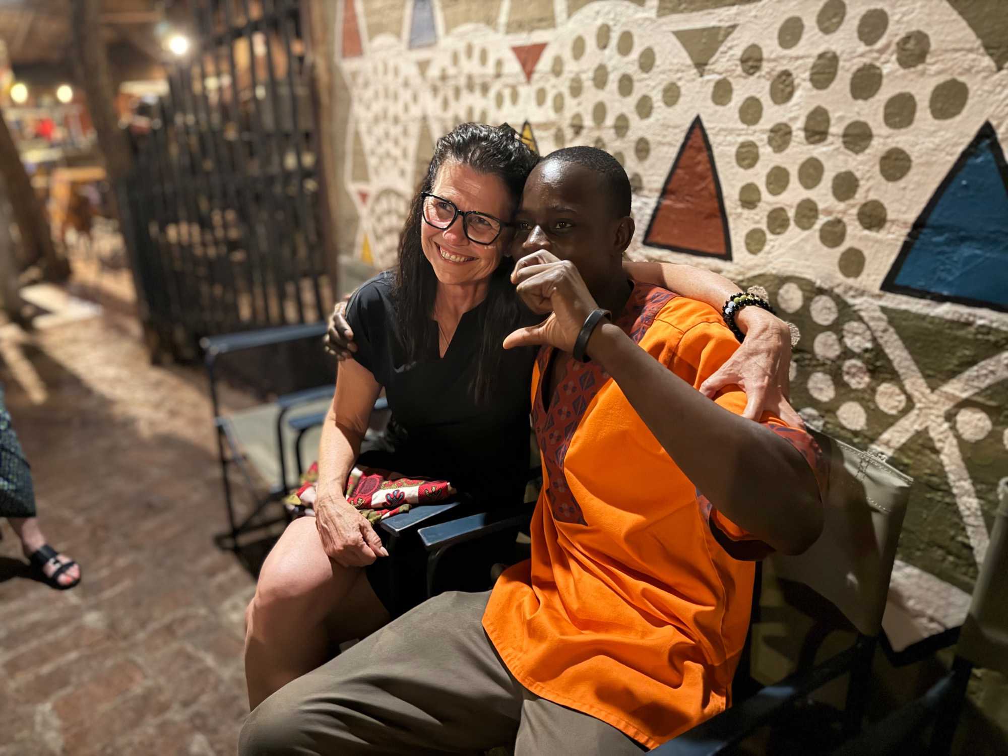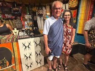 À notre arrivée, chacun a reçu un petit costume traditionnel, et un signe symbolique a été dessiné sur la joue — un joli rituel d’accueil aux accents de fête 🌺. Le site était superbe : lumières tamisées, tambours, chants africains et un immense buffet proposant une variété incroyable de plats locaux. Certains ont osé goûter à la viande sauvage et même au crocodile 🐊 !