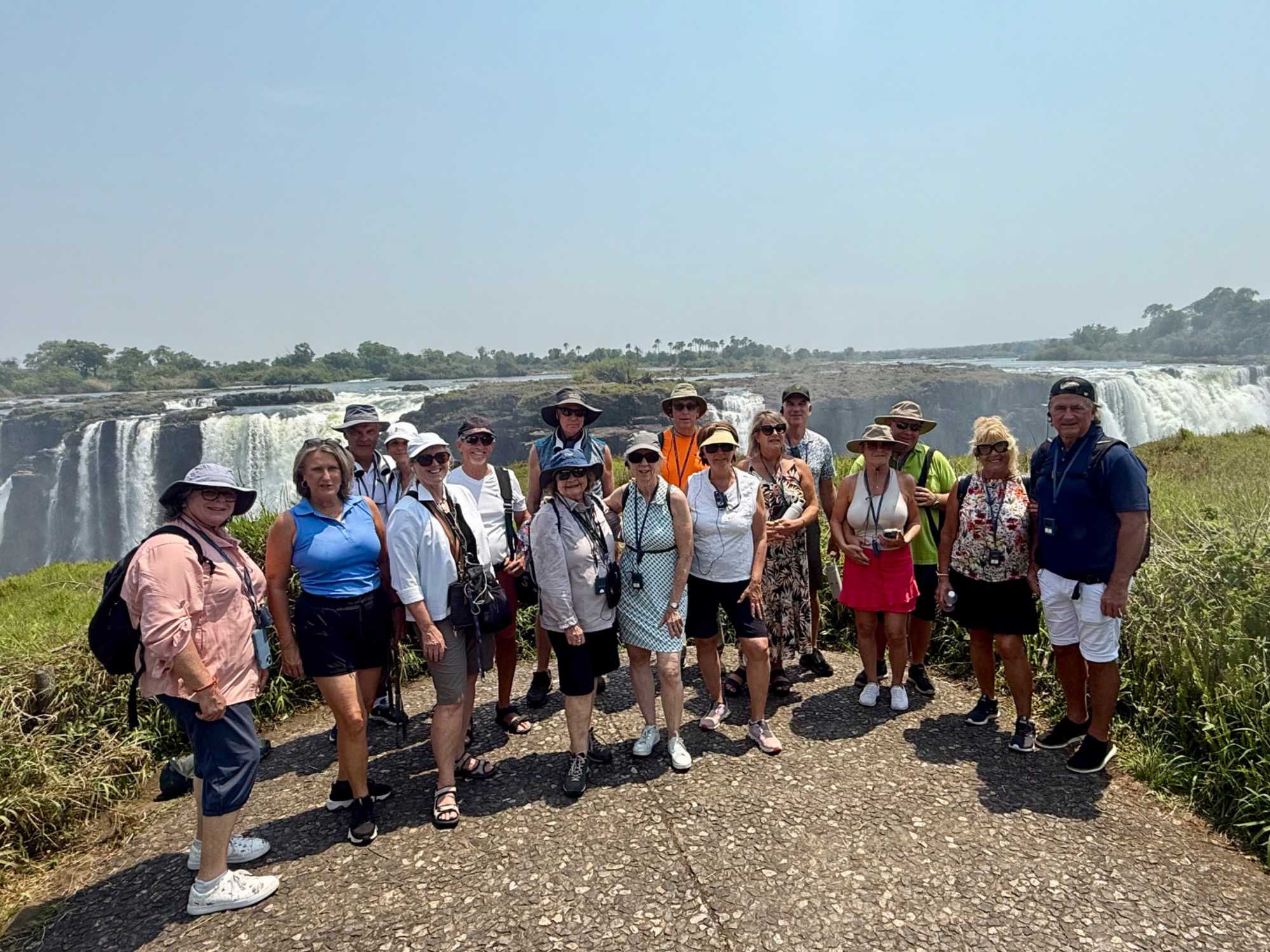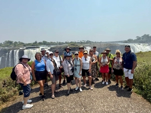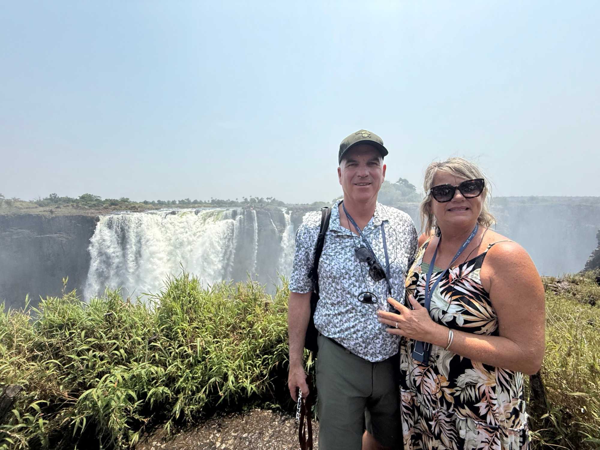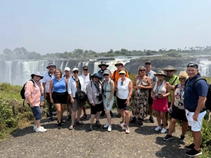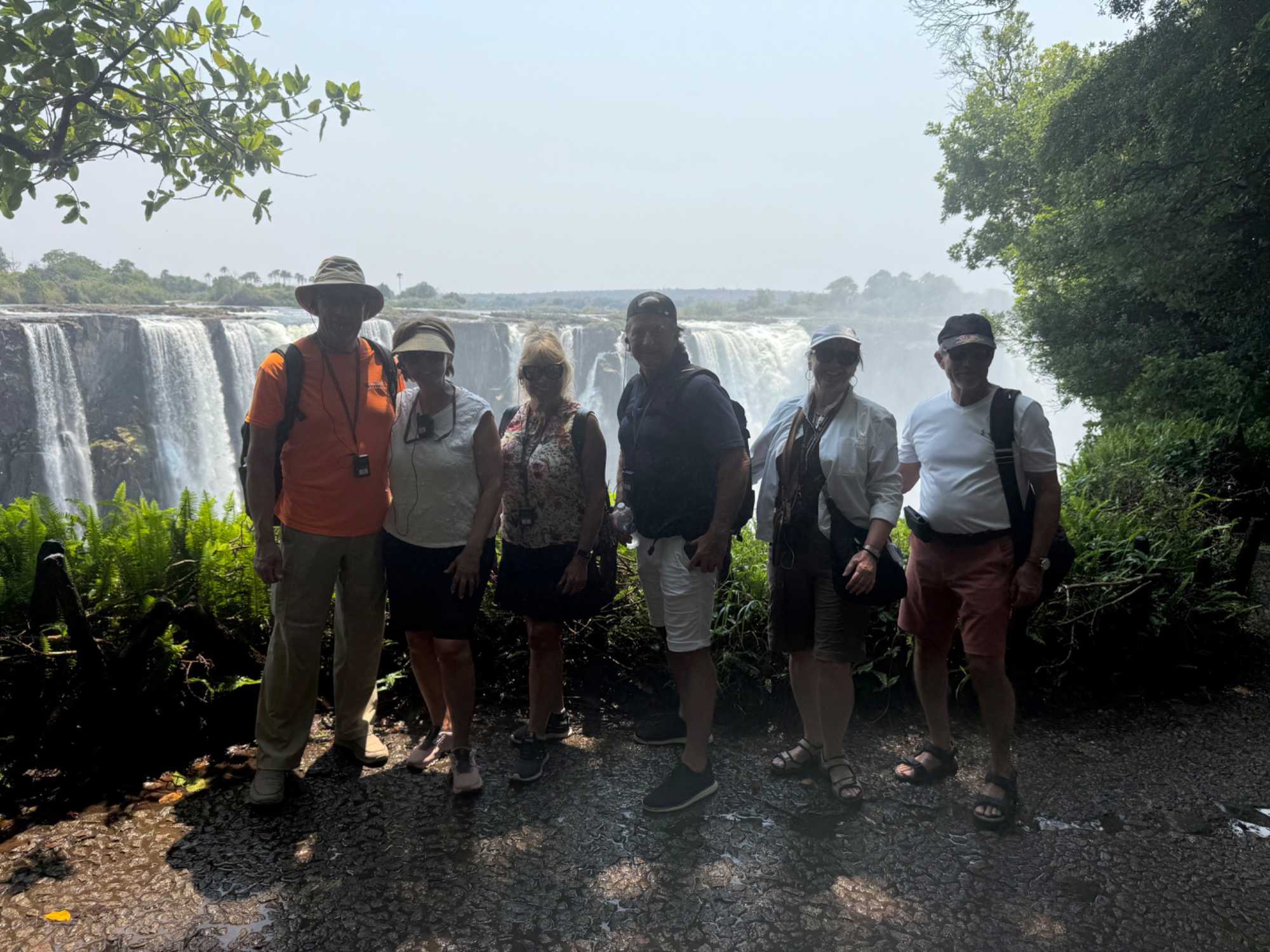 Pendant que le groupe se préparait pour la promenade à pied, Caroline et Raymond ont choisi de découvrir les chutes depuis le ciel 🚁. Leur survol en hélicoptère leur a permis d’admirer la faille géologique, les gorges du Zambèze et les jeux de brume et de lumière sous un angle absolument spectaculaire 🌍✨. Ils sont revenus éblouis par cette expérience unique, le sourire aux lèvres et les yeux pleins d’images inoubliables 💙.