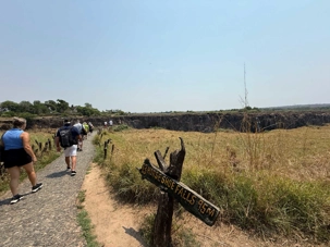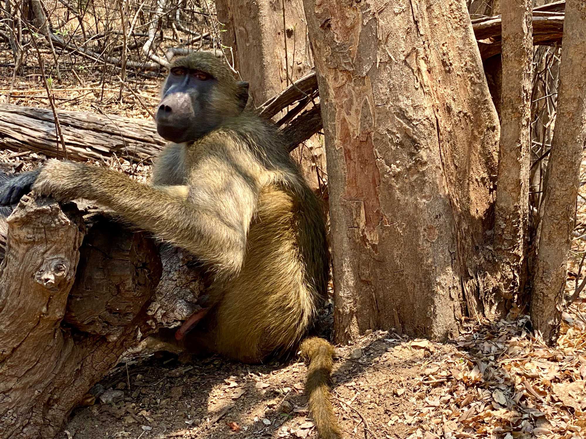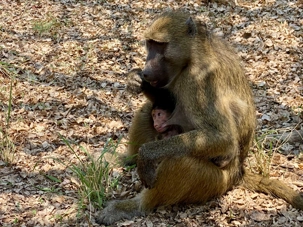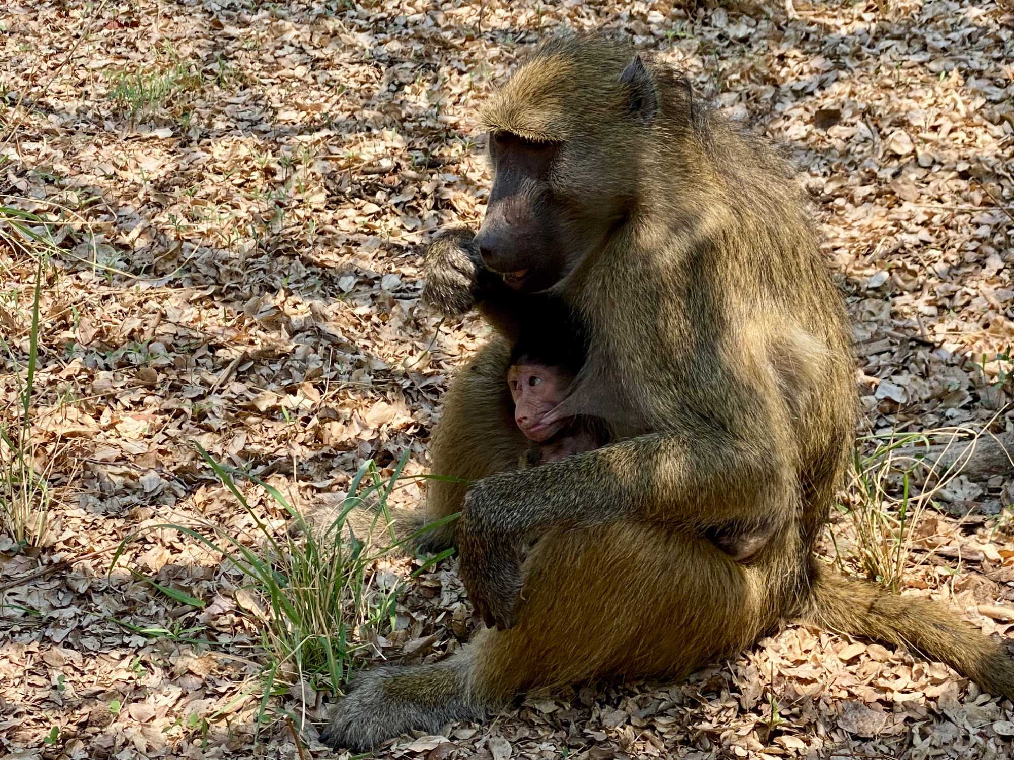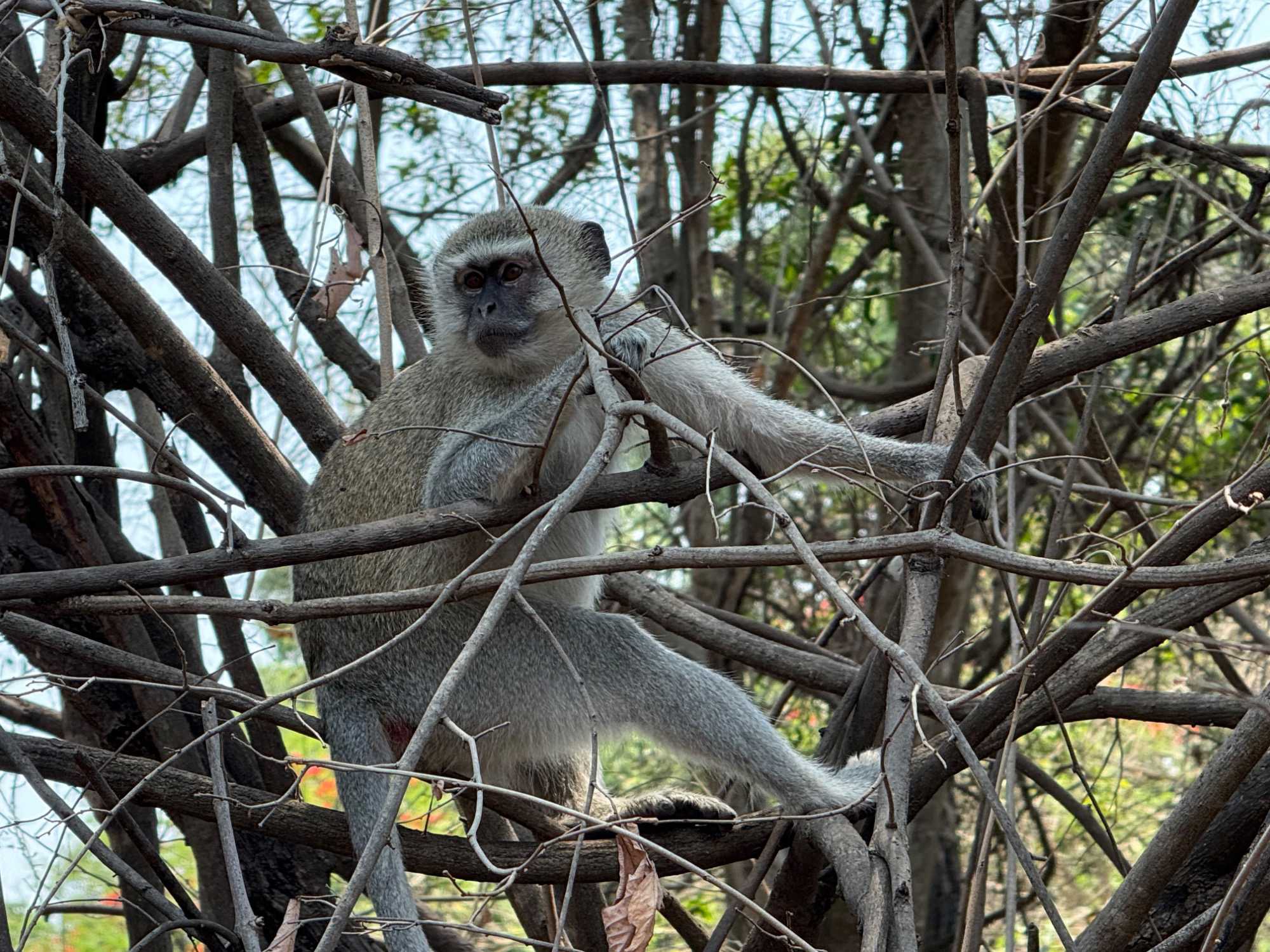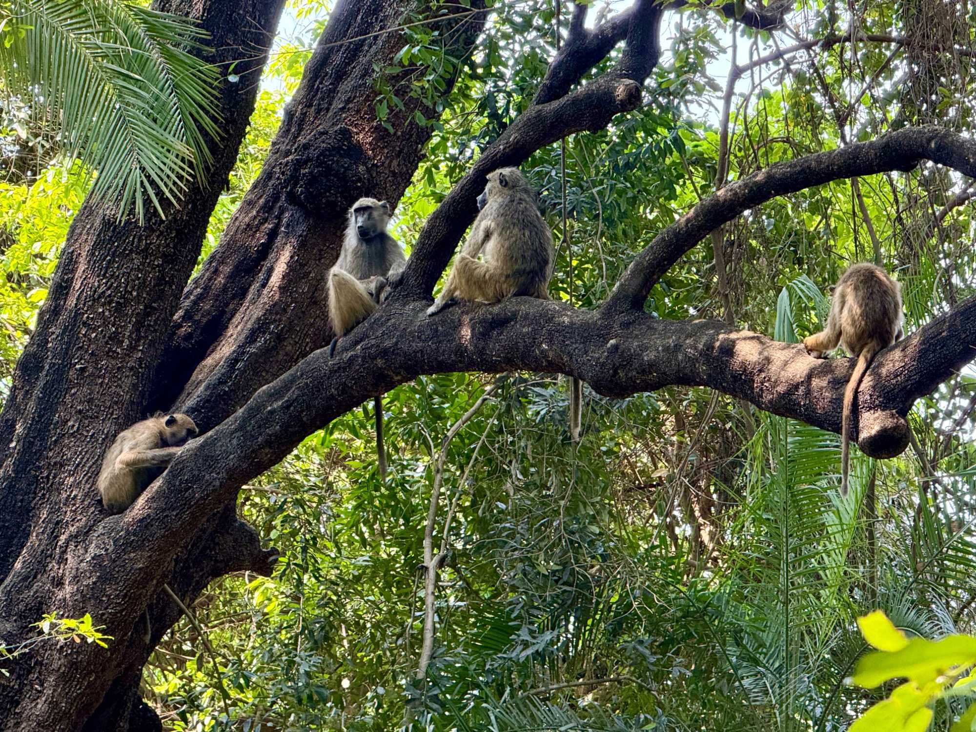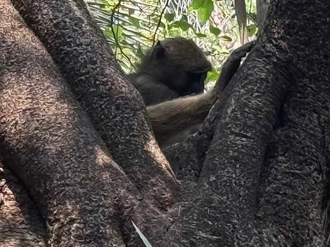 Notre guide Melo, toujours enthousiaste, a su rendre cette balade passionnante, en nous parlant de la géologie, de la flore et de la faune locale. La végétation tropicale était d’une beauté incroyable, notamment cette splendide fleur rouge appelée “Flame des bois” (Spathodea campanulata) 🌺 qui illuminait le paysage. En chemin, nous avons eu la belle surprise de croiser une grande famille de babouins 🐒👀 ! Une scène adorable et amusante : les adultes surveillaient les petits qui sautaient et grimpaient un peu partout. Un moment de nature pure, comme seuls les parcs africains savent en offrir 💛. Même sans arcs-en-ciel ce jour-là 🌤️, la température douce et la brume légère rendaient la marche des plus agréables.