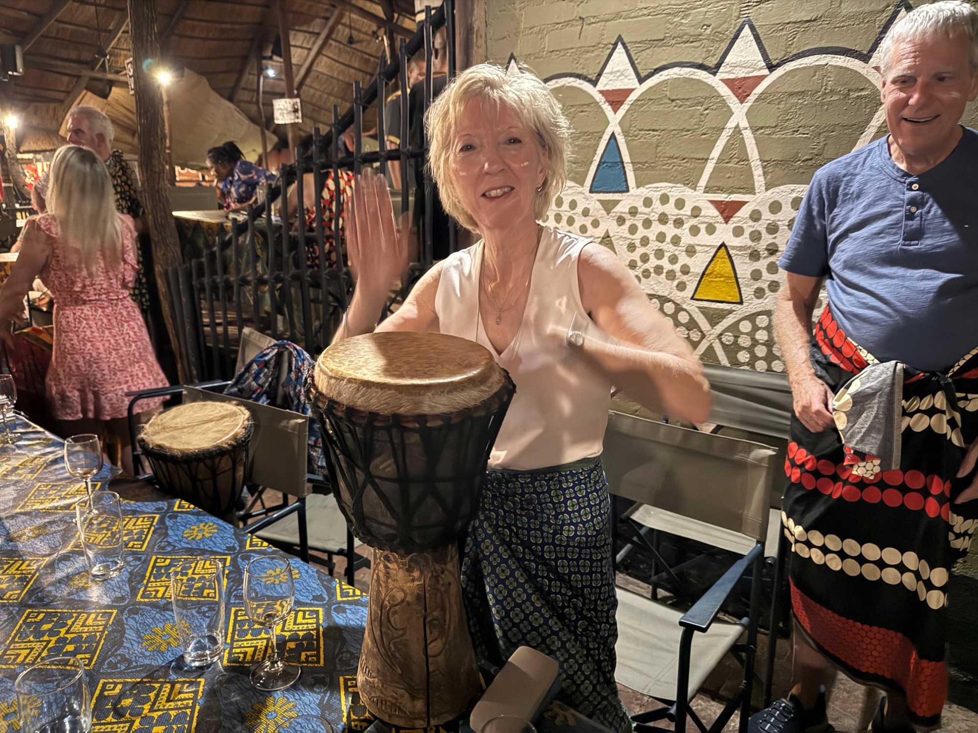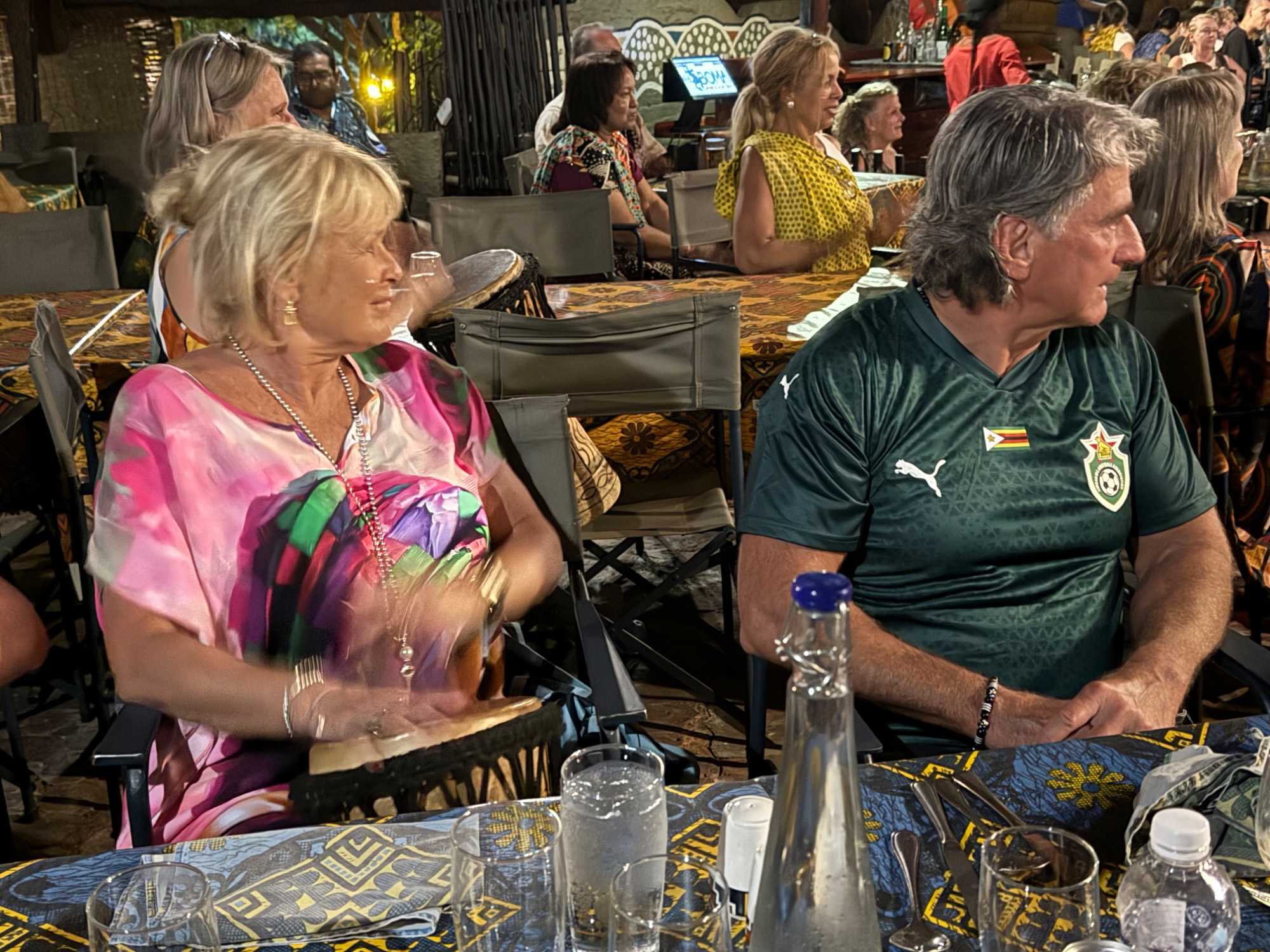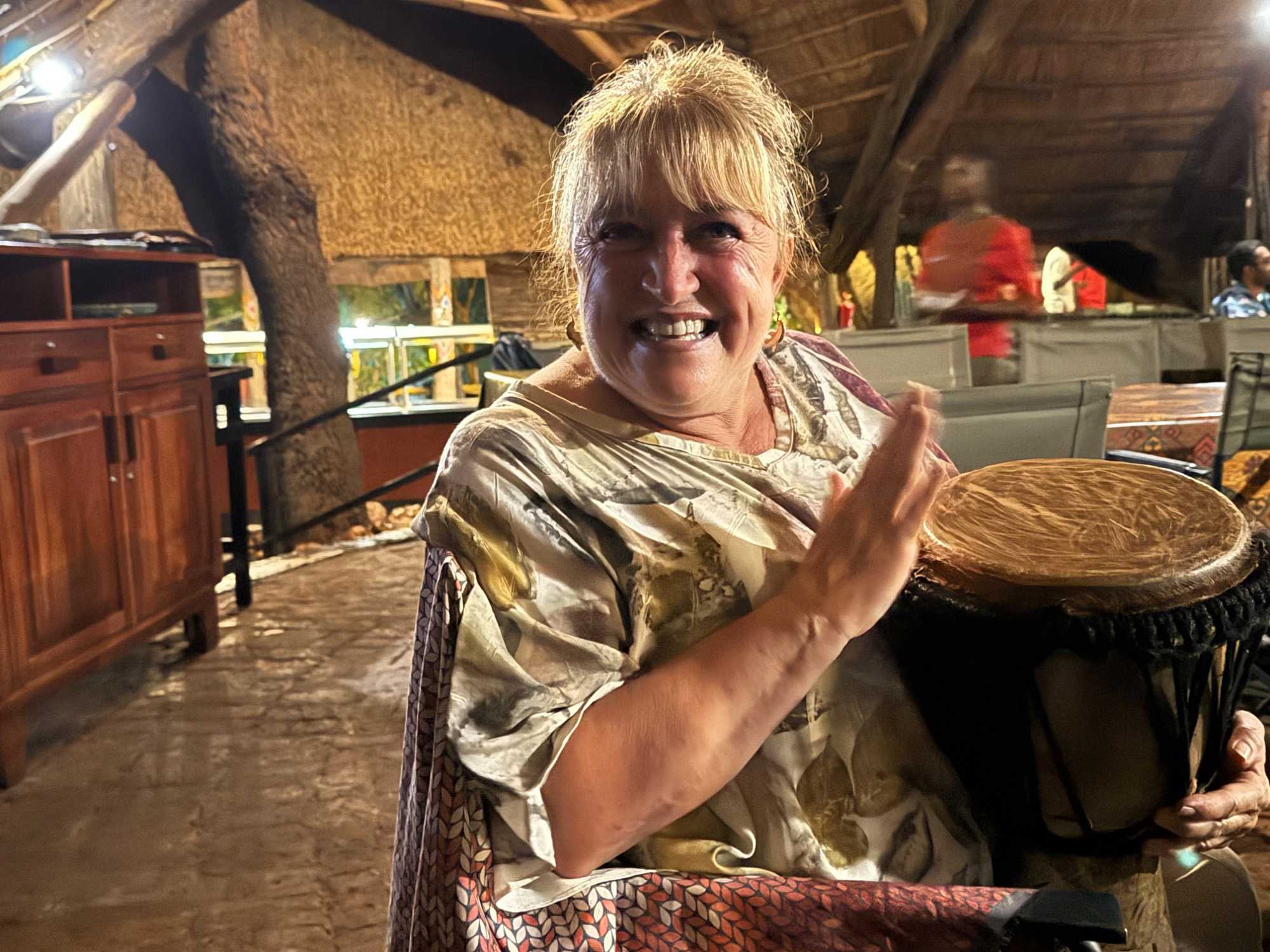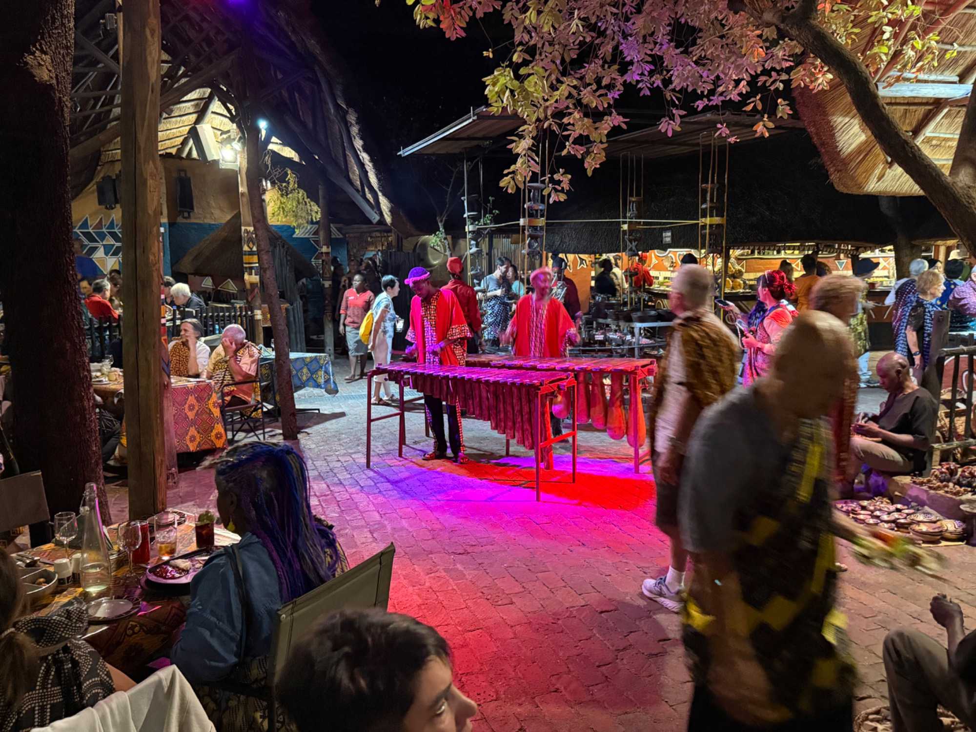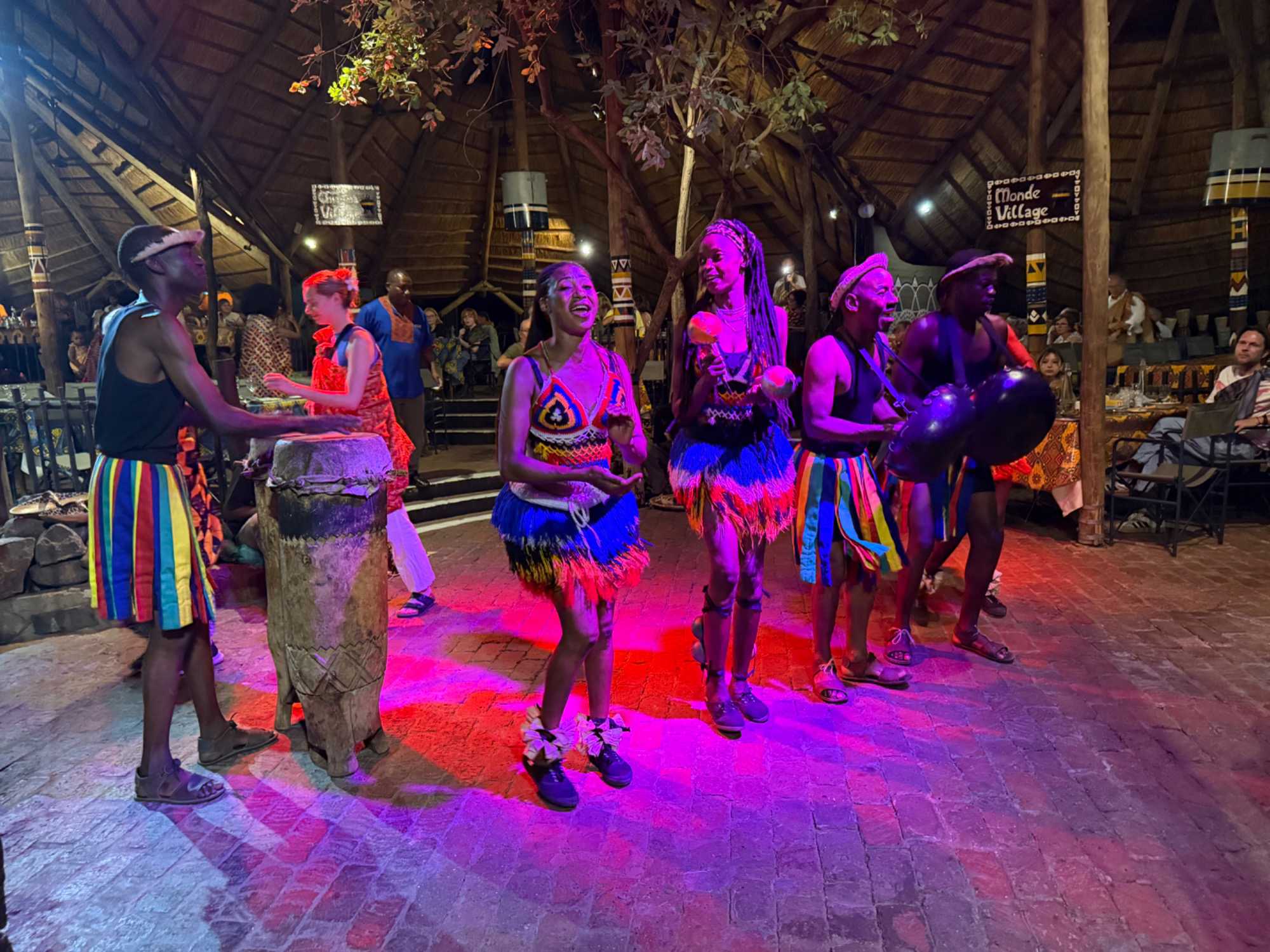 Les saveurs, les odeurs et l’ambiance rendaient le moment magique. Mon moment préféré fût celui ou tout mon groupe ont reçu un tam-tam et ont eu droit à un cours en direct. Comme nous nous sommes amusés. Notre serveur, Hendrick, jeune, souriant et plein d’entrain, a ajouté une belle dose de bonne humeur à la soirée 😄. Tout le monde l’a adoré ! 💕C’était un souper festif, typiquement africain, qui a parfaitement clôturé cette journée mémorable sous les étoiles du Zimbabwe 🌙✨.