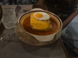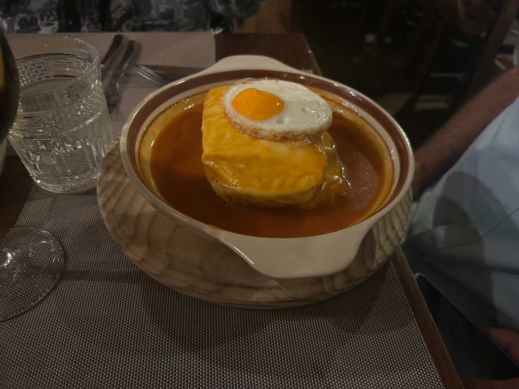 Un buffet réellement bien garni d’entrées de spécialités portugaises, de salades appétissantes, de saumon et porc savoureux, coiffé d’un verre de vin ou d’une bonne bière, ça ça vous remet sur le piton comme on dit ! Le groupe apprécie ne pas avoir un programme trop chargé pour cette première journée. Chacun prend soin de bien s’installer pour les 3 prochaines nuits, faire une sieste pour se remettre du décalage horaire qui est de 5 heures avec le Québec ou partir à la découverte des alentours avant de profiter d’un bon moment tous ensemble à table pour échanger et faire plus ample connaissance au souper où nous avons eu l’occasion pour ceux qui le souhaitaient de goûter à la Francesinha dont la traduction serait: la petite française). Attention, c’est costaud. en voici la description: Un sandwich d'origine portugaise, originaire de Porto, composé de plusieurs viandes (bœuf, jambon, saucisses) entre deux tranches de pain grillé. Il est ensuite recouvert de fromage fondu et arrosé d'une sauce épicée à base de tomate, de bière et de piment. Souvent, il est servi avec des frites et complété par un œuf au plat pour une version "especial”. Wow, une chance que nous avons marché quelques minutes avant de retourner à l’hôtel, histoire de digérer “la petite française !