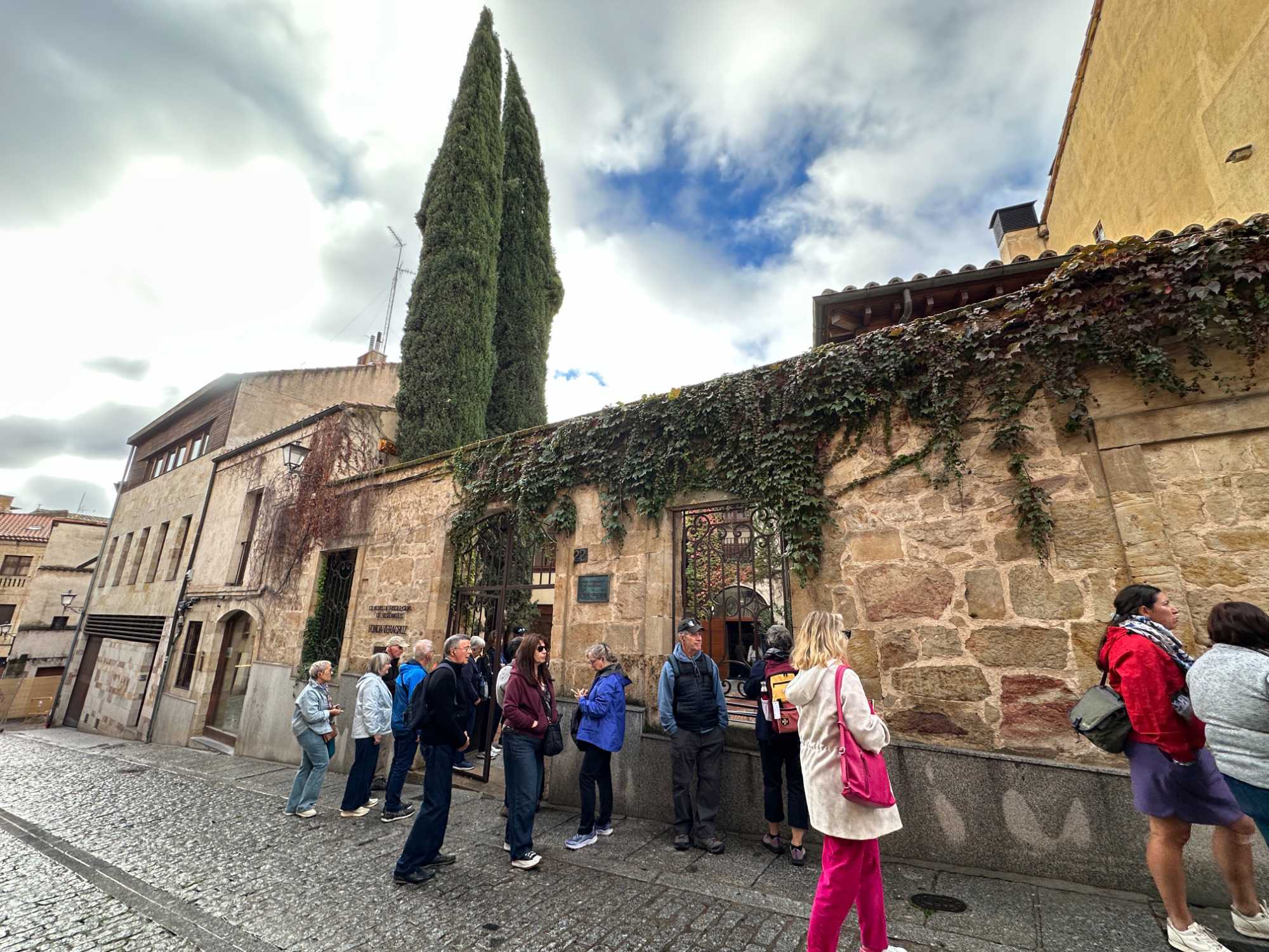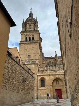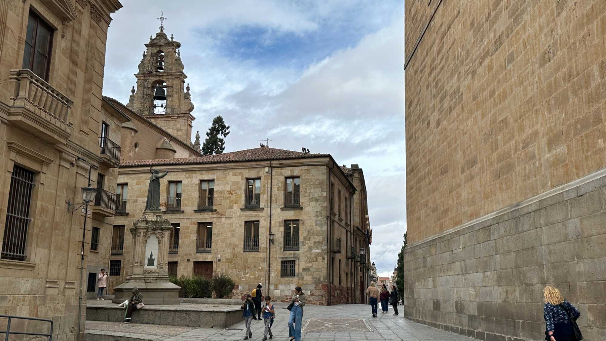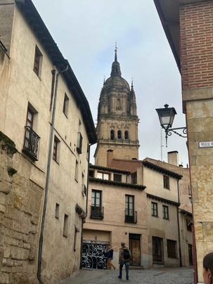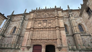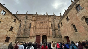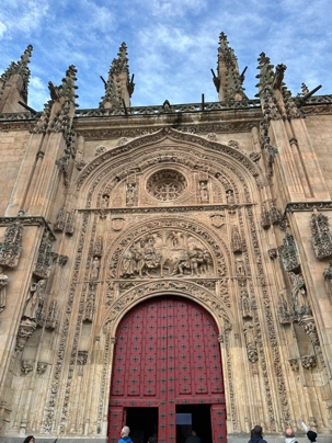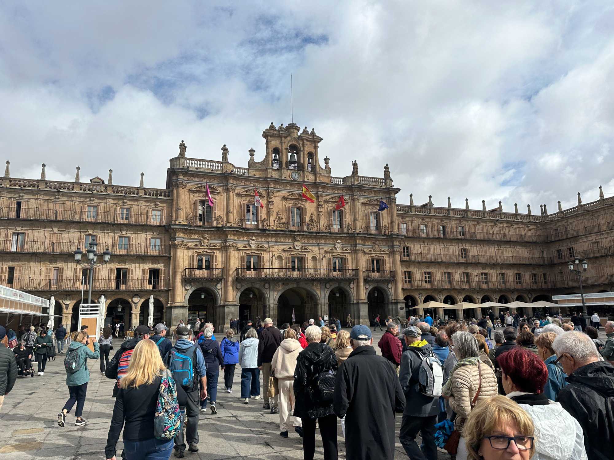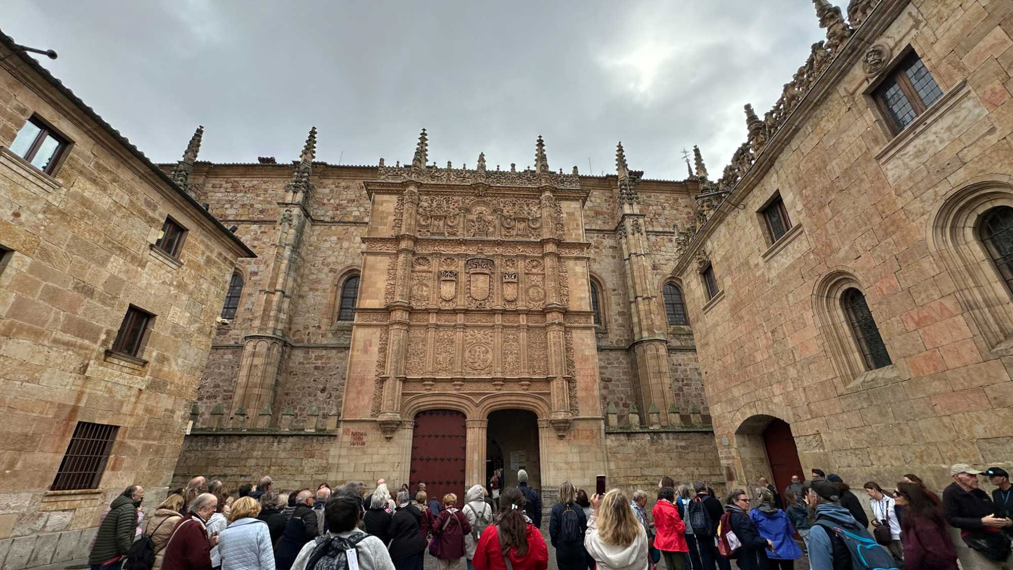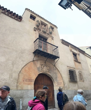 Nous partons à pied, en compagnie de notre guide qui en a beaucoup à dire, visiter la vieille ville. De la Place Mayor, très belle place centrale, nous marchons sur le Rua Mayor vers la cathédrale. Nous faisons de petits arrêts en chemin et notre guide nous donne des explications sur ce qu’on voit et aussi sur la culture de l’Espagne et de la ville. Nous visitons la célèbre université. Le bâtiment de l'université possède un somptueux portail sur lequel est sculpté le motif le plus célèbre de la ville : une tête de mort surmontée d'une grenouille (le symbole du péché de luxure puni après la mort). Pour les étudiants, apercevoir cette grenouille est signe de chance lors de leurs examens. Depuis un vestibule vitré, nous pouvons admirer la prodigieuse bibliothèque dont les rayonnages regorgent de manuscrits et publications antérieures au XIXe siècle.