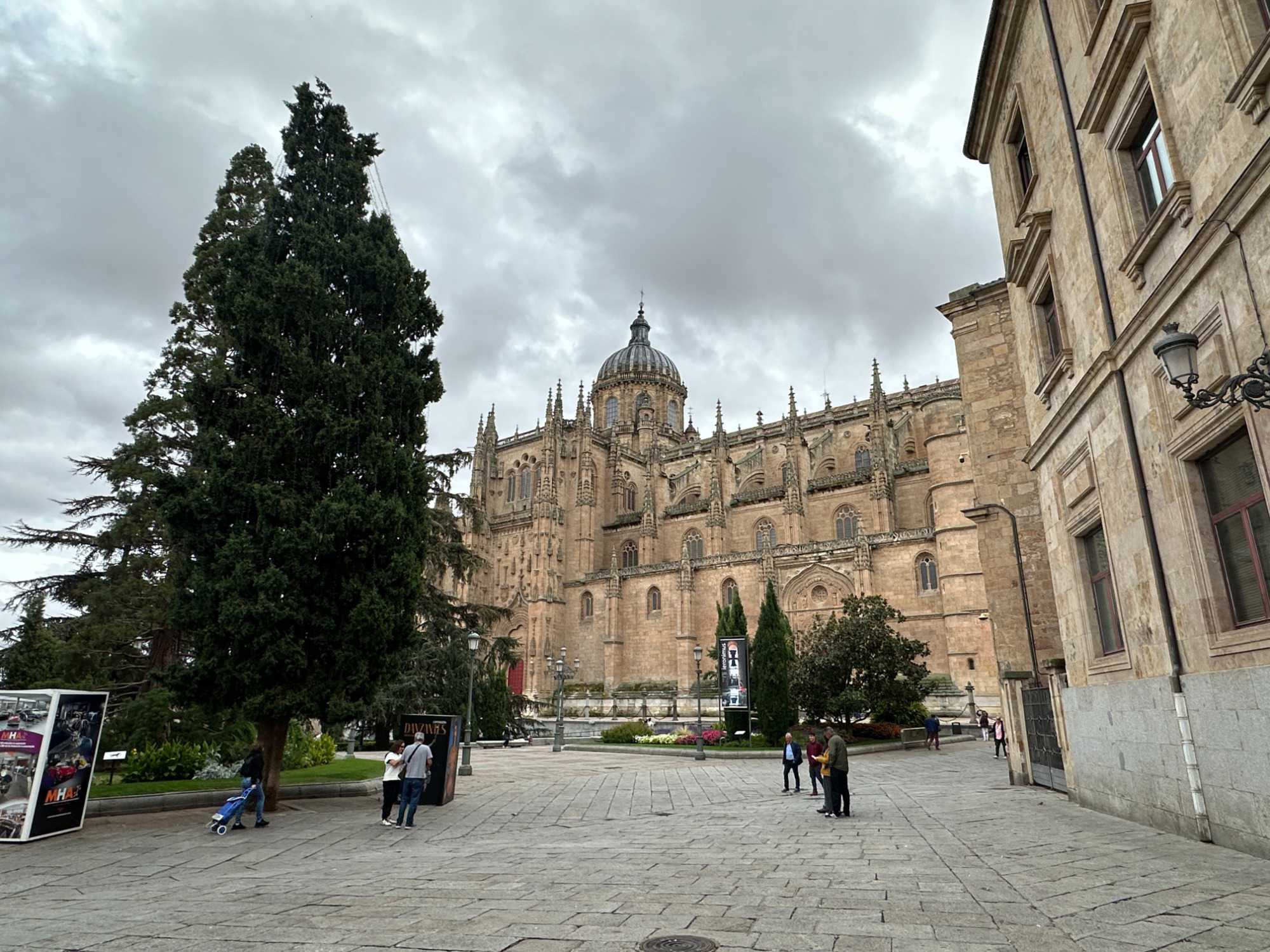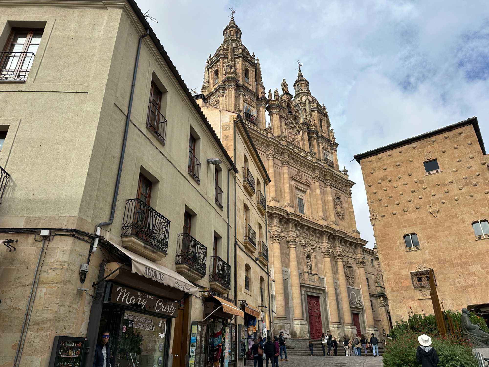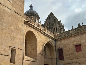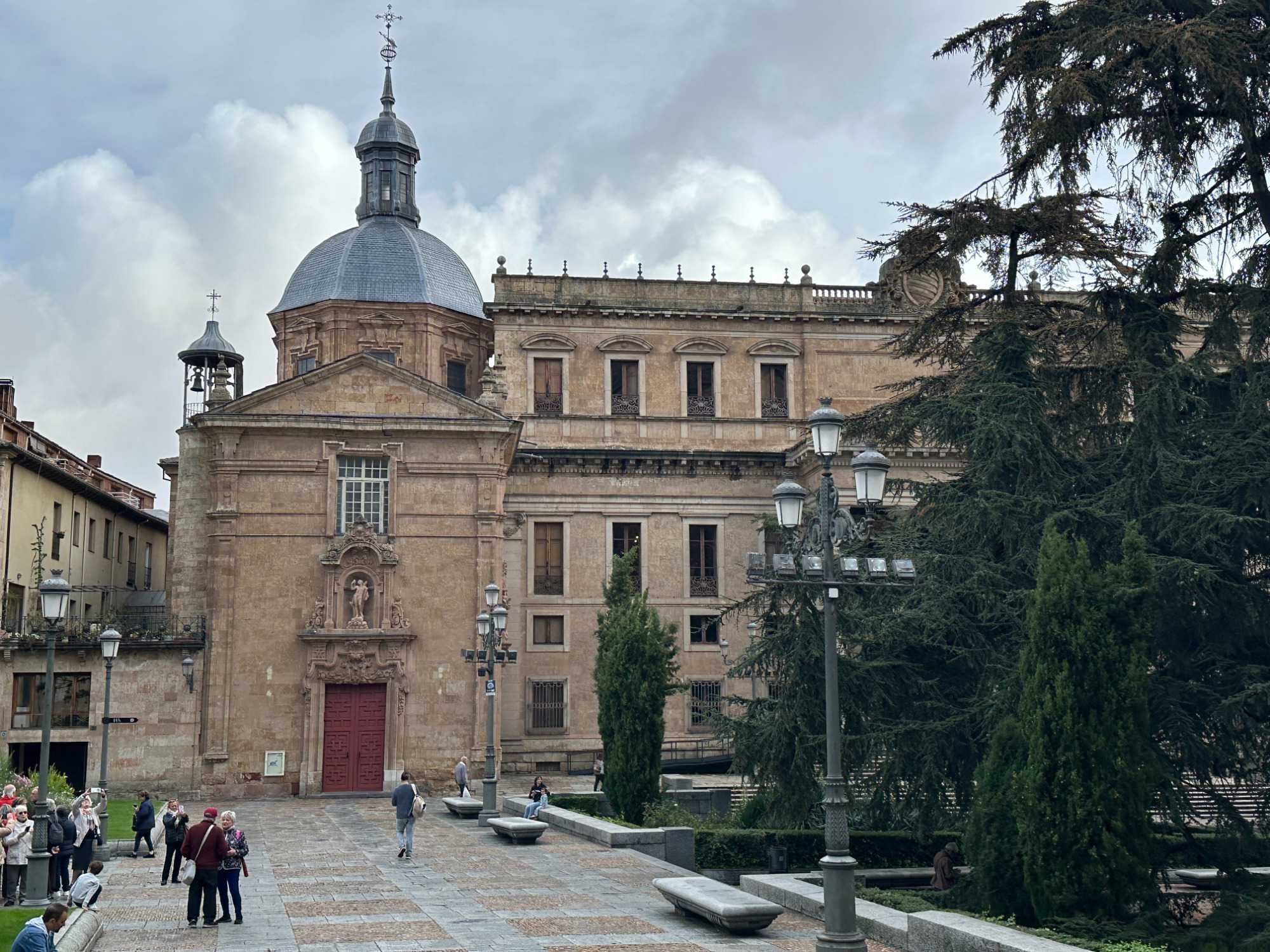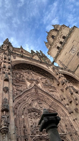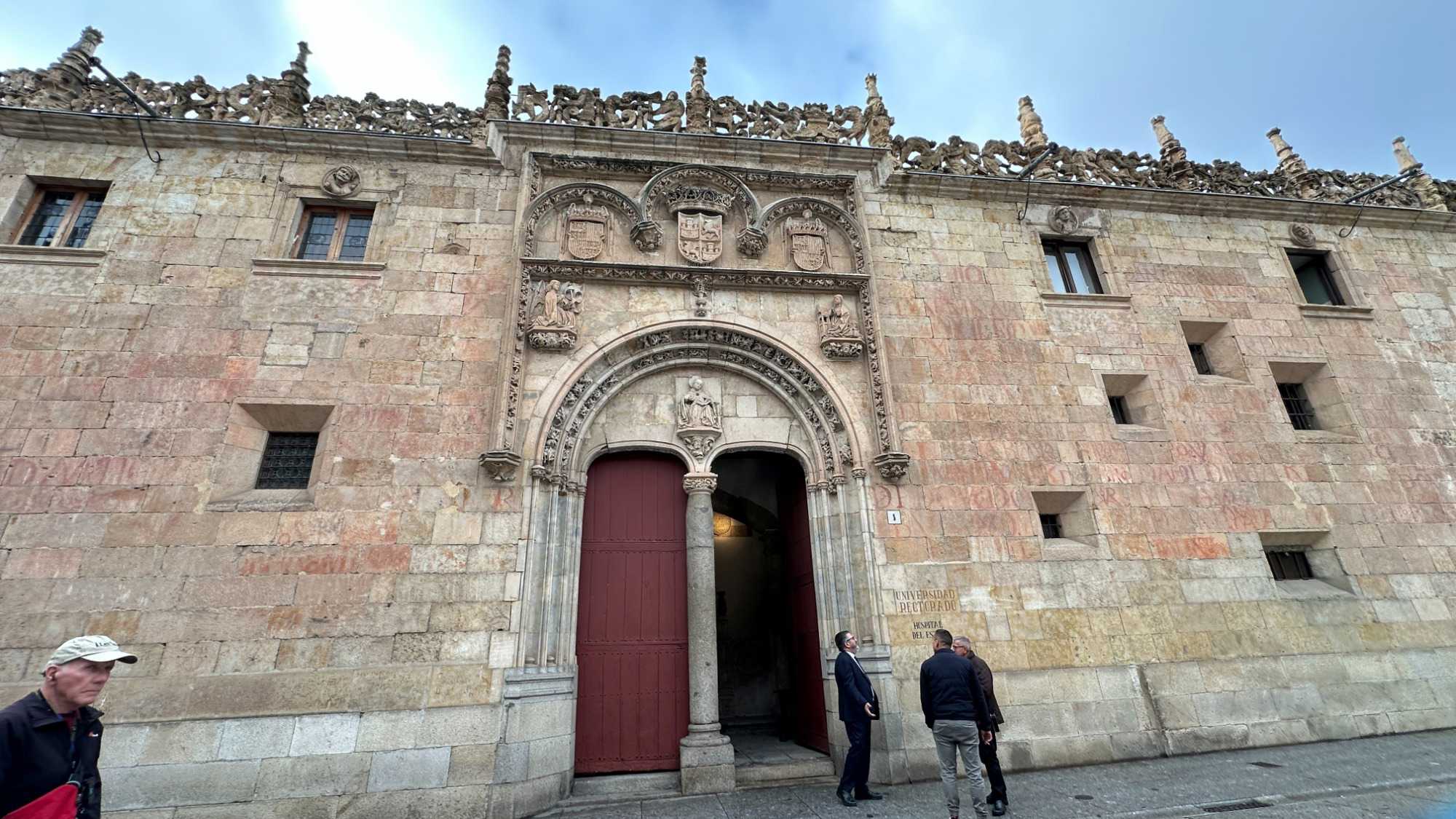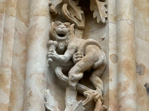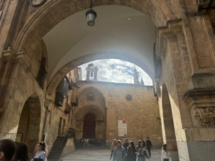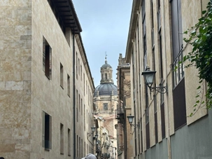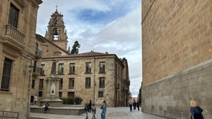 Nous partons à pied, en compagnie de notre guide qui en a beaucoup à dire, visiter la vieille ville. De la Place Mayor, très belle place centrale, nous marchons sur le Rua Mayor vers la cathédrale. Nous faisons de petits arrêts en chemin et notre guide nous donne des explications sur ce qu’on voit et aussi sur la culture de l’Espagne et de la ville. Nous visitons la célèbre université. Le bâtiment de l'université possède un somptueux portail sur lequel est sculpté le motif le plus célèbre de la ville : une tête de mort surmontée d'une grenouille (le symbole du péché de luxure puni après la mort). Pour les étudiants, apercevoir cette grenouille est signe de chance lors de leurs examens. Depuis un vestibule vitré, nous pouvons admirer la prodigieuse bibliothèque dont les rayonnages regorgent de manuscrits et publications antérieures au XIXe siècle.