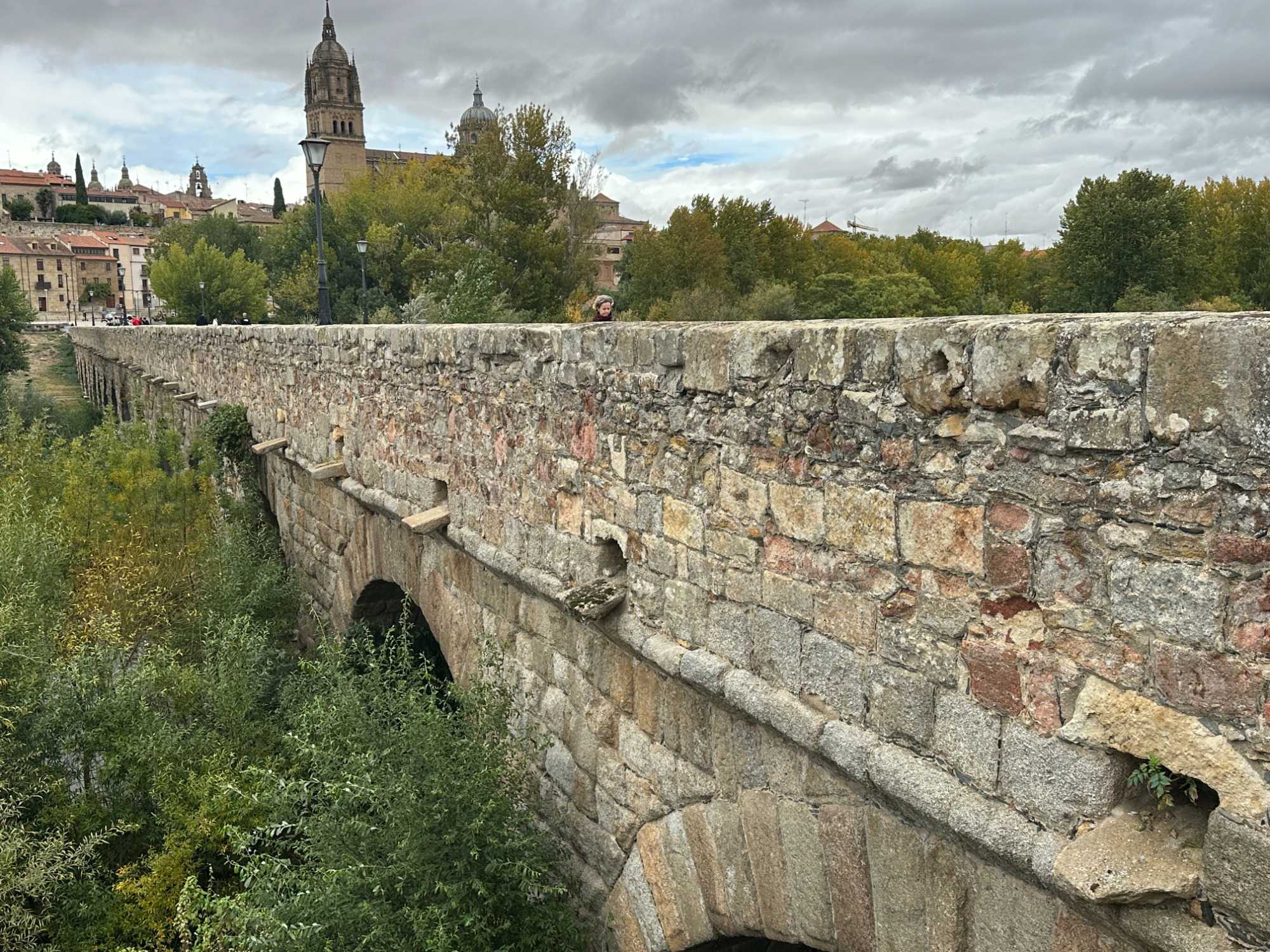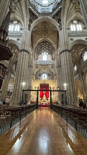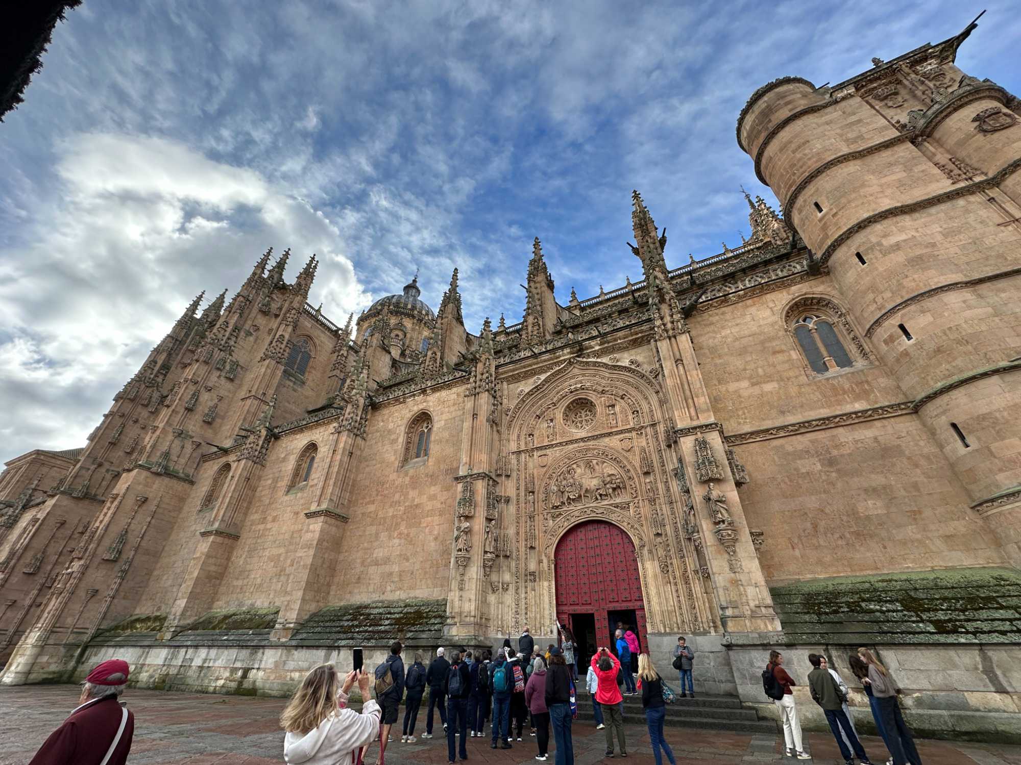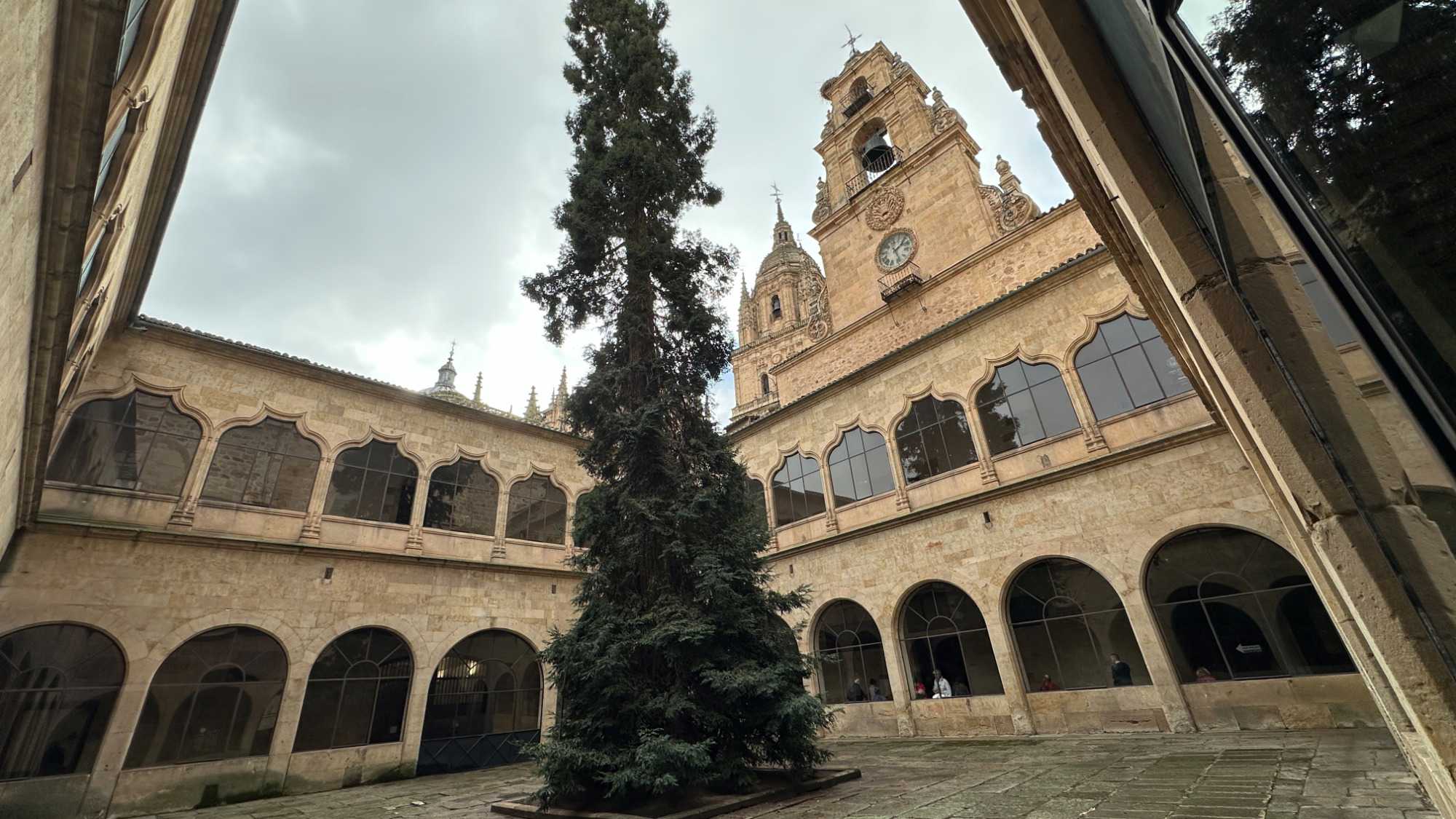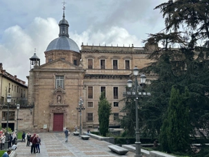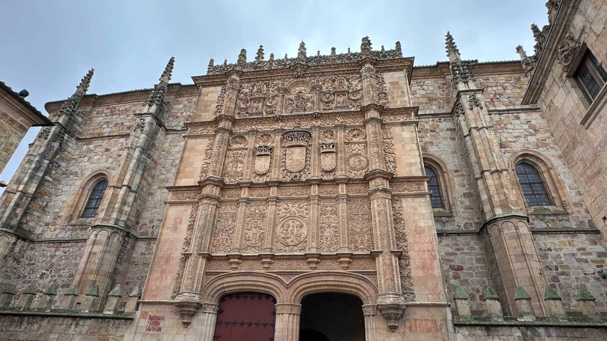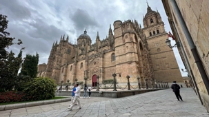 Nous partons à pied, en compagnie de notre guide qui en a beaucoup à dire, visiter la vieille ville. De la Place Mayor, très belle place centrale, nous marchons sur le Rua Mayor vers la cathédrale. Nous faisons de petits arrêts en chemin et notre guide nous donne des explications sur ce qu’on voit et aussi sur la culture de l’Espagne et de la ville. Nous visitons la célèbre université. Le bâtiment de l'université possède un somptueux portail sur lequel est sculpté le motif le plus célèbre de la ville : une tête de mort surmontée d'une grenouille (le symbole du péché de luxure puni après la mort). Pour les étudiants, apercevoir cette grenouille est signe de chance lors de leurs examens. Depuis un vestibule vitré, nous pouvons admirer la prodigieuse bibliothèque dont les rayonnages regorgent de manuscrits et publications antérieures au XIXe siècle.