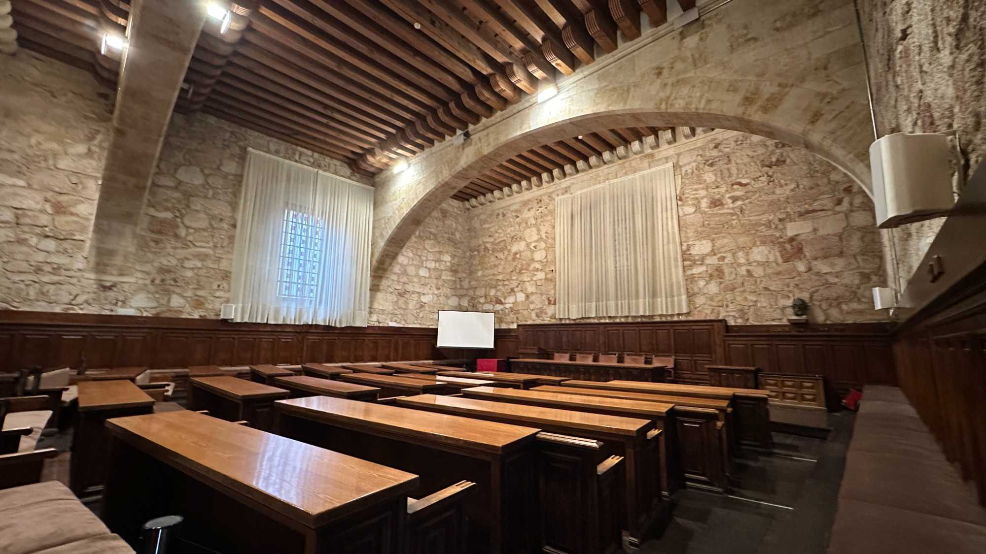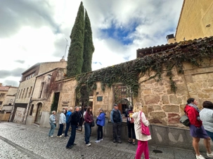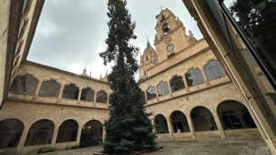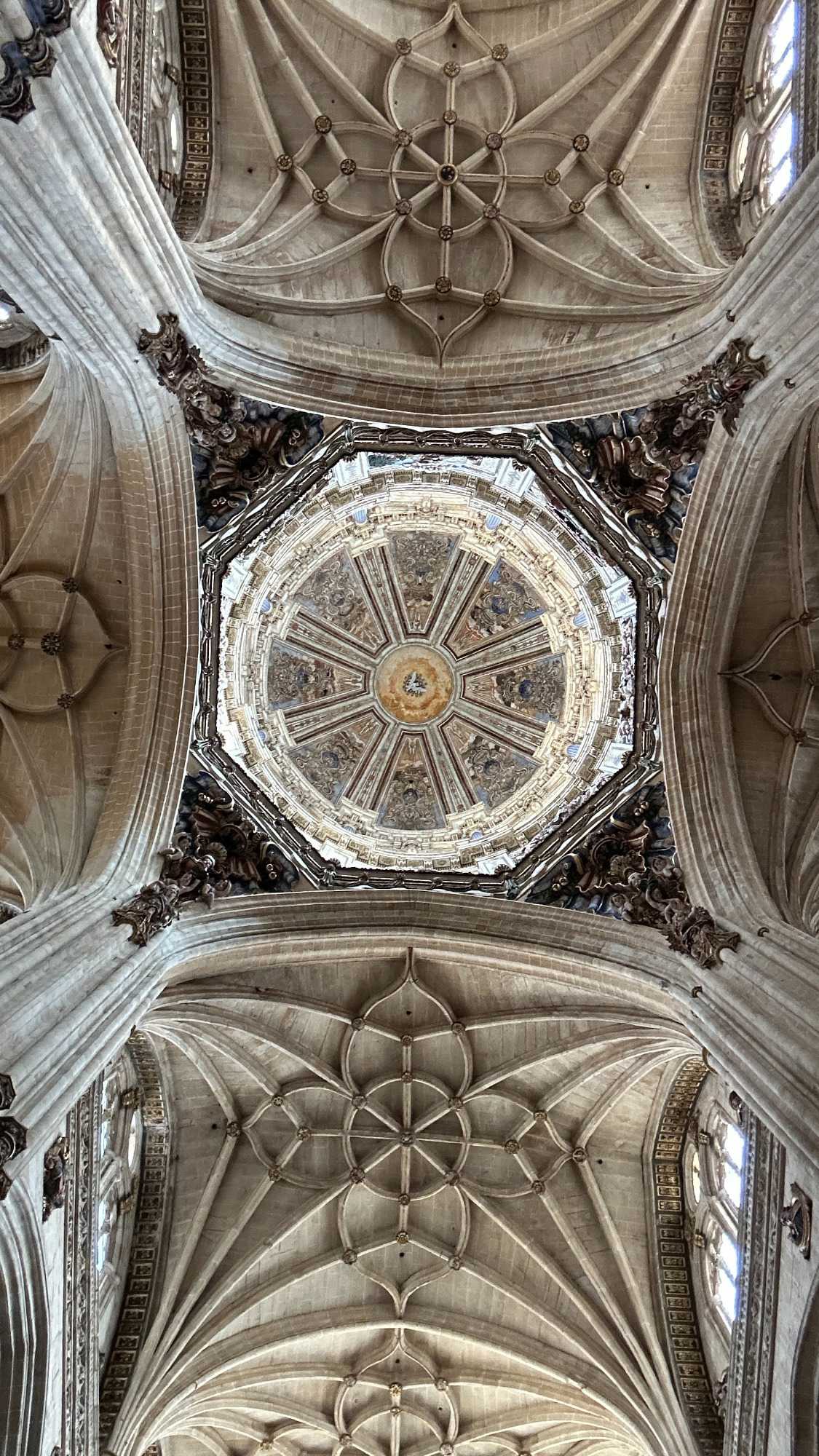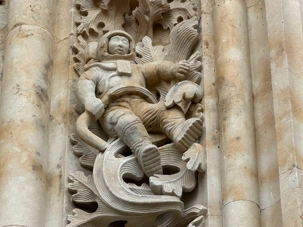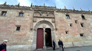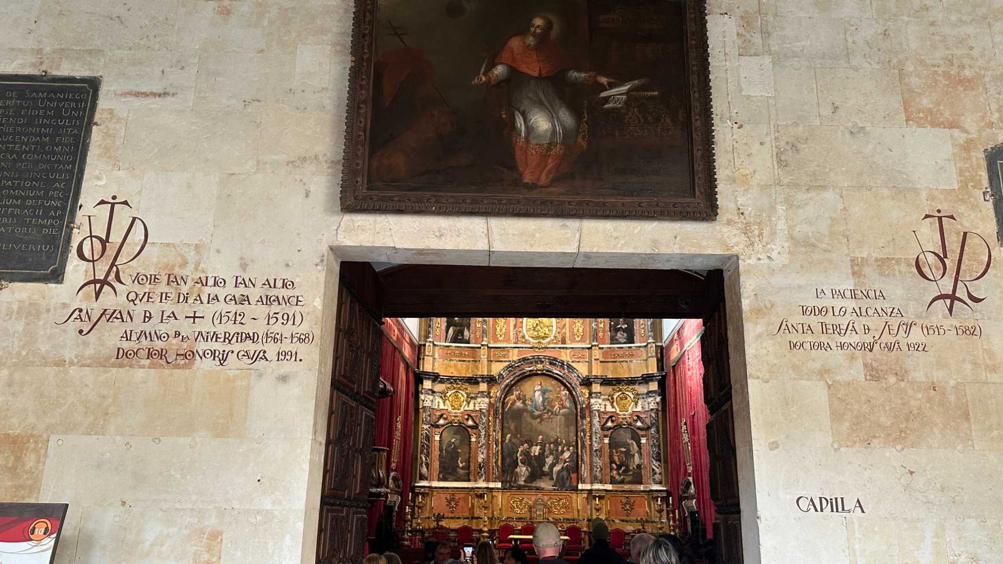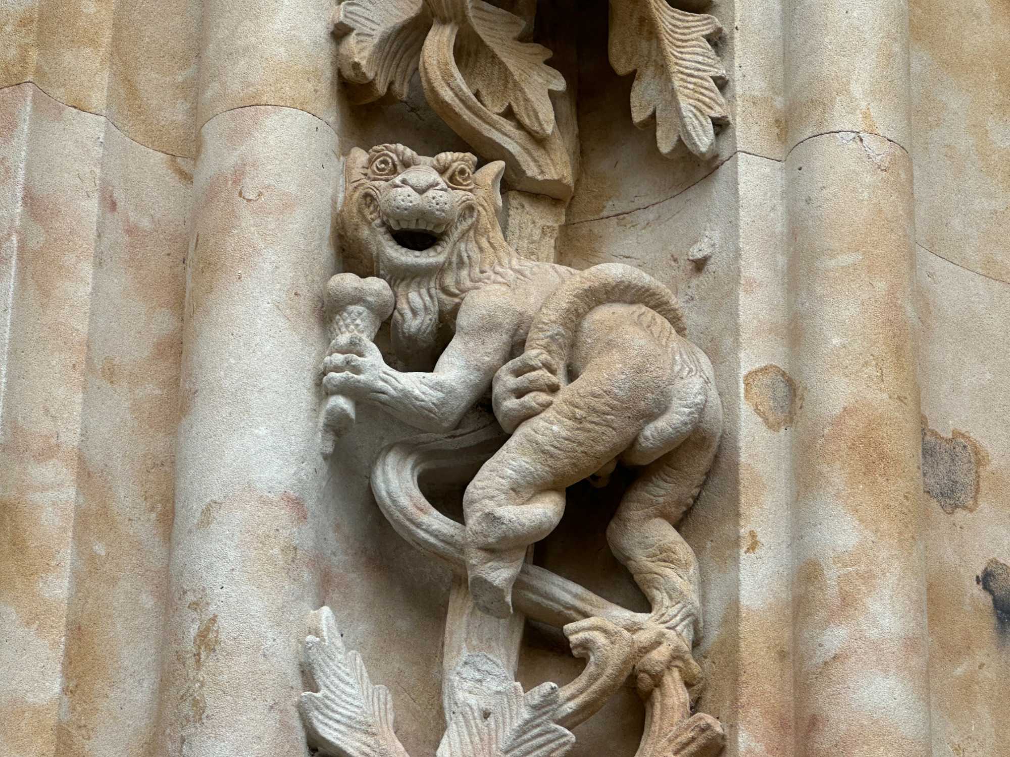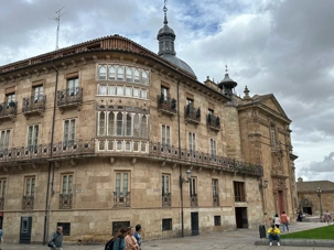 Nous partons à pied, en compagnie de notre guide qui en a beaucoup à dire, visiter la vieille ville. De la Place Mayor, très belle place centrale, nous marchons sur le Rua Mayor vers la cathédrale. Nous faisons de petits arrêts en chemin et notre guide nous donne des explications sur ce qu’on voit et aussi sur la culture de l’Espagne et de la ville. Nous visitons la célèbre université. Le bâtiment de l'université possède un somptueux portail sur lequel est sculpté le motif le plus célèbre de la ville : une tête de mort surmontée d'une grenouille (le symbole du péché de luxure puni après la mort). Pour les étudiants, apercevoir cette grenouille est signe de chance lors de leurs examens. Depuis un vestibule vitré, nous pouvons admirer la prodigieuse bibliothèque dont les rayonnages regorgent de manuscrits et publications antérieures au XIXe siècle.