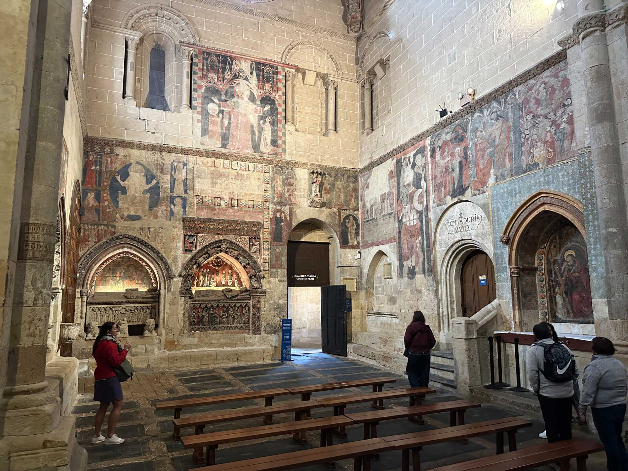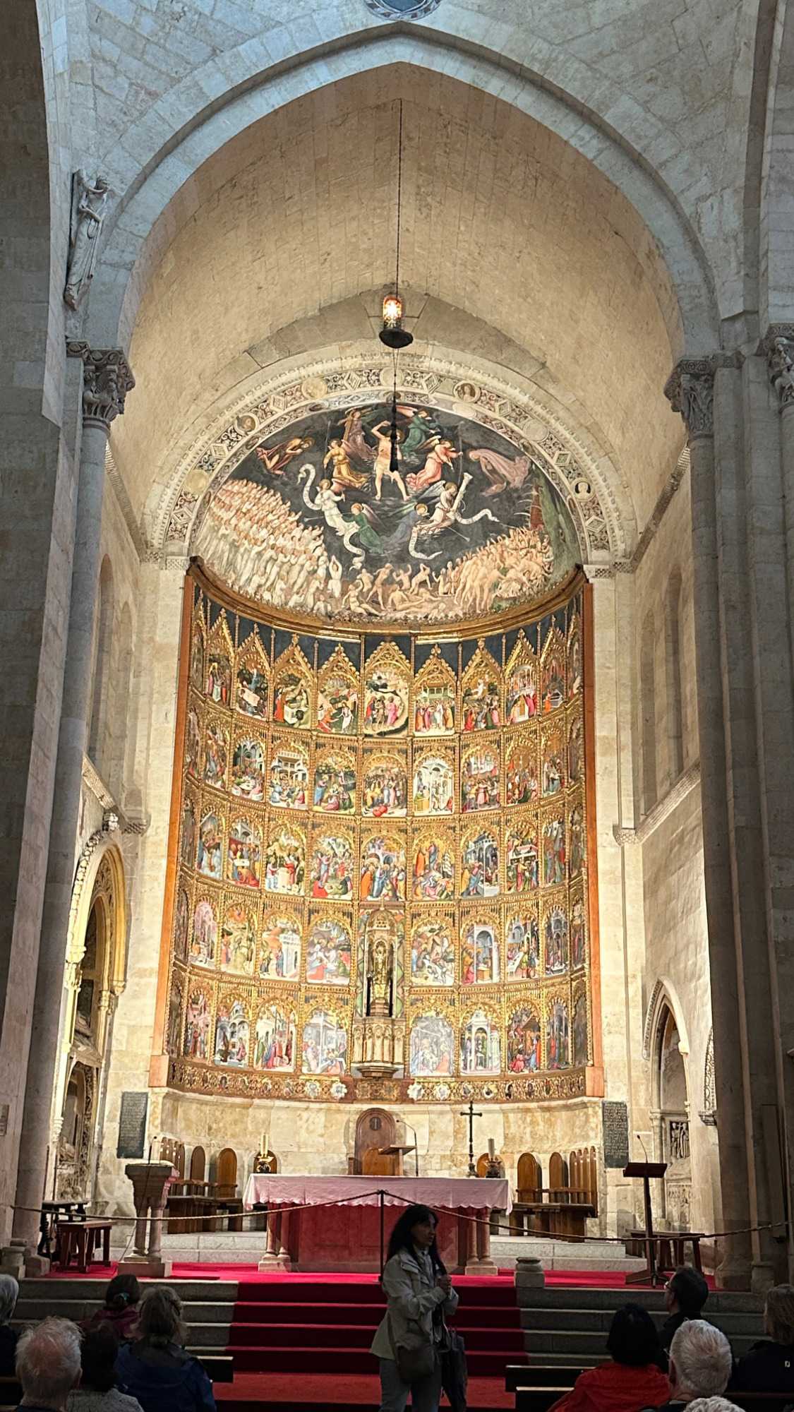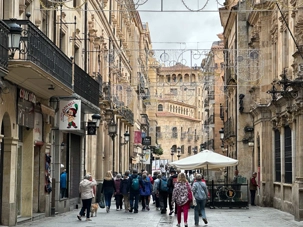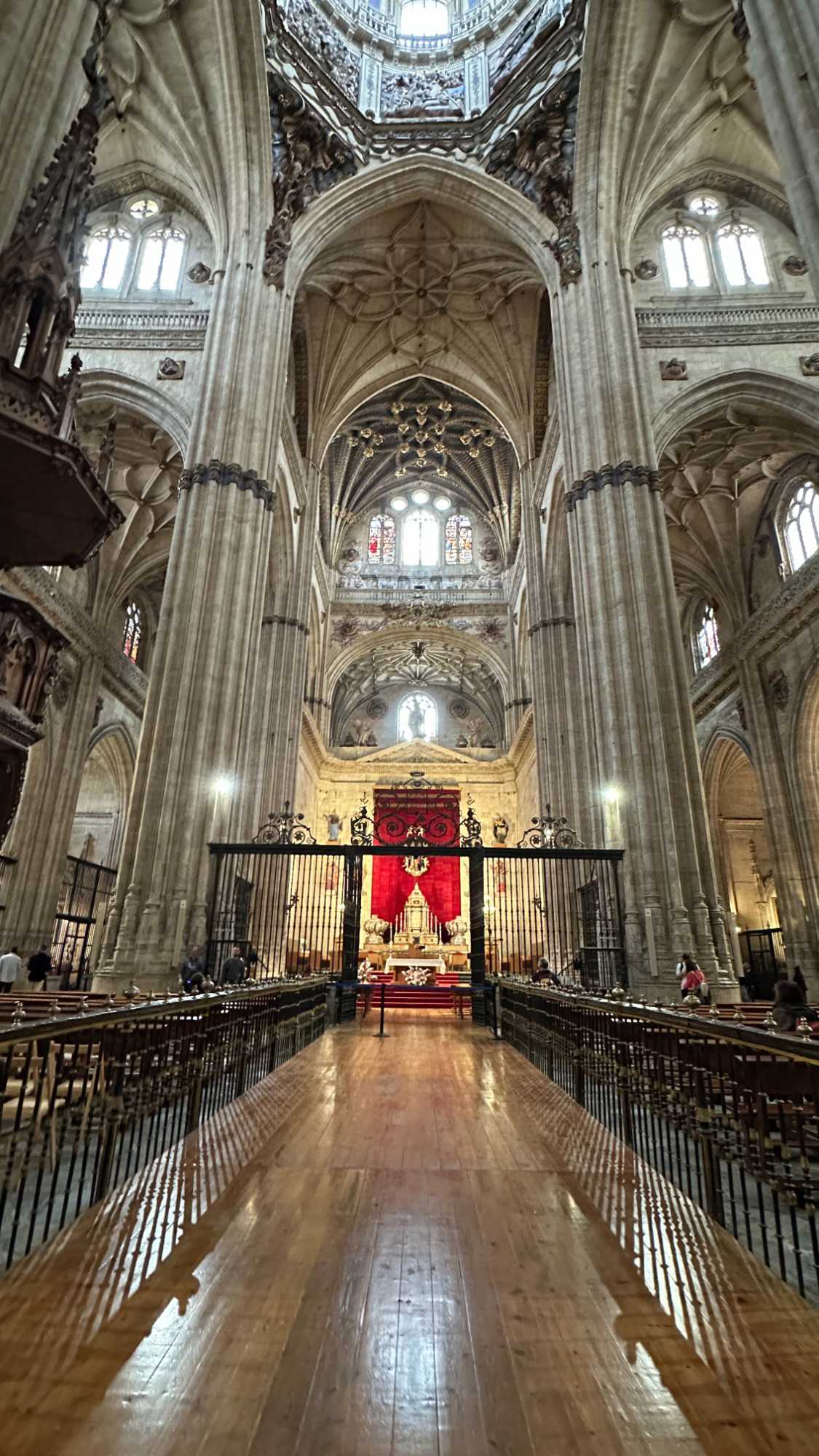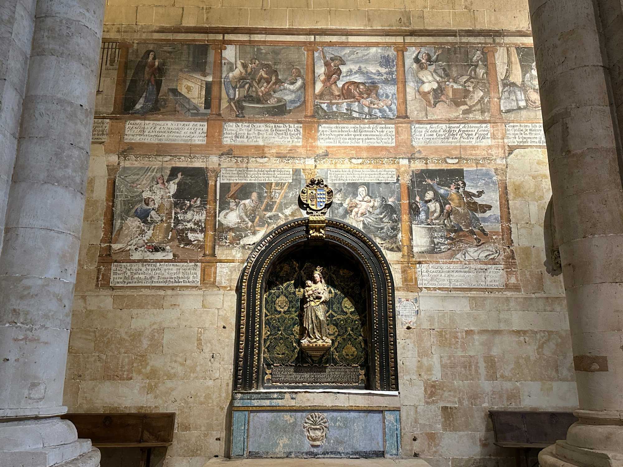 Nous partons à pied, en compagnie de notre guide qui en a beaucoup à dire, visiter la vieille ville. De la Place Mayor, très belle place centrale, nous marchons sur le Rua Mayor vers la cathédrale. Nous faisons de petits arrêts en chemin et notre guide nous donne des explications sur ce qu’on voit et aussi sur la culture de l’Espagne et de la ville. Nous visitons la célèbre université. Le bâtiment de l'université possède un somptueux portail sur lequel est sculpté le motif le plus célèbre de la ville : une tête de mort surmontée d'une grenouille (le symbole du péché de luxure puni après la mort). Pour les étudiants, apercevoir cette grenouille est signe de chance lors de leurs examens. Depuis un vestibule vitré, nous pouvons admirer la prodigieuse bibliothèque dont les rayonnages regorgent de manuscrits et publications antérieures au XIXe siècle.