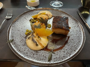 Poitrine de cochon de lait avec pommes de terre et oranges aux texture variée