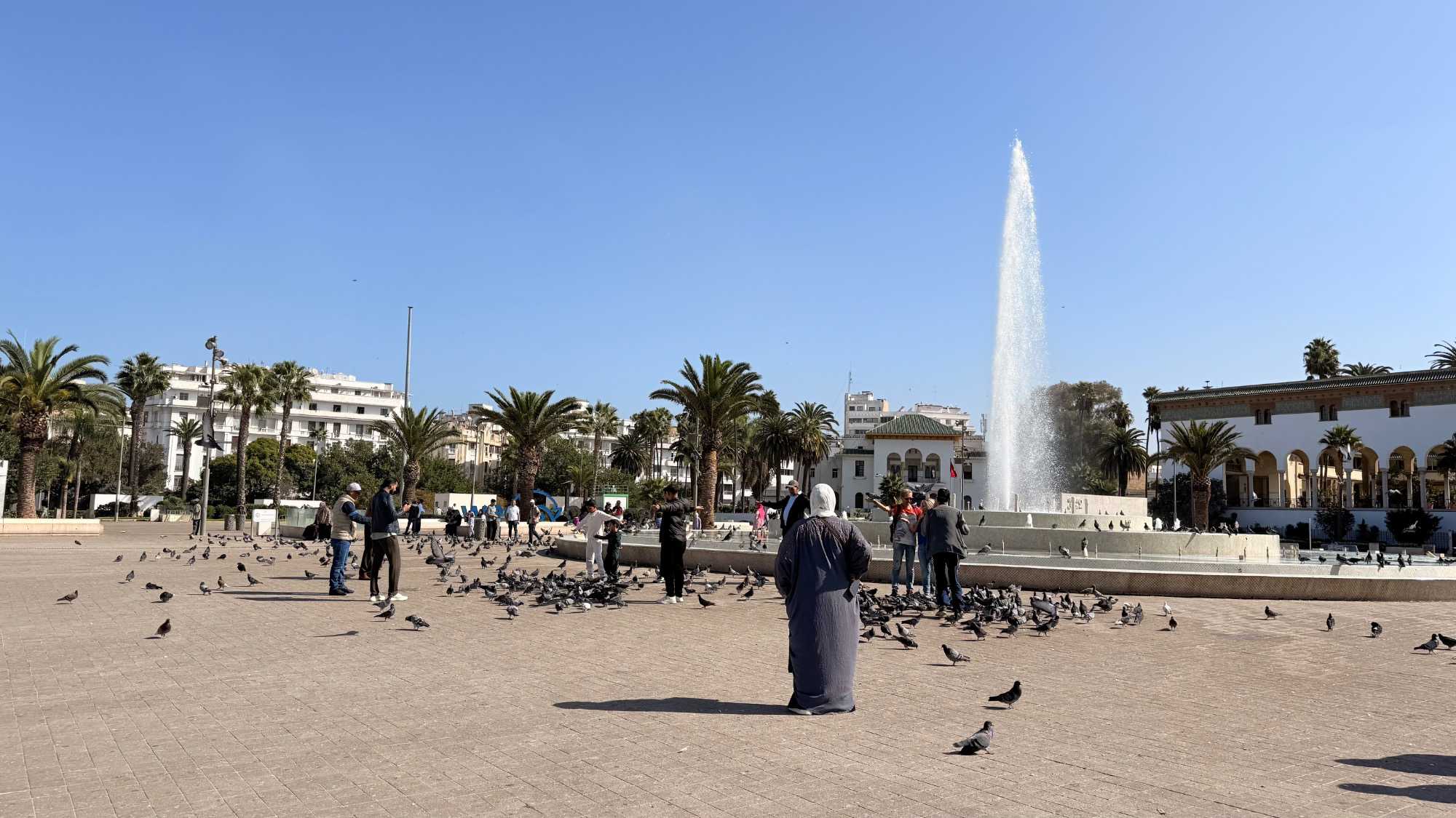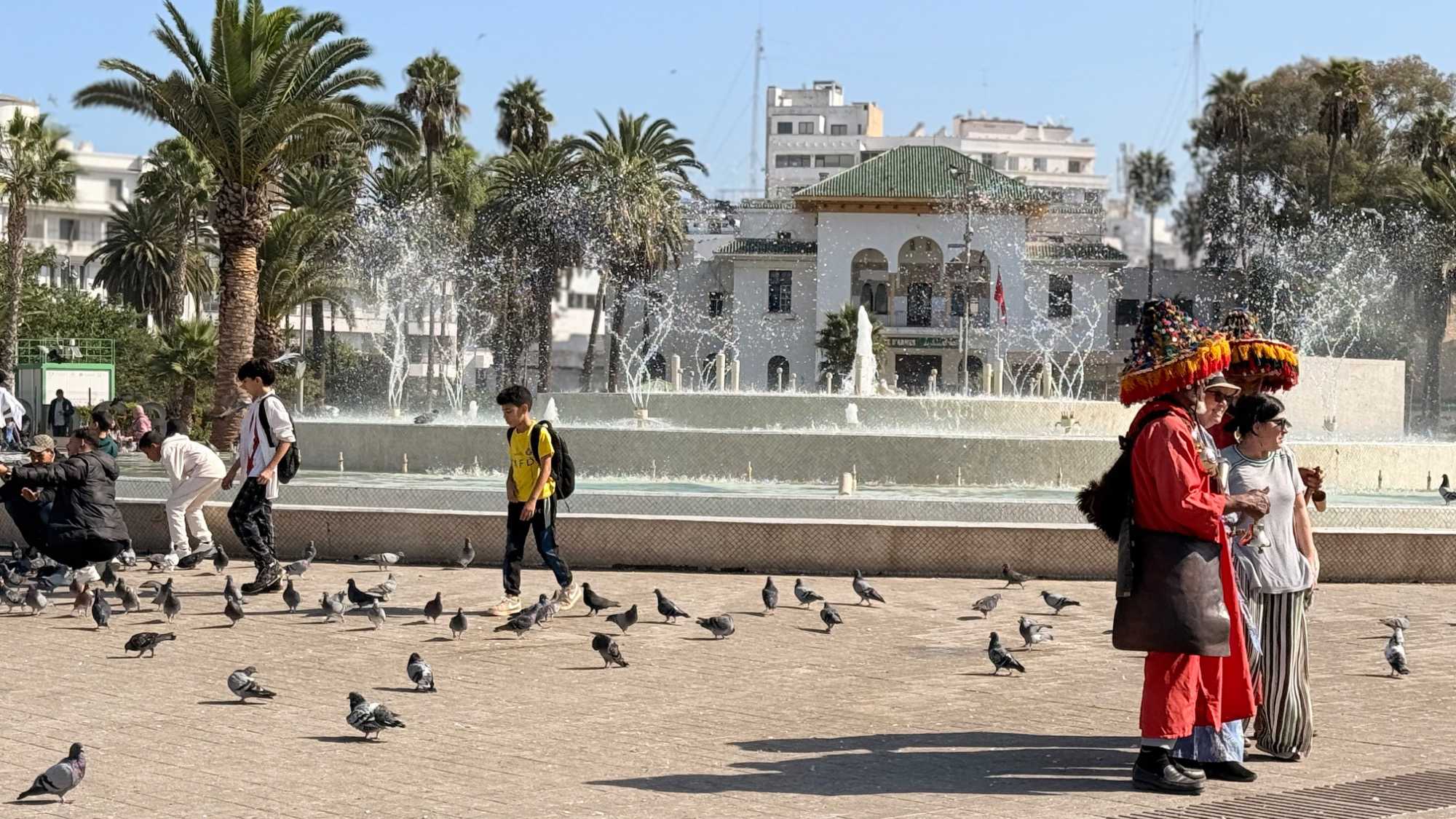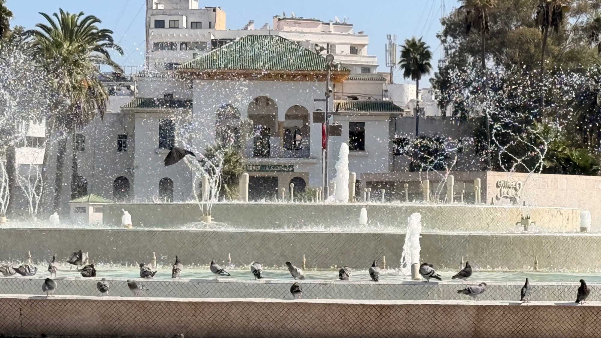 Les façades art déco y côtoient les arcades arabo-andalouses. La grande fontaine centrale, créée en 1976, projette ses jets d’eau au rythme de la musique : un spectacle féérique qui émerveille les passants.