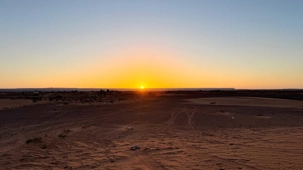 Face à l’horizon, la lumière commence à filtrer à travers le ciel encore sombre. Peu à peu, les ombres dansent sur les dunes dorées, les crêtes s’embrasent d’un feu doux, et le désert semble respirer au rythme du jour naissant.