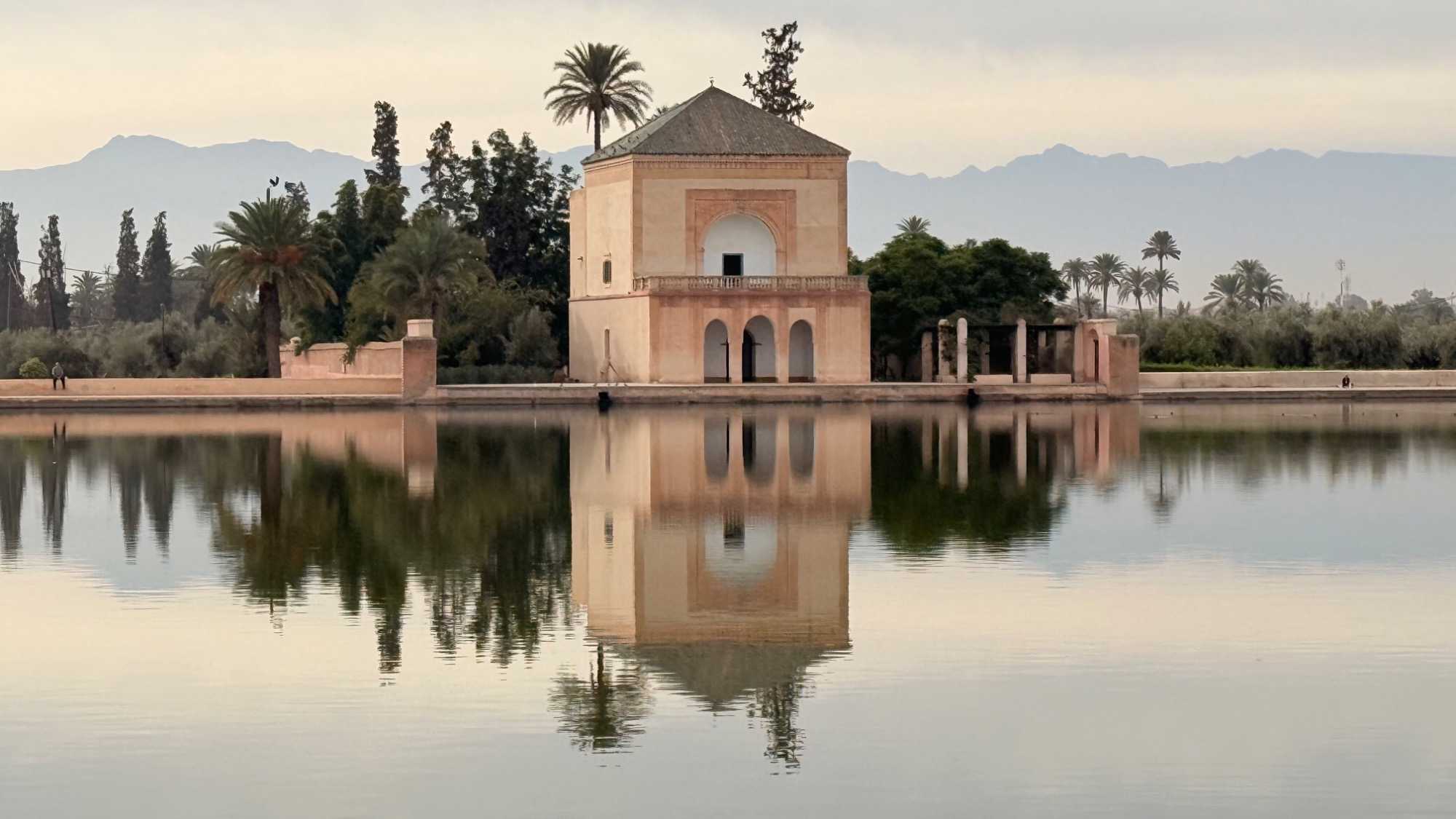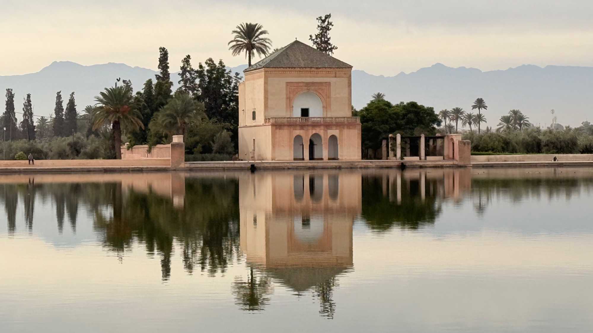 Au cœur d’un vaste champ d’oliviers centenaires, un immense bassin d’eau douce, alimenté par un ingénieux système d’irrigation venant des montagnes, reflète la silhouette d’un pavillon saadien construit au XVIᵉ siècle.