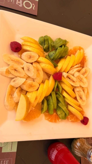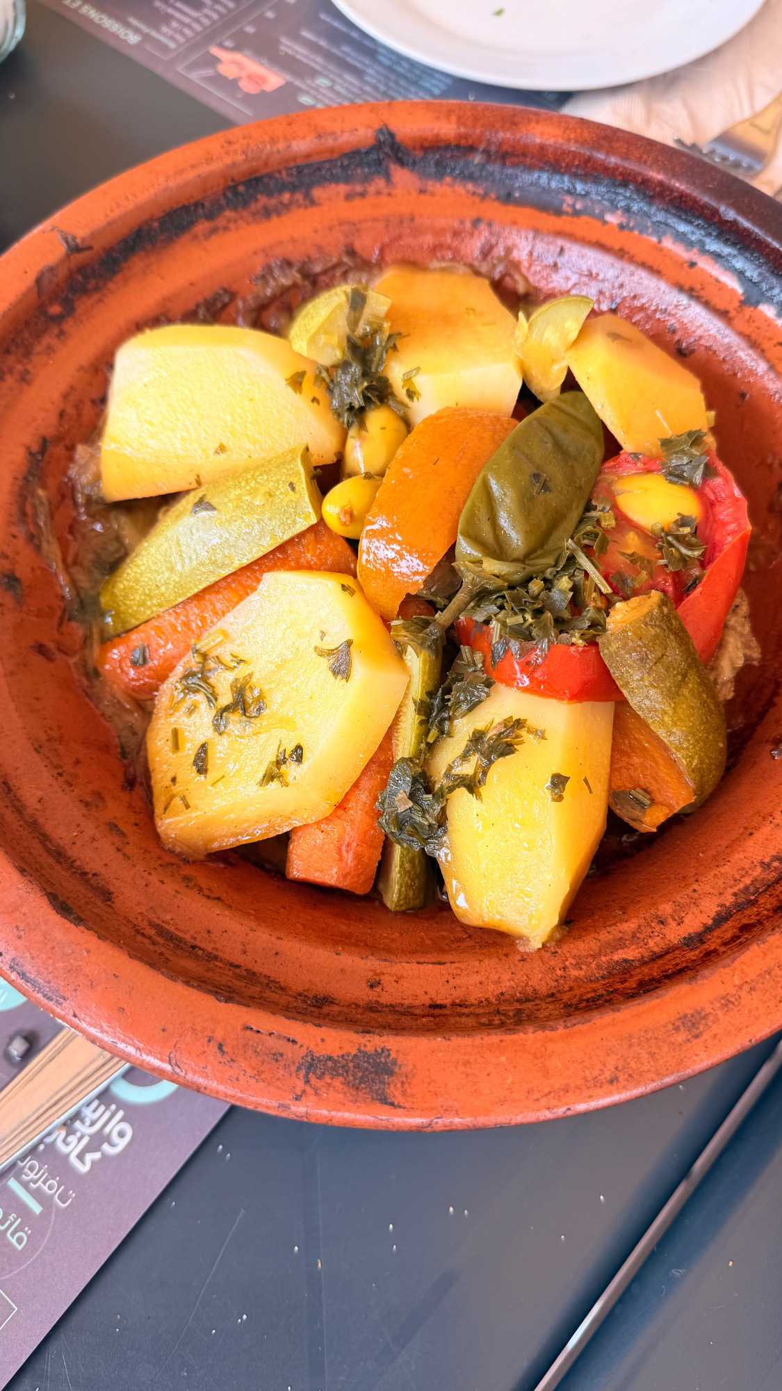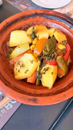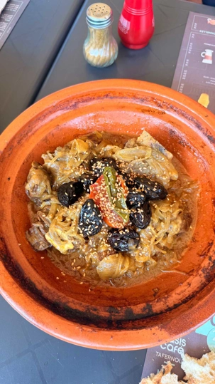 Nous savourons un bon dîner typique : tajine de poulet aux olives et citron, pruneaux, et — pour les Québécois que nous sommes — quelques frites en accompagnement !
