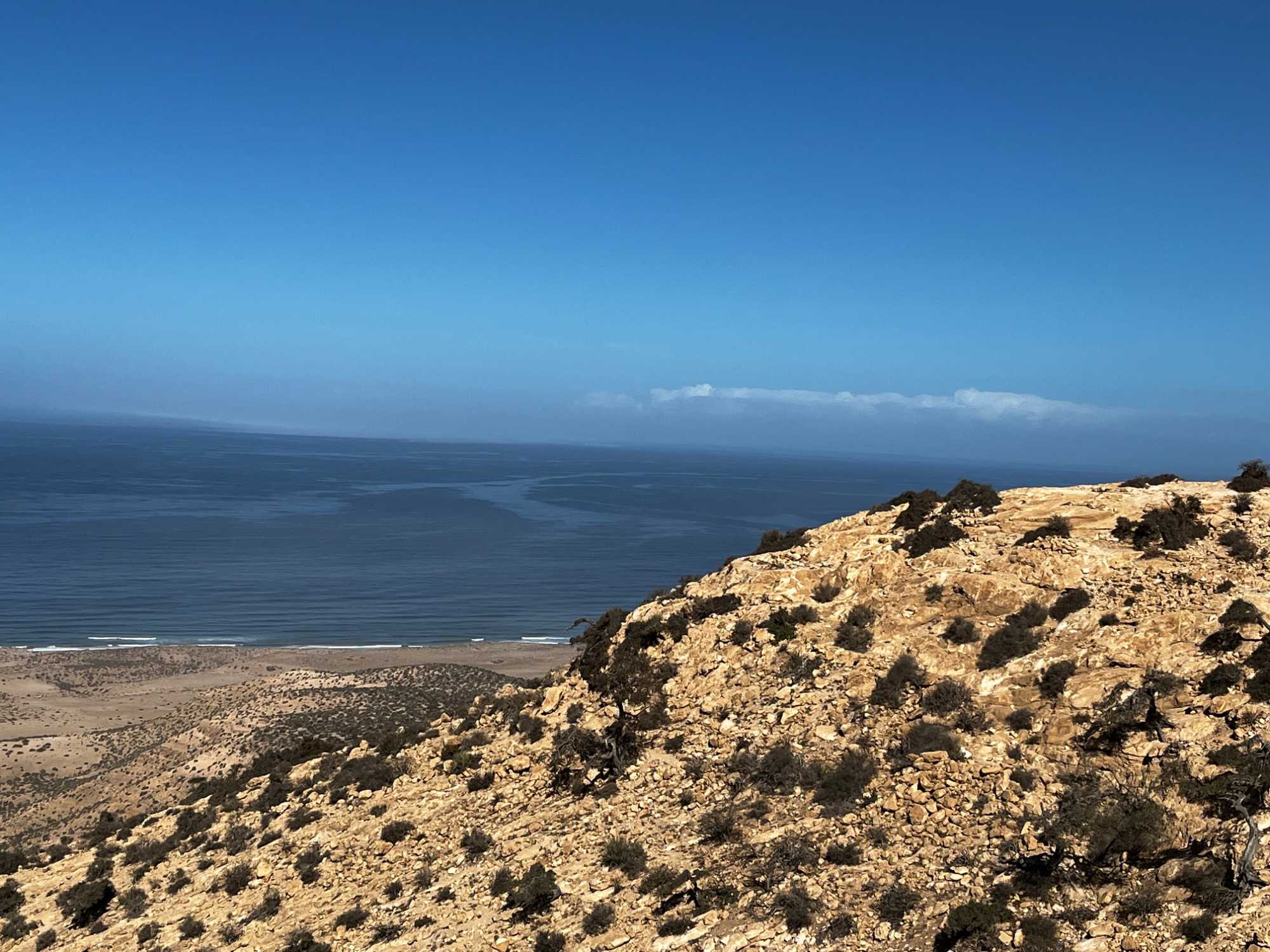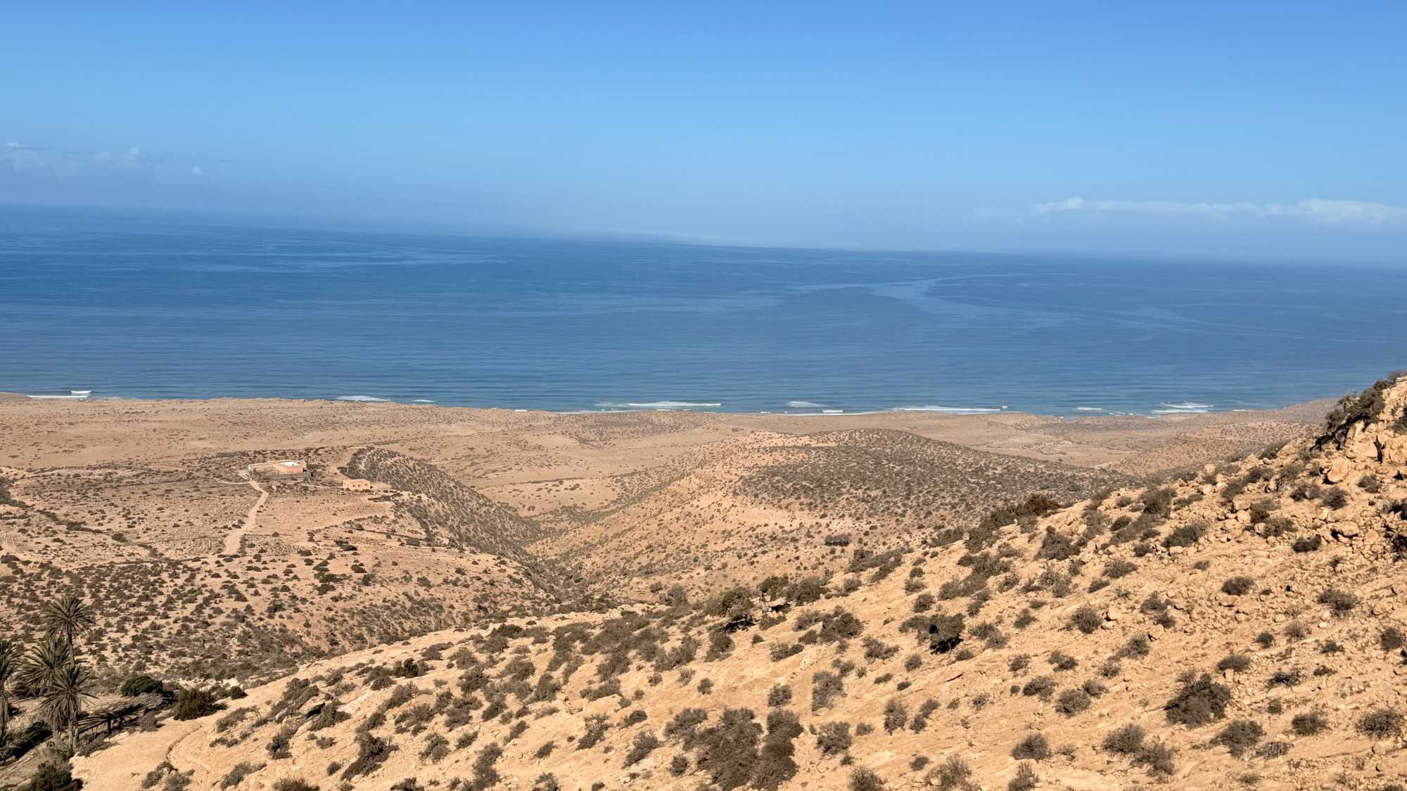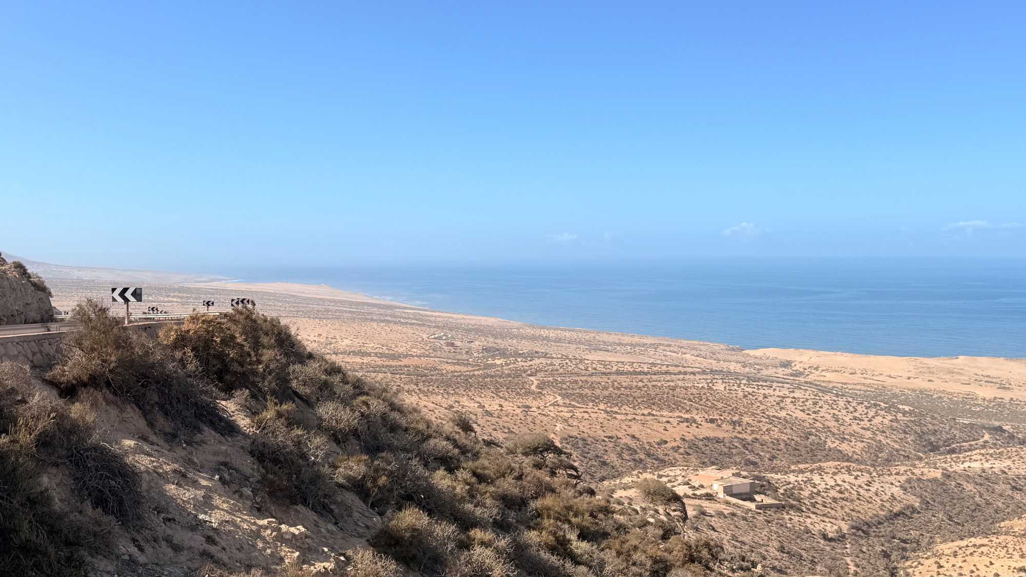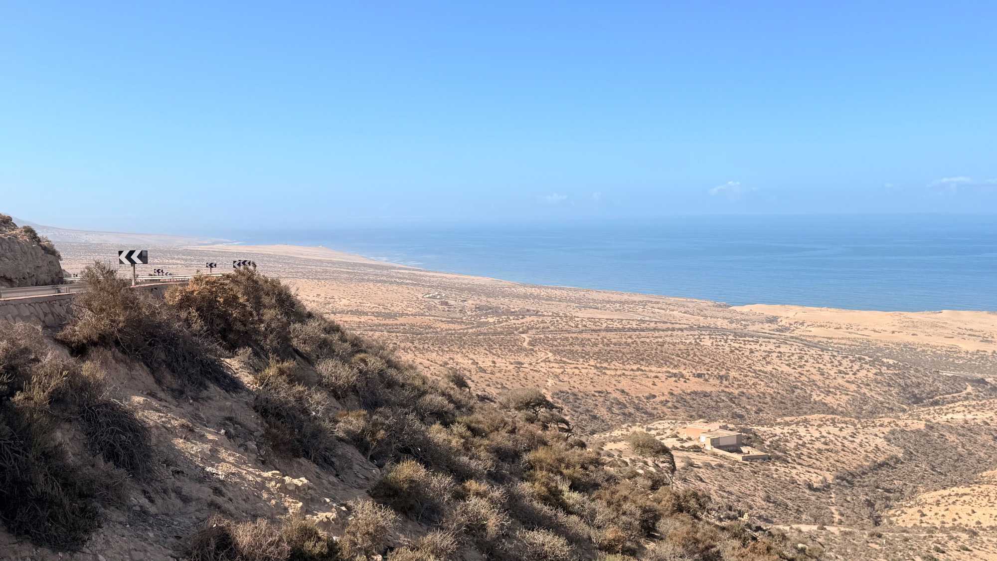 La route vers Agadir se dessine entre ciel et mer, alternant paysages océaniques et plateaux arides ponctués d’arganiers.