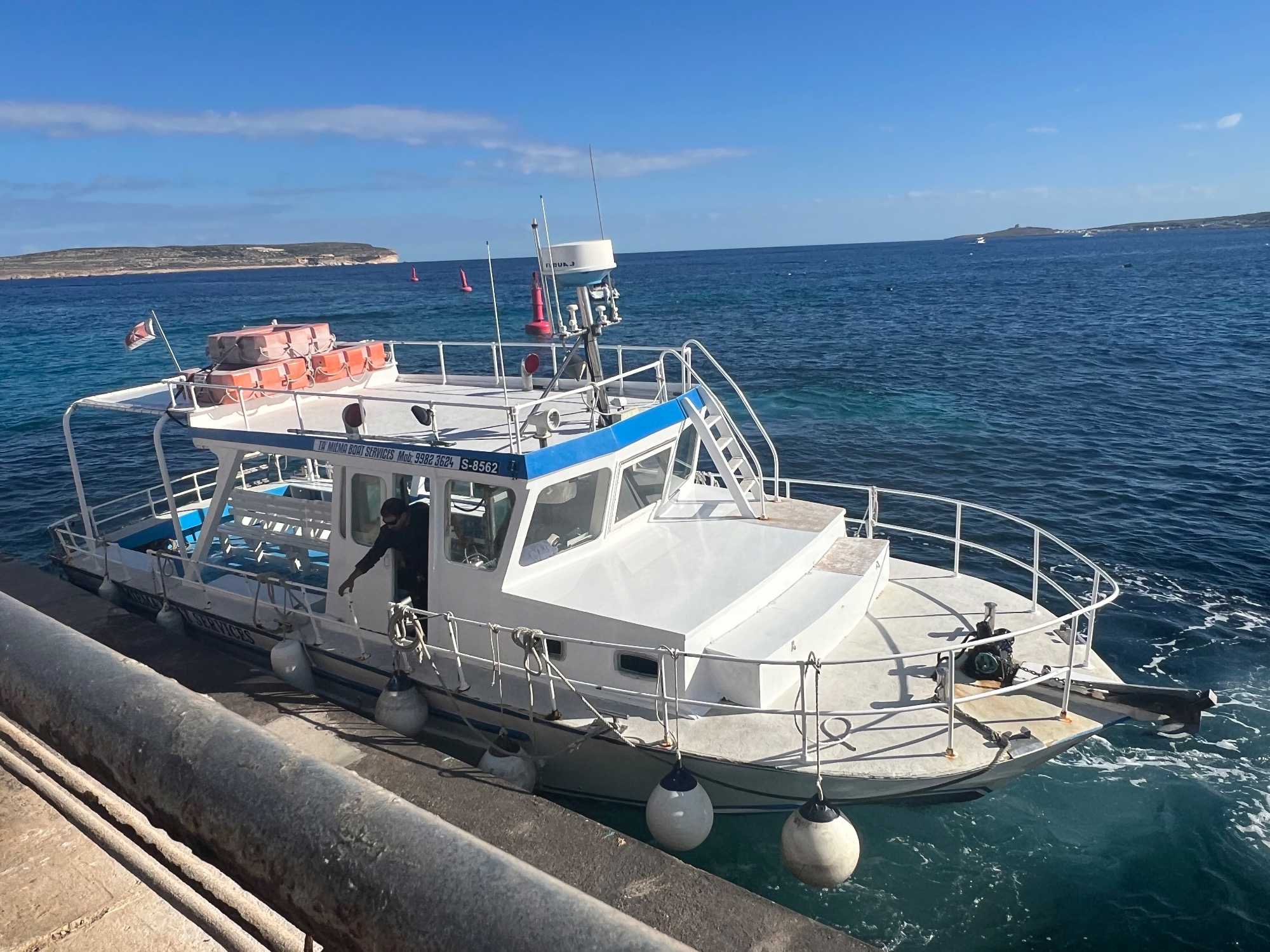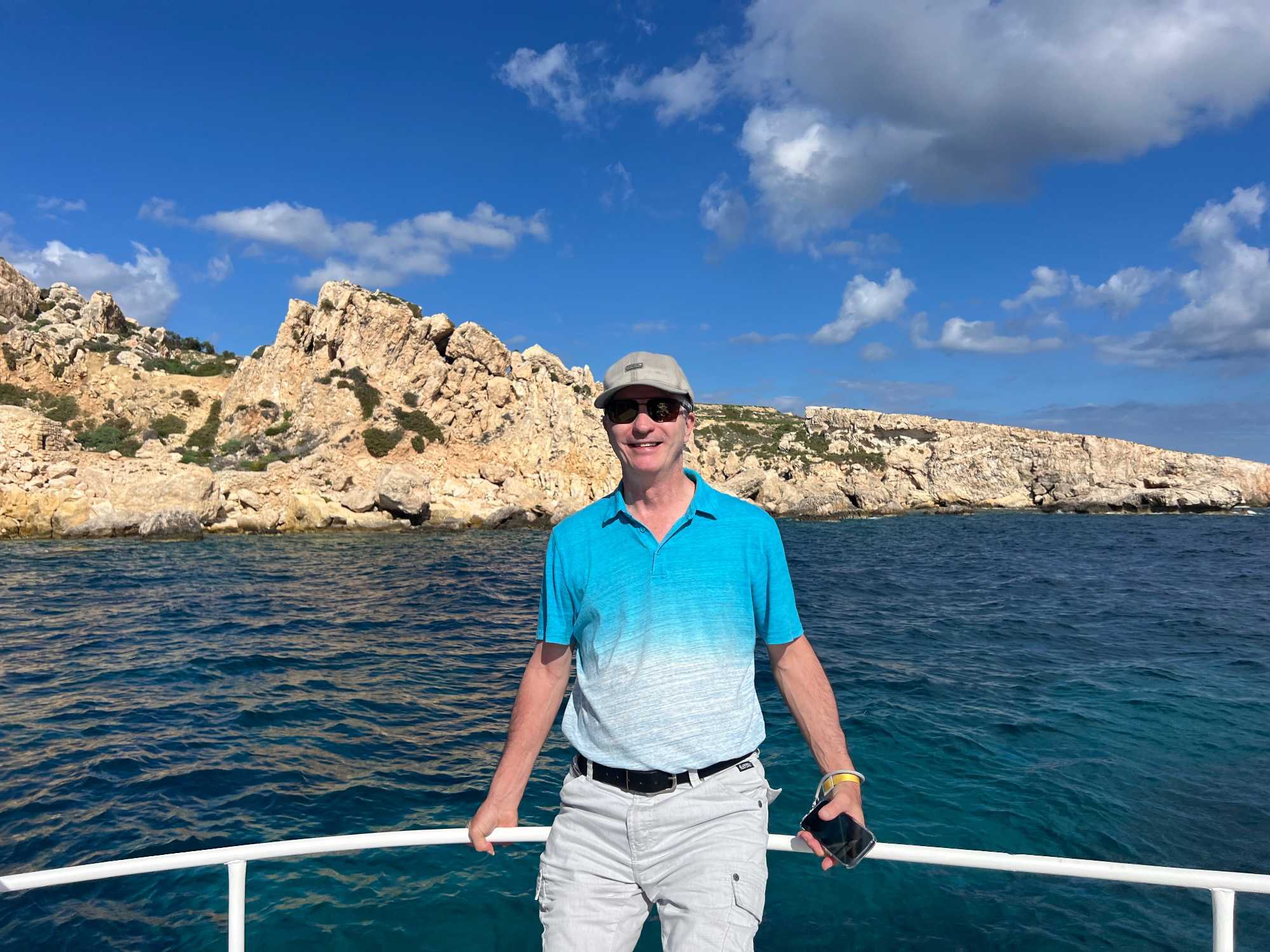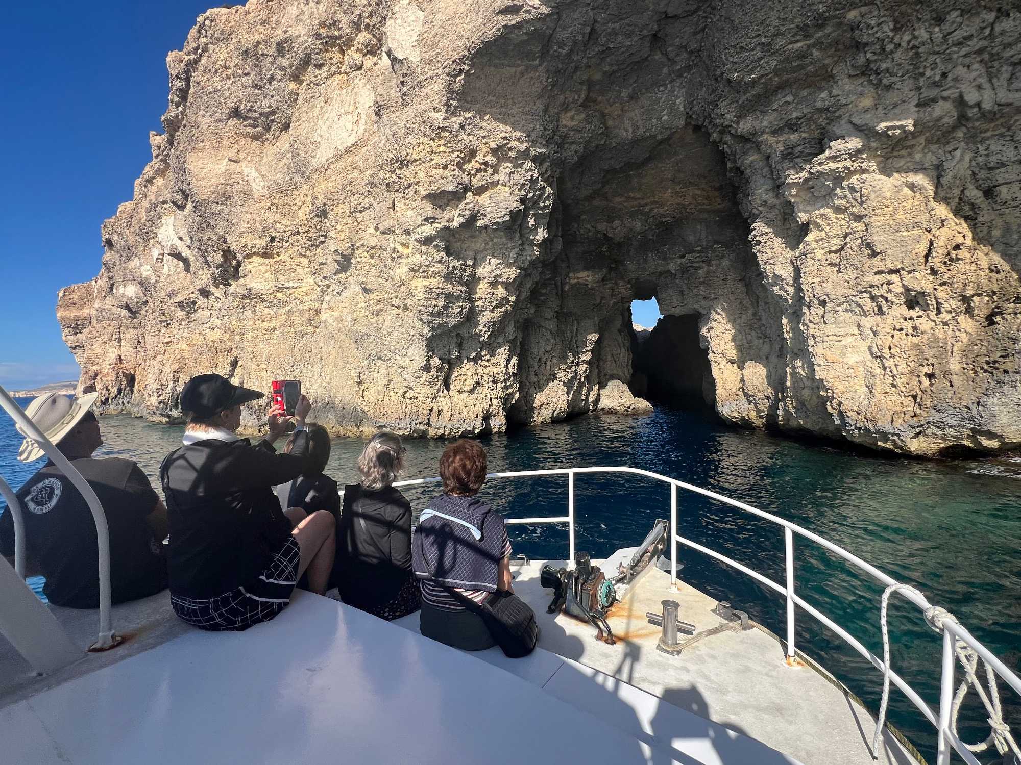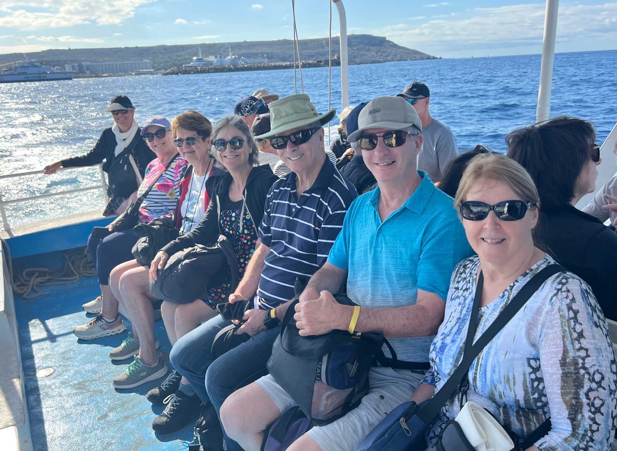 Nous sommes 20 à avoir pris une excursion pour nous rendre sur l’île de Comino. C’est avec l’aide de Chantal et de Pierre P que nous avons réussi à nous dénicher un bateau privatisé pour une durée de 4 heures. C’est sous un magnifique soleil que nous partons avec des taxis (Bolt) qui nous amènent en petits groupes jusqu’au port de Cirkewwa, où nous sommes allés hier.