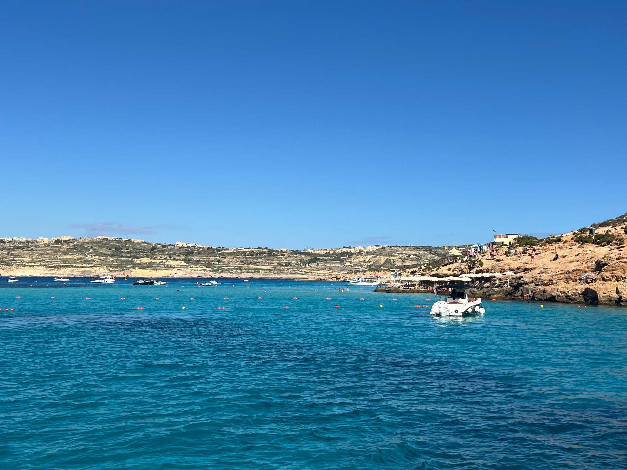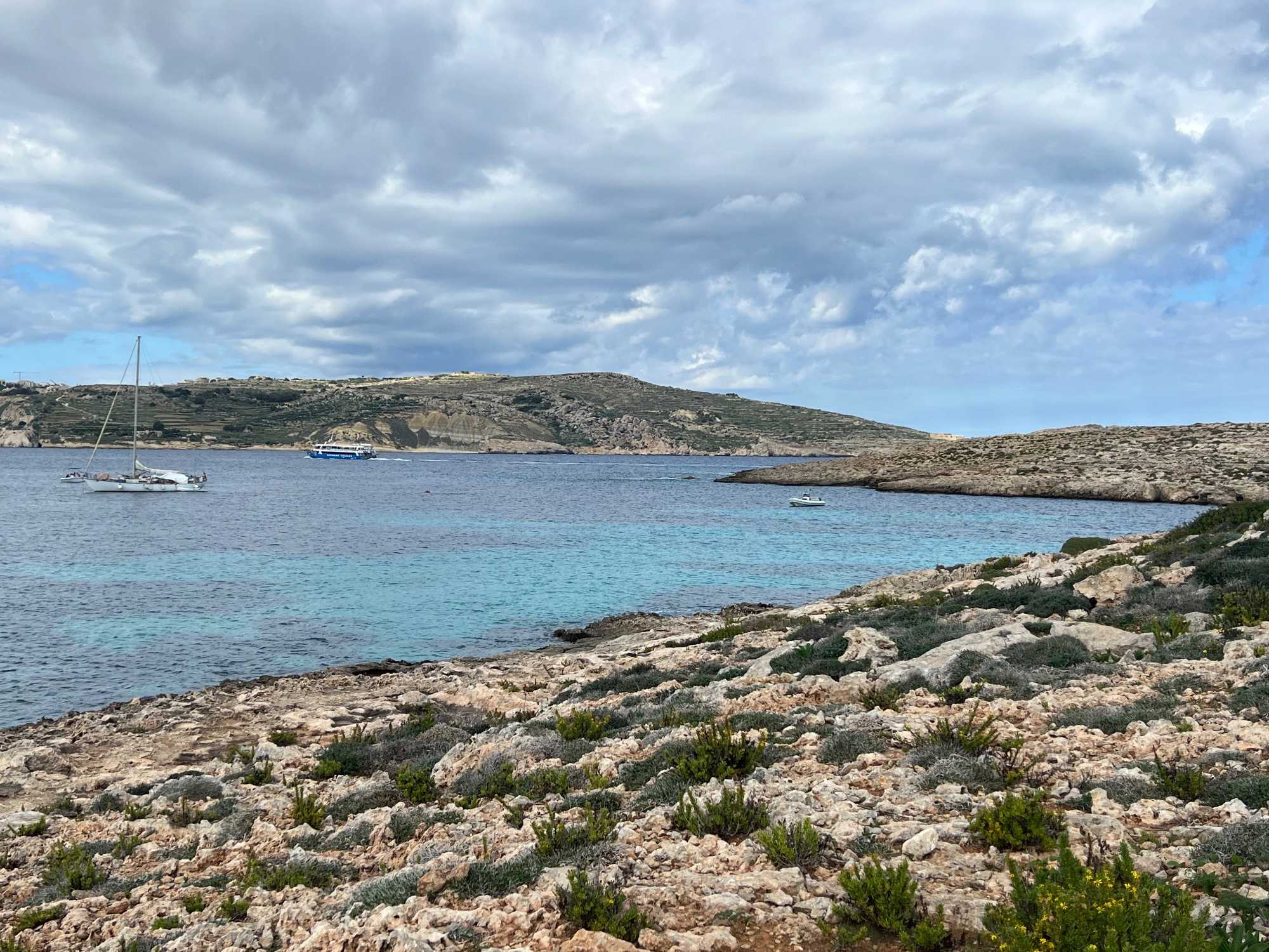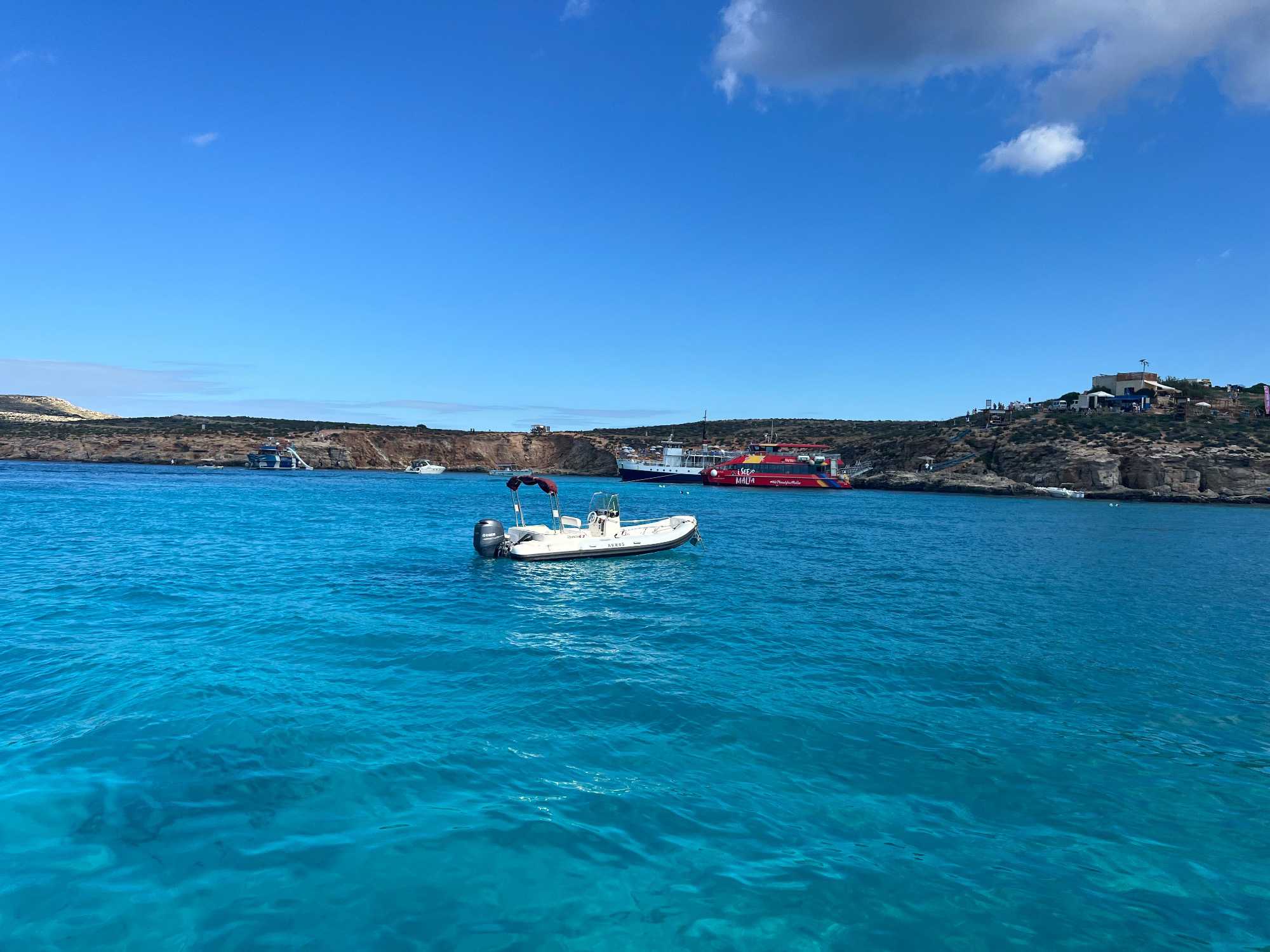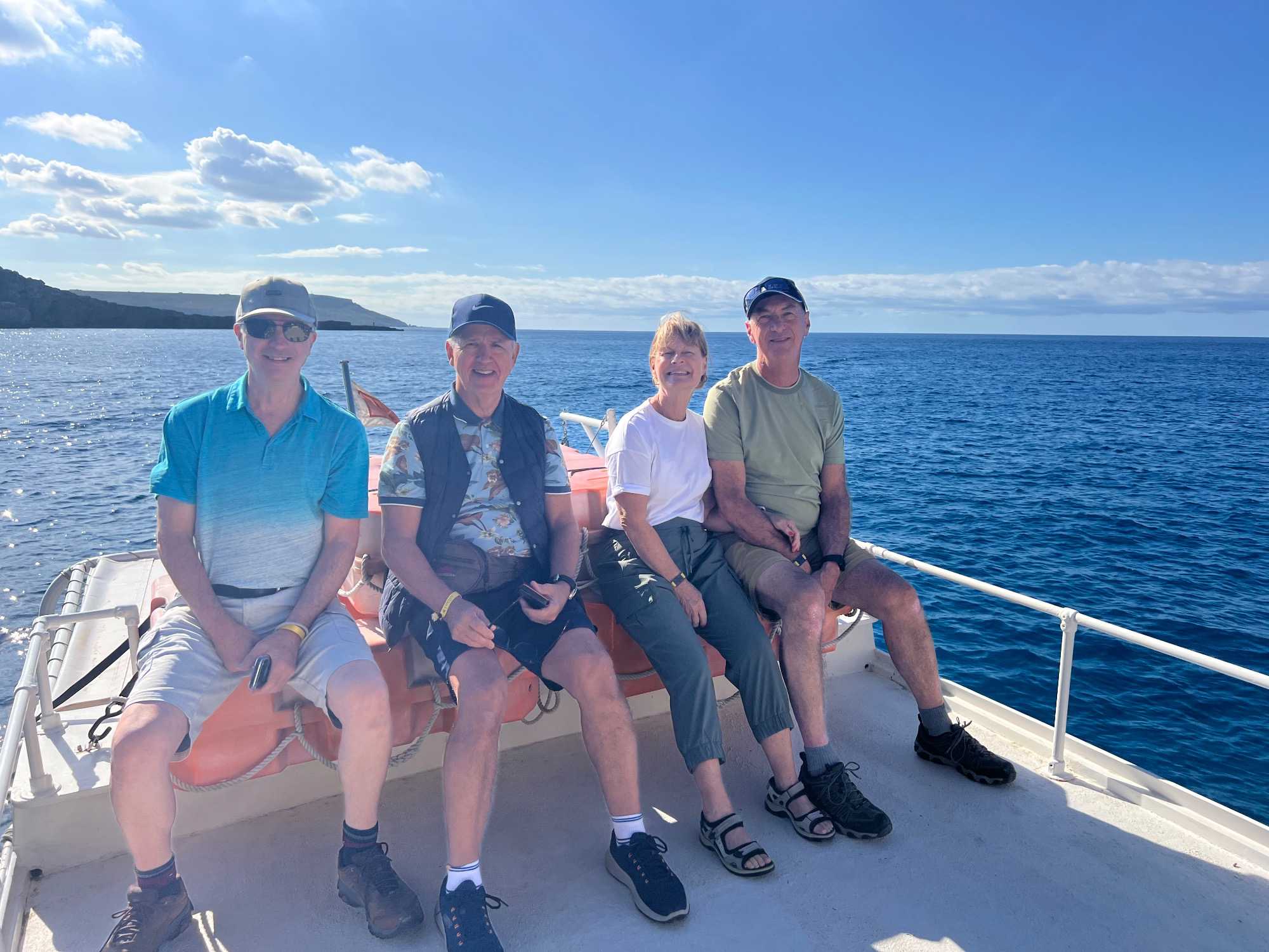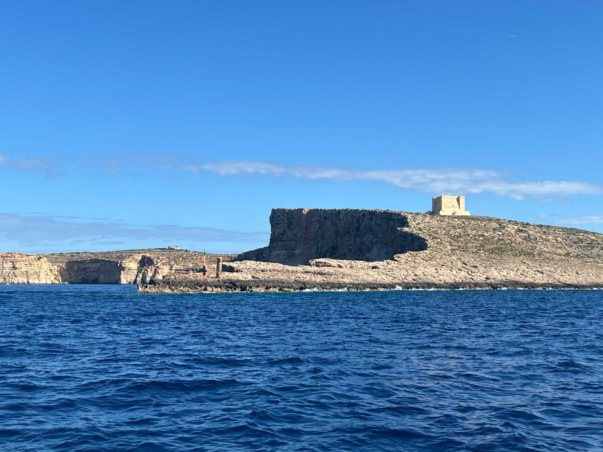 Nous sommes 20 à avoir pris une excursion pour nous rendre sur l’île de Comino. C’est avec l’aide de Chantal et de Pierre P que nous avons réussi à nous dénicher un bateau privatisé pour une durée de 4 heures. C’est sous un magnifique soleil que nous partons avec des taxis (Bolt) qui nous amènent en petits groupes jusqu’au port de Cirkewwa, où nous sommes allés hier.