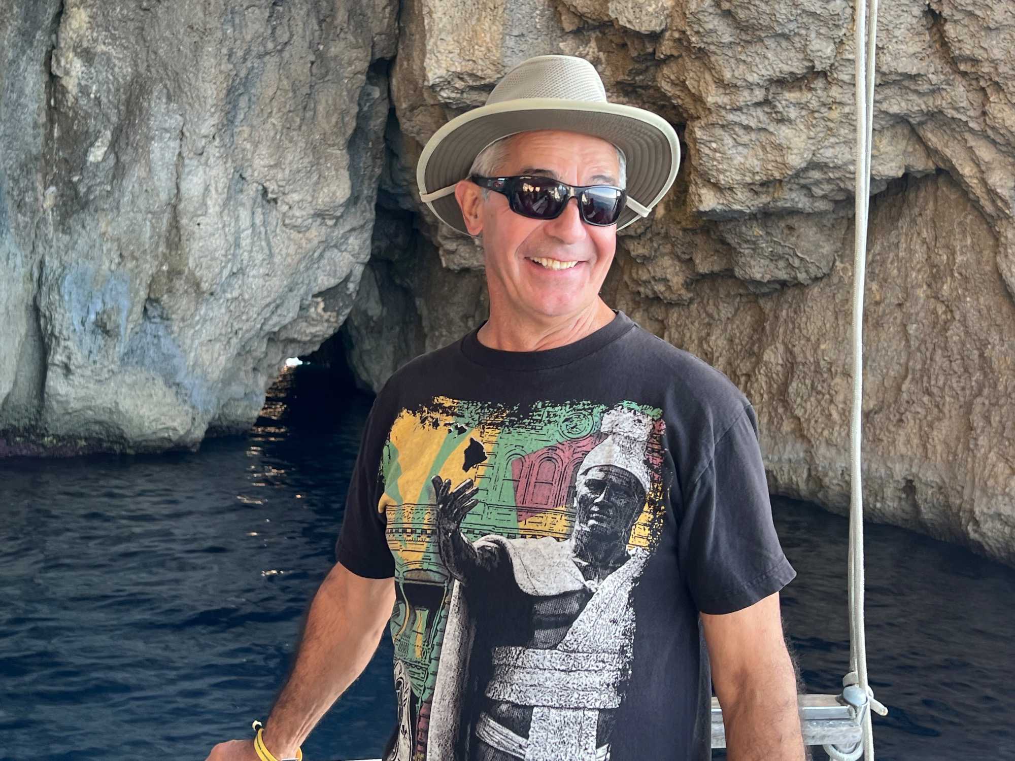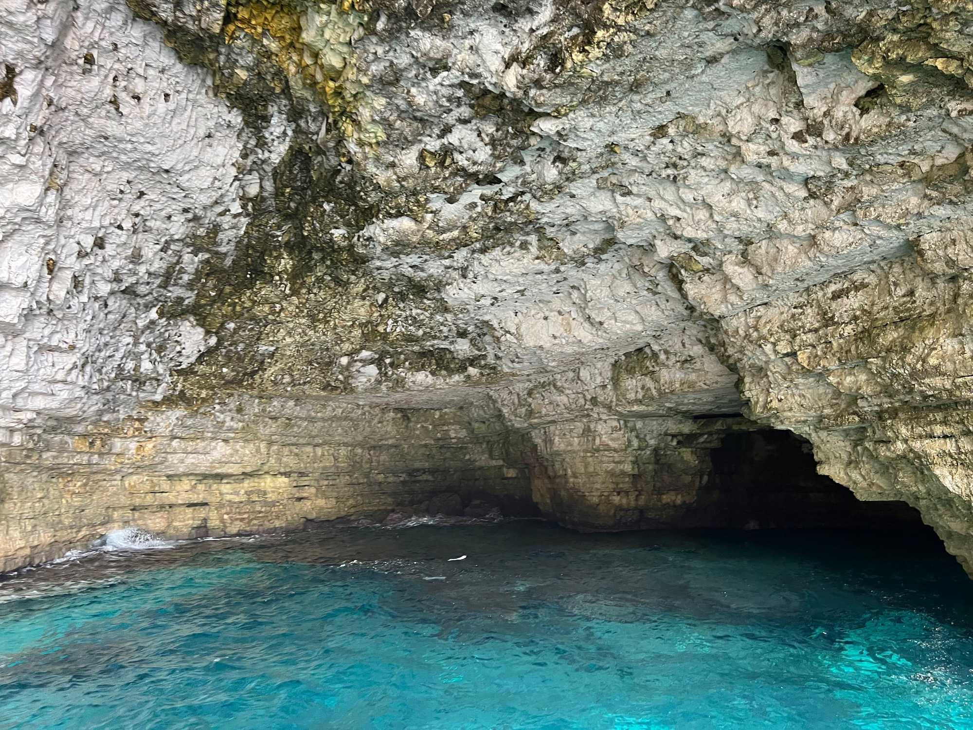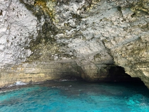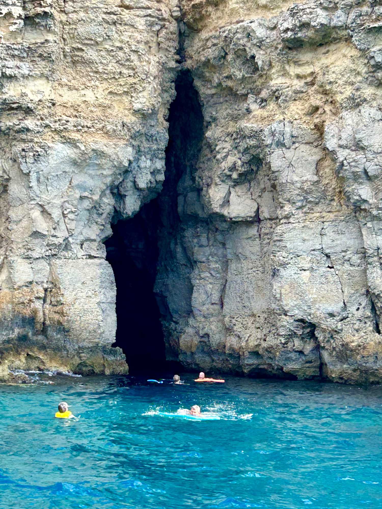 On rembarque à bord et le skipper fait juste contourner un rocher et nous amène près d’un tunnel: quelqu’un s’y baigne et ça passe de bord en bord. Alors je demande qui vient y nager avec moi? Et nous sommes 6 qui sautons à l’eau. Ça n’a pas été facile au début car un gros bateau venait de passer pas très loin et nous avions de bonnes vagues. Mais une fois rendus dans le tunnel, nous avons eu un plaisir fou. Encore une fois, que du bonheur! Le retour à notre bateau a été plus facile car il s’est rapproché de nous.